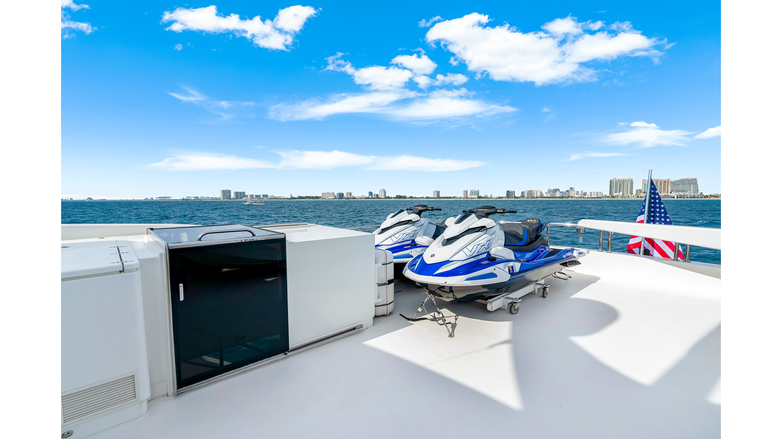 Recent Services and Upgrades: • Spot Zero watermaker and purification system • Flybridge granite countertops replaced (2020) • Exhaust risers and heat blankets replaced (Port 2021 / Starboard 2023) • Steering rams and hydraulic hoses serviced (2023) • Dripless shaft housings and seals replaced (2023) • New teak decking on swim platform and cockpit steps (2023) • New Release Marine aft deck tables (2021) • Garmin 22” flybridge display (GPSMAP 8622) • Naiad stabilizer fins rebuilt (2023) • Boston Whaler 150 Super Sport with 60HP Mercury Outboard • Yamaha 11' Jetskis • Fusion Stereo on flybridge with JL speakers