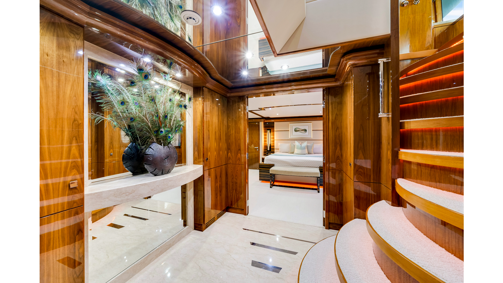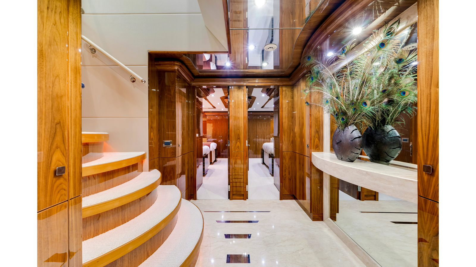 The stair descending to the guest area was designed to have an easy and open feeling. The entrance at the top of the stairs is open to the Starboard Hallway, and has a small balcony and open railing of art glass and stainless steel. As you approach the lower foyer, the stairs open up from 36” wide to 54” and the last few steps create a large semi-circle and grand entrance to the foyer. The stairs are perfectly centered on the mirrored console top with a thick 5” slab of Cream Kaduna surrounded by mirror. On top of the console is a fabulous sculpture that reflected in the mirror. The foyer floor is a beautiful composition of Marble with a contemporary design of stainless strips inlayed. All four corners of the foyer supply storage; linens, towels, refrigeration and beverages and cleaning supplies.