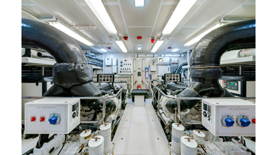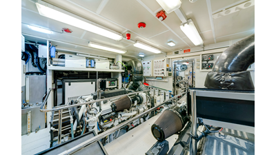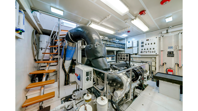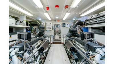 Powered by twin Caterpillar C32 engines , the yacht cruises comfortably at approximately 12 knots, with a top speed of 16 knots . Her semi-displacement hull form delivers an ideal balance of efficiency, range, and performance, ensuring dependable operation across a variety of sea conditions.