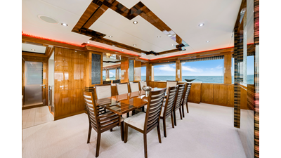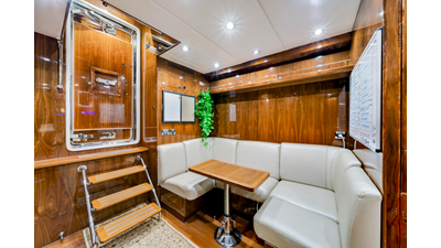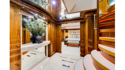 The objective for this project was to create a contemporary interior with great balance, clean, sophisticated cabinetry lines with an enduring appeal; for charter or private use. The combination of contrasting surfaces of Gloss Walnut wood, Espresso and Taupe Zebra veneer accents, Sculptured glass and Cream Kaduna Marble (Royal Oyster) creates an abstract and sculptural impression that is truly refreshing. All the guest and social areas are generously proportioned and are perfectly appointed.