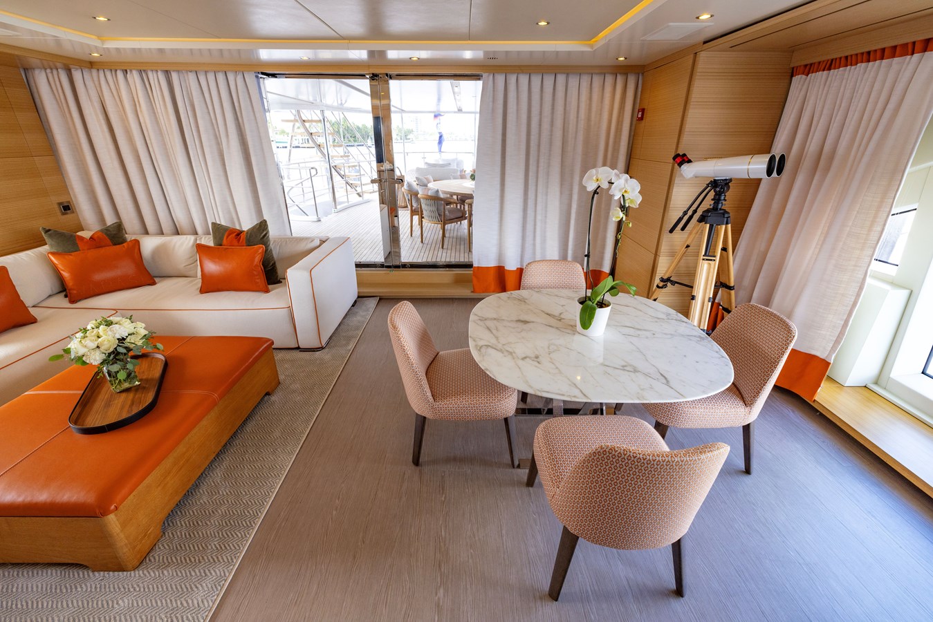 Inside, designer Kimberly Pucci’s 2026 refit brings lightness and confidence to the space. Chic and contemporary, the interiors are accented by a signature burnt orange colour—a deliberate nod to the owner’s alma mater, the Texas Longhorns. Expressive, without being loud. Floor-to-ceiling windows flood the saloon with natural light, framing the horizon wherever she drops anchor.