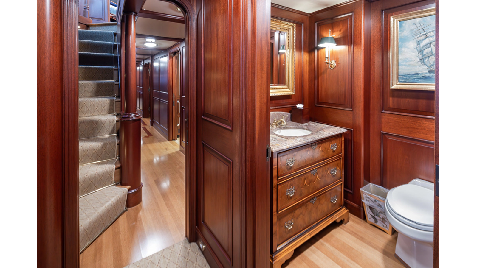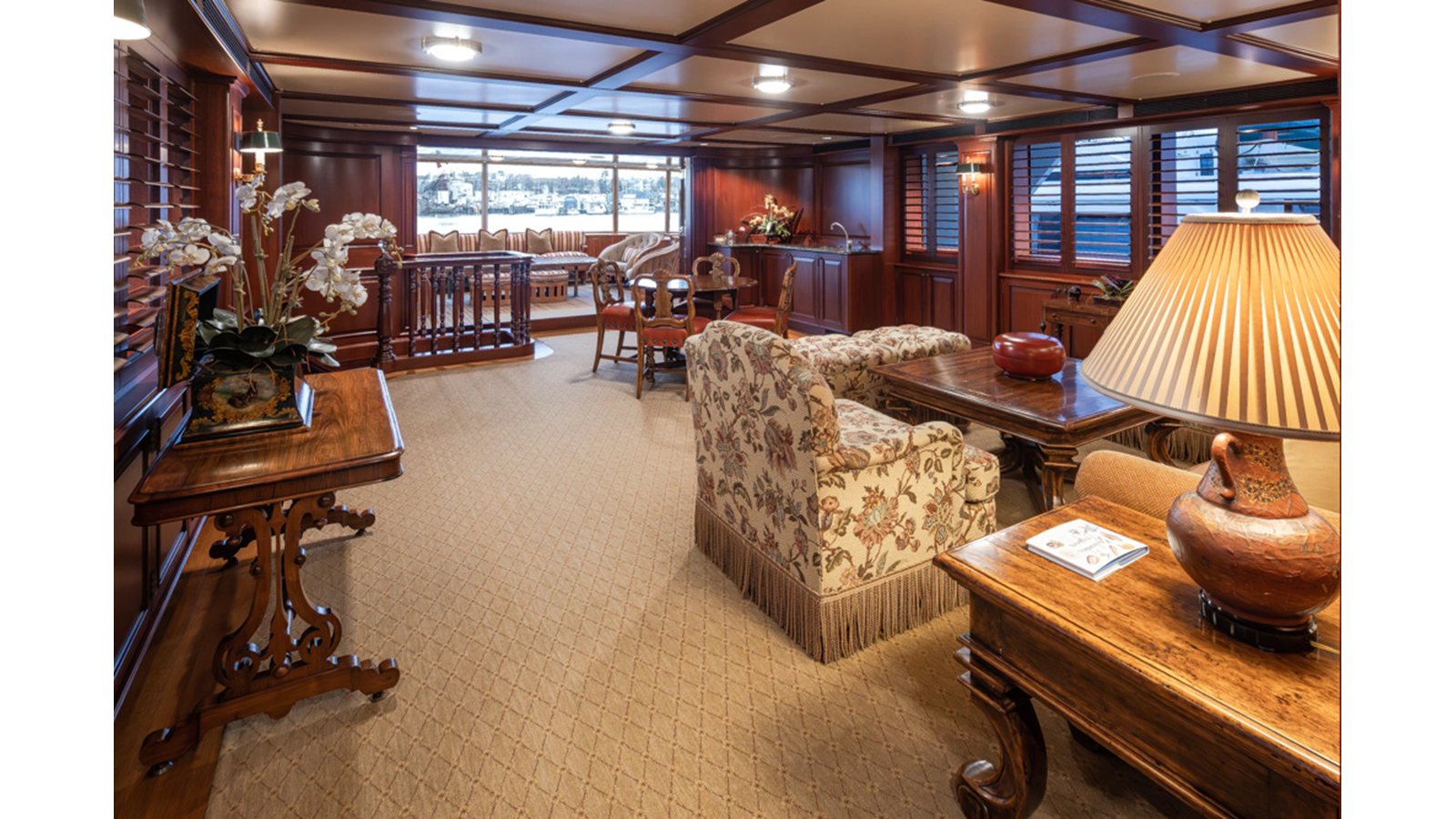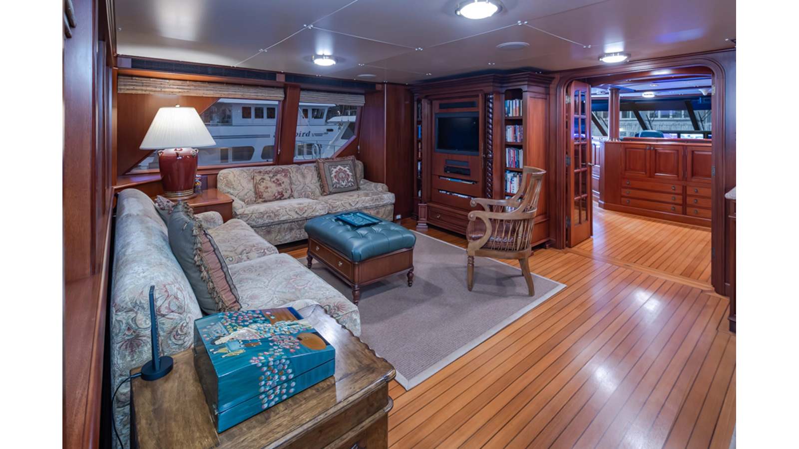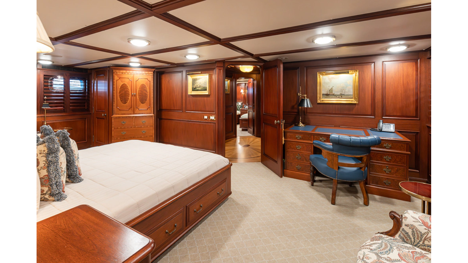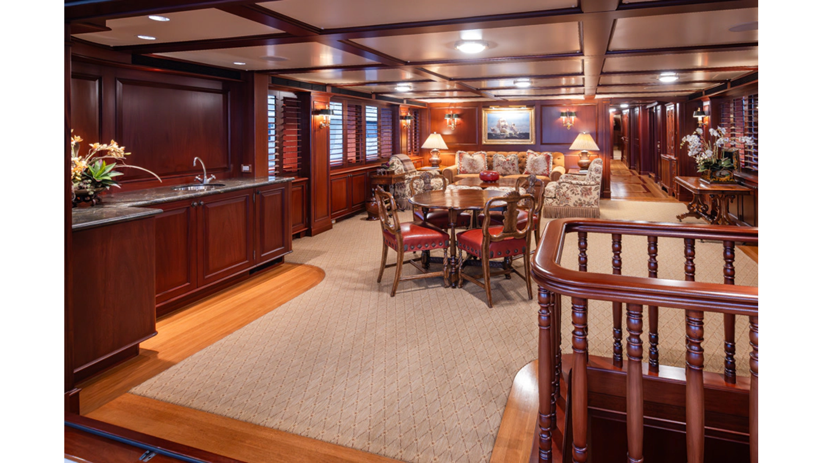 Uncommon in today's marketplace, MARLINDA was designed for relaxed, private cruising rather than large charter-style gatherings. Her beautifully crafted mahogany interior showcases timeless American worksmanship throughout. Guests are welcomed aboard via the main deck aft into a gracious salon featuring a bar to port - ideal for entertaining. Forward lies the formal dining area with convenient access to a spacious, professionally designed galley on the port side. To starboard forward is a day head and an extensive library, offering flexibility to be converted into an on-deck owner's suite if desired. Below deck, accommodations for six guests in two generous staterooms, along with a full-beam master suite.