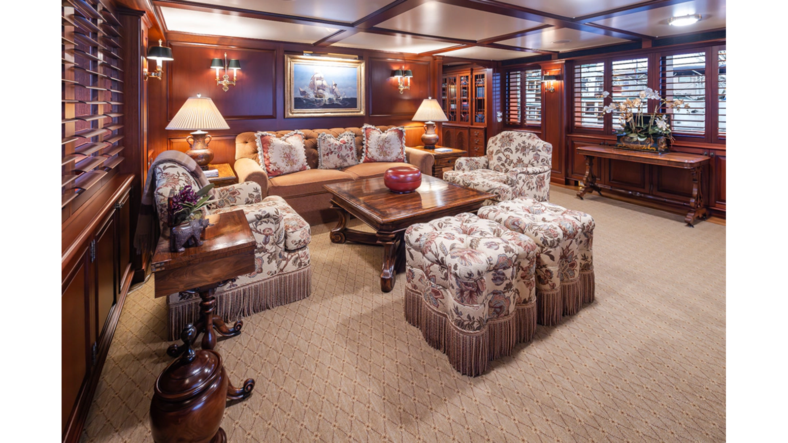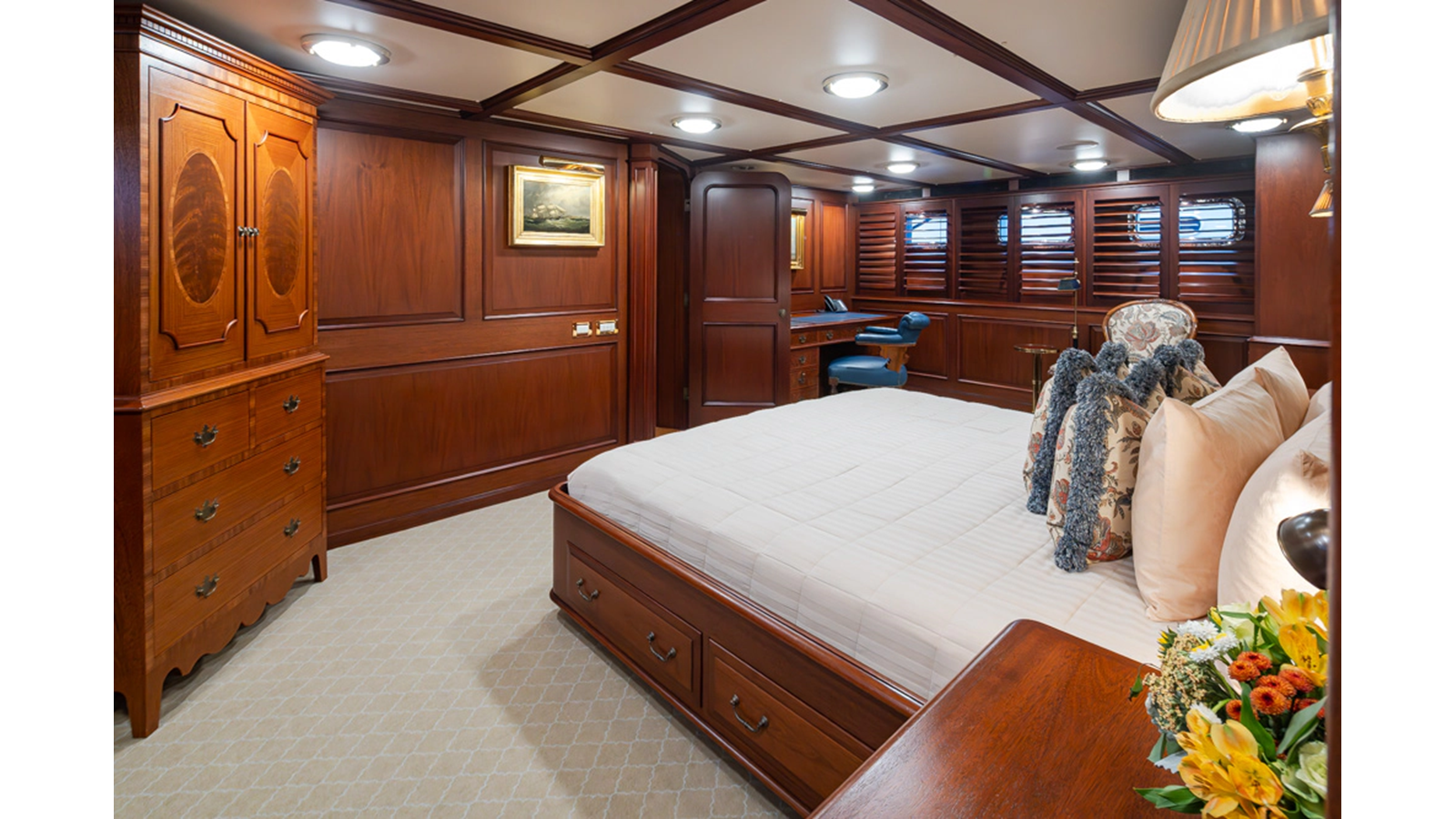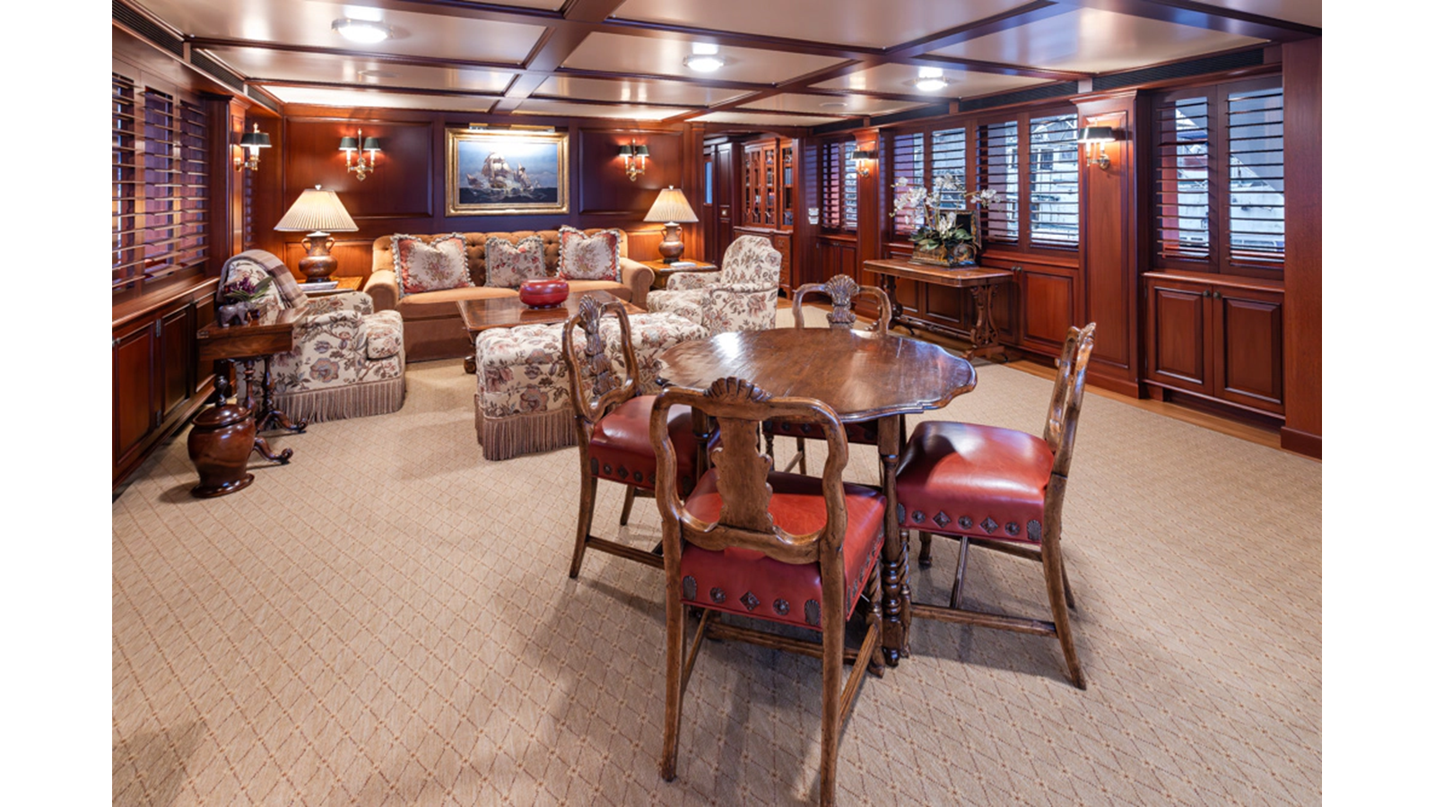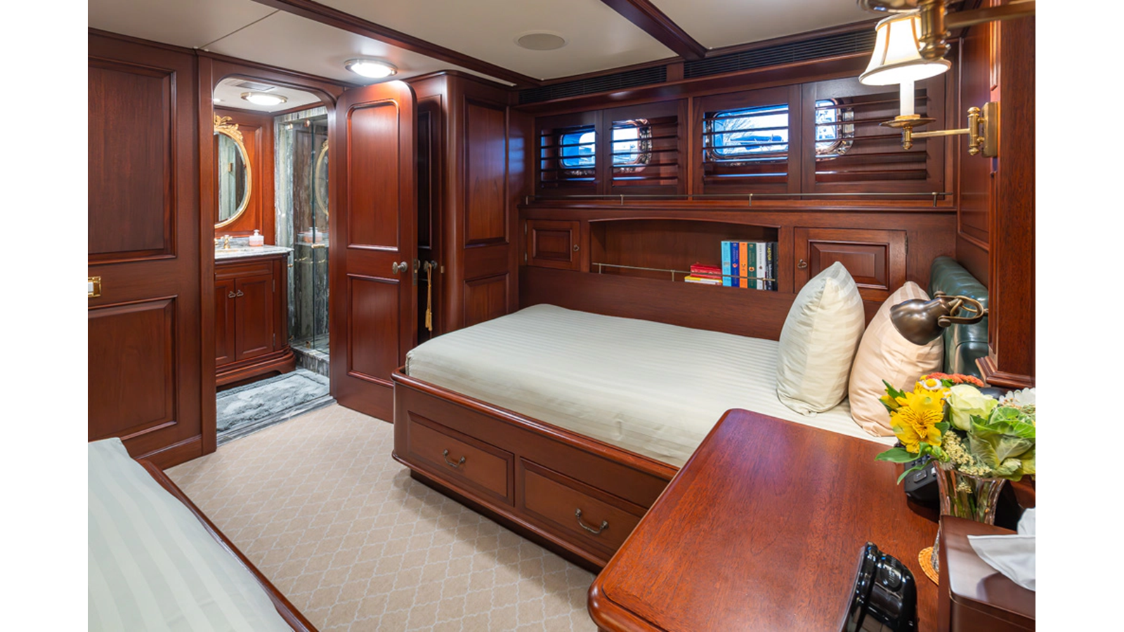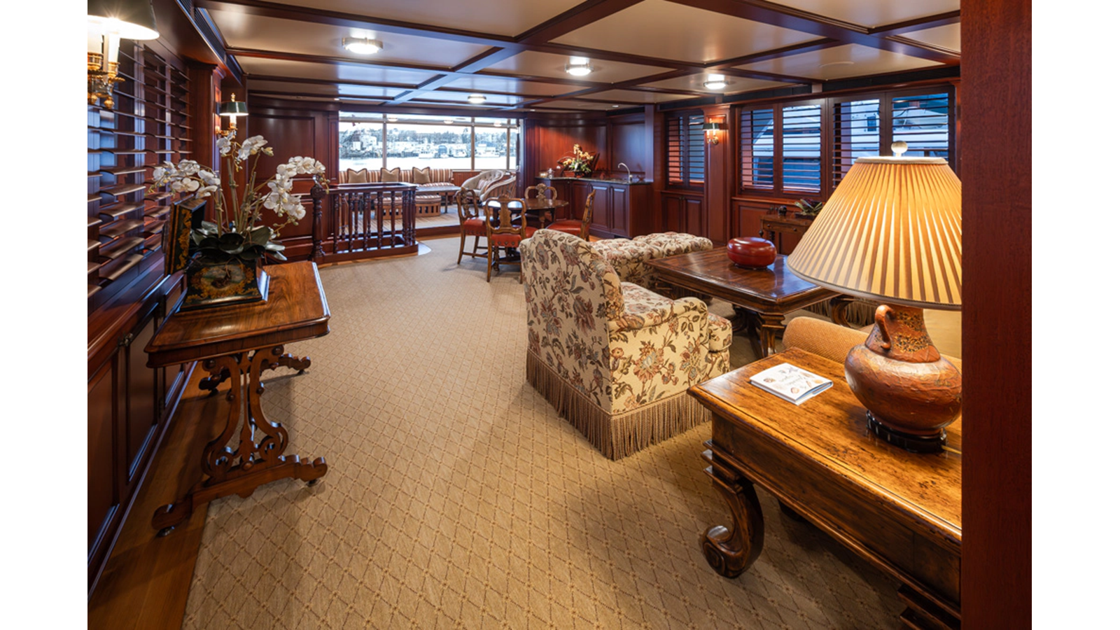 Uncommon in today's marketplace, MARLINDA was designed for relaxed, private cruising rather than large charter-style gatherings. Her beautifully crafted mahogany interior showcases timeless American worksmanship throughout. Guests are welcomed aboard via the main deck aft into a gracious salon featuring a bar to port - ideal for entertaining. Forward lies the formal dining area with convenient access to a spacious, professionally designed galley on the port side. To starboard forward is a day head and an extensive library, offering flexibility to be converted into an on-deck owner's suite if desired. Below deck, accommodations for six guests in two generous staterooms, along with a full-beam master suite.