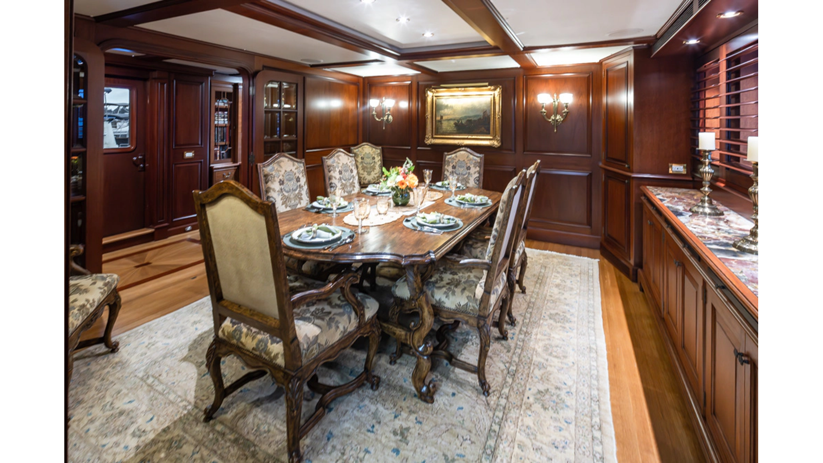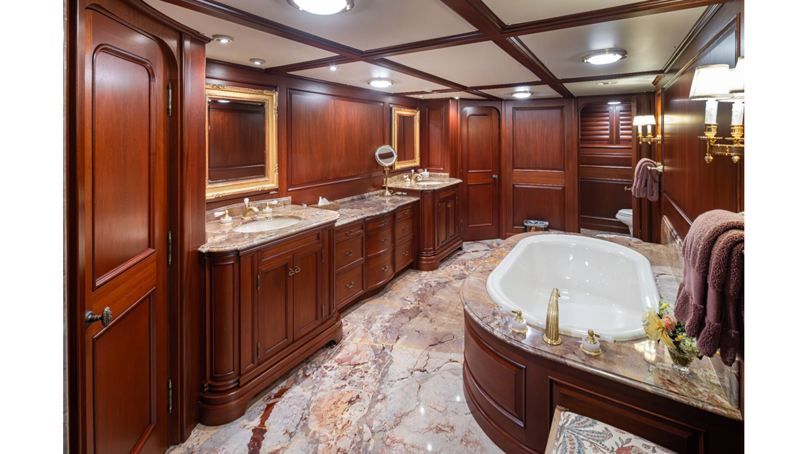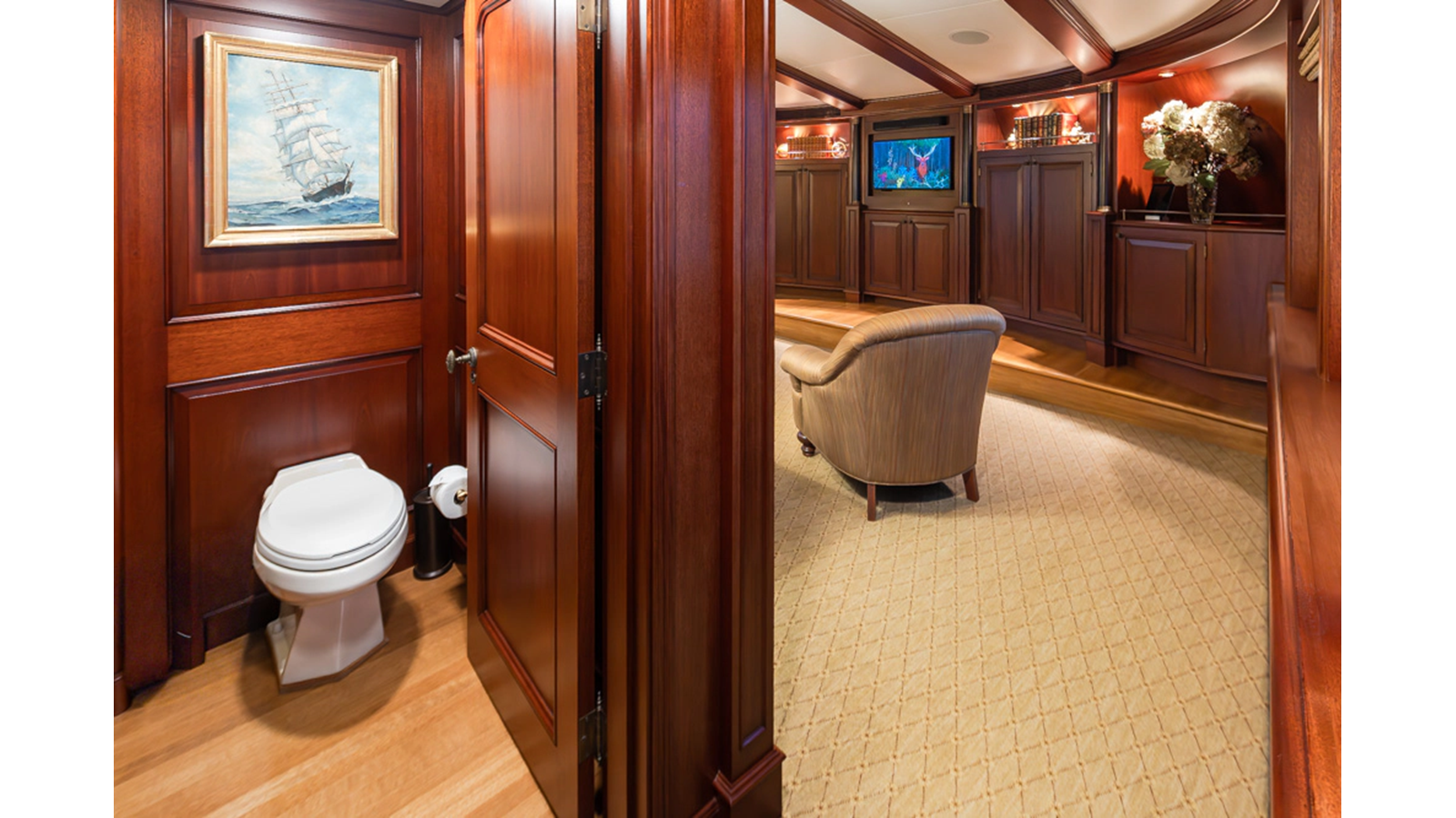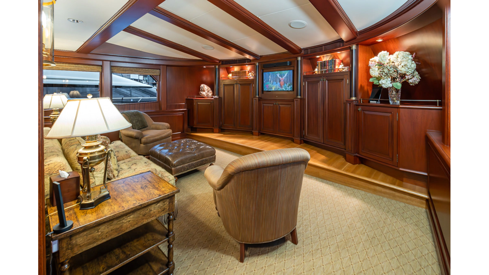 Uncommon in today's marketplace, MARLINDA was designed for relaxed, private cruising rather than large charter-style gatherings. Her beautifully crafted mahogany interior showcases timeless American worksmanship throughout. Guests are welcomed aboard via the main deck aft into a gracious salon featuring a bar to port - ideal for entertaining. Forward lies the formal dining area with convenient access to a spacious, professionally designed galley on the port side. To starboard forward is a day head and an extensive library, offering flexibility to be converted into an on-deck owner's suite if desired. Below deck, accommodations for six guests in two generous staterooms, along with a full-beam master suite.