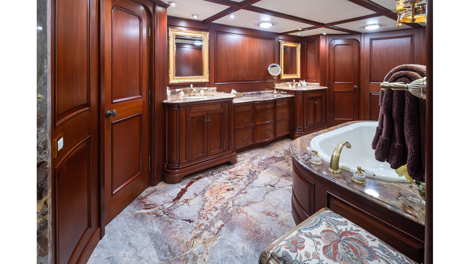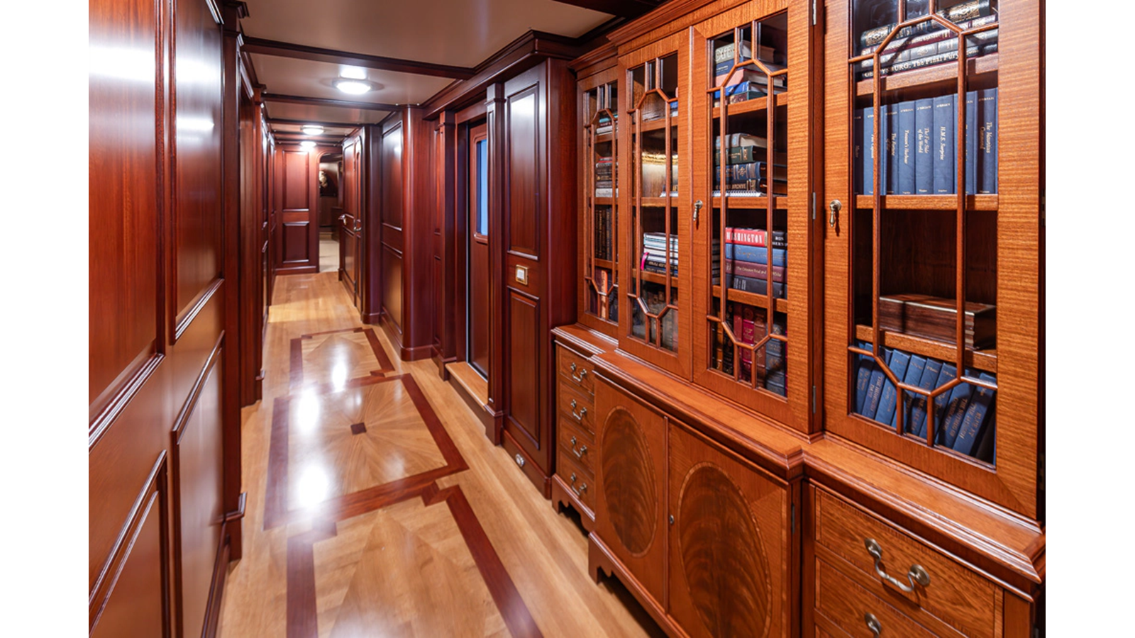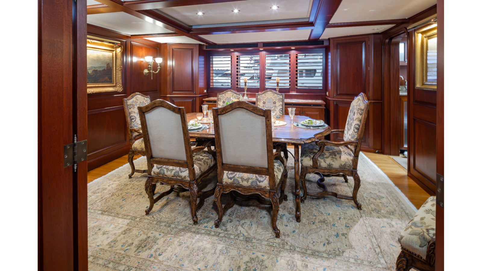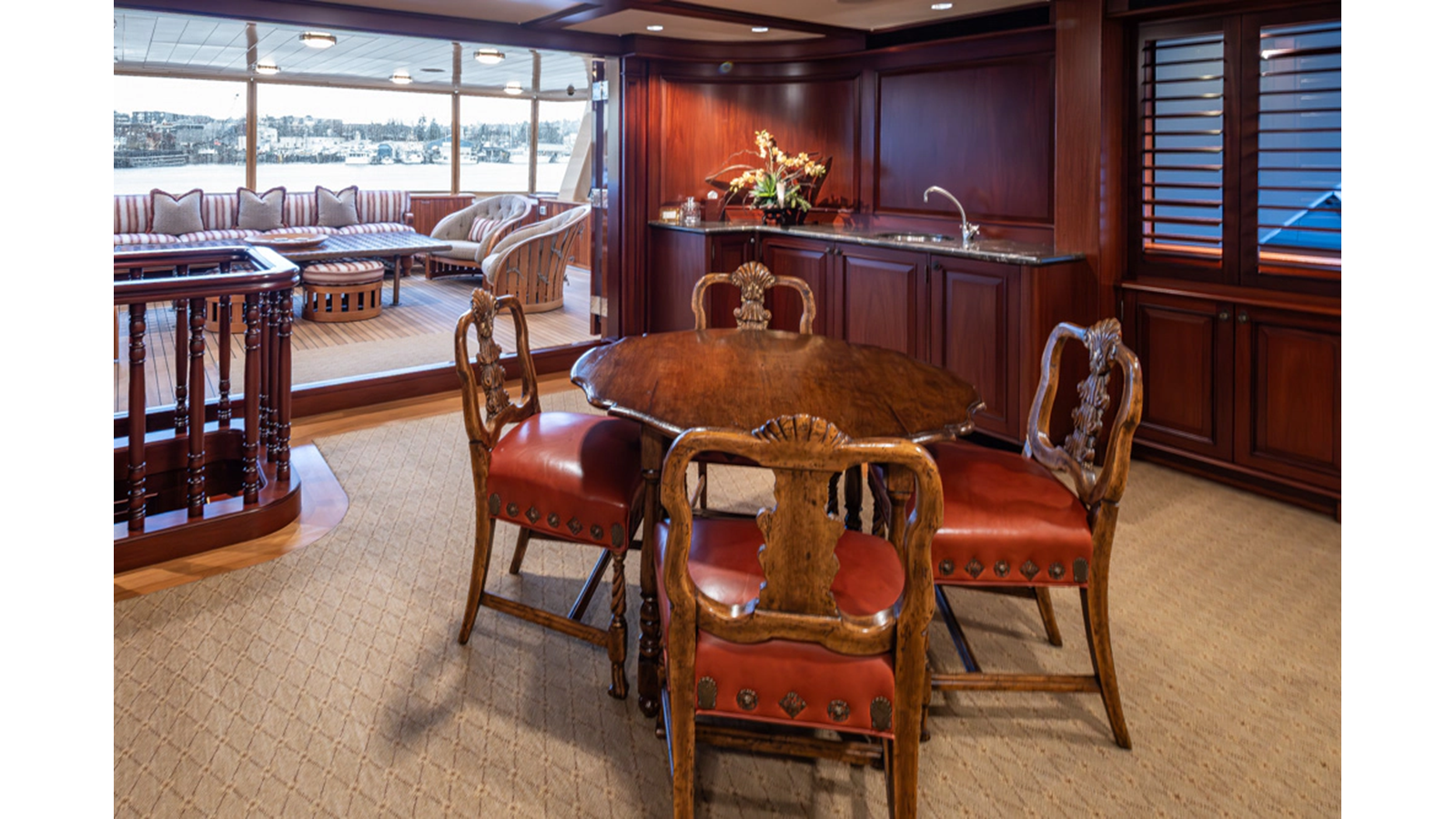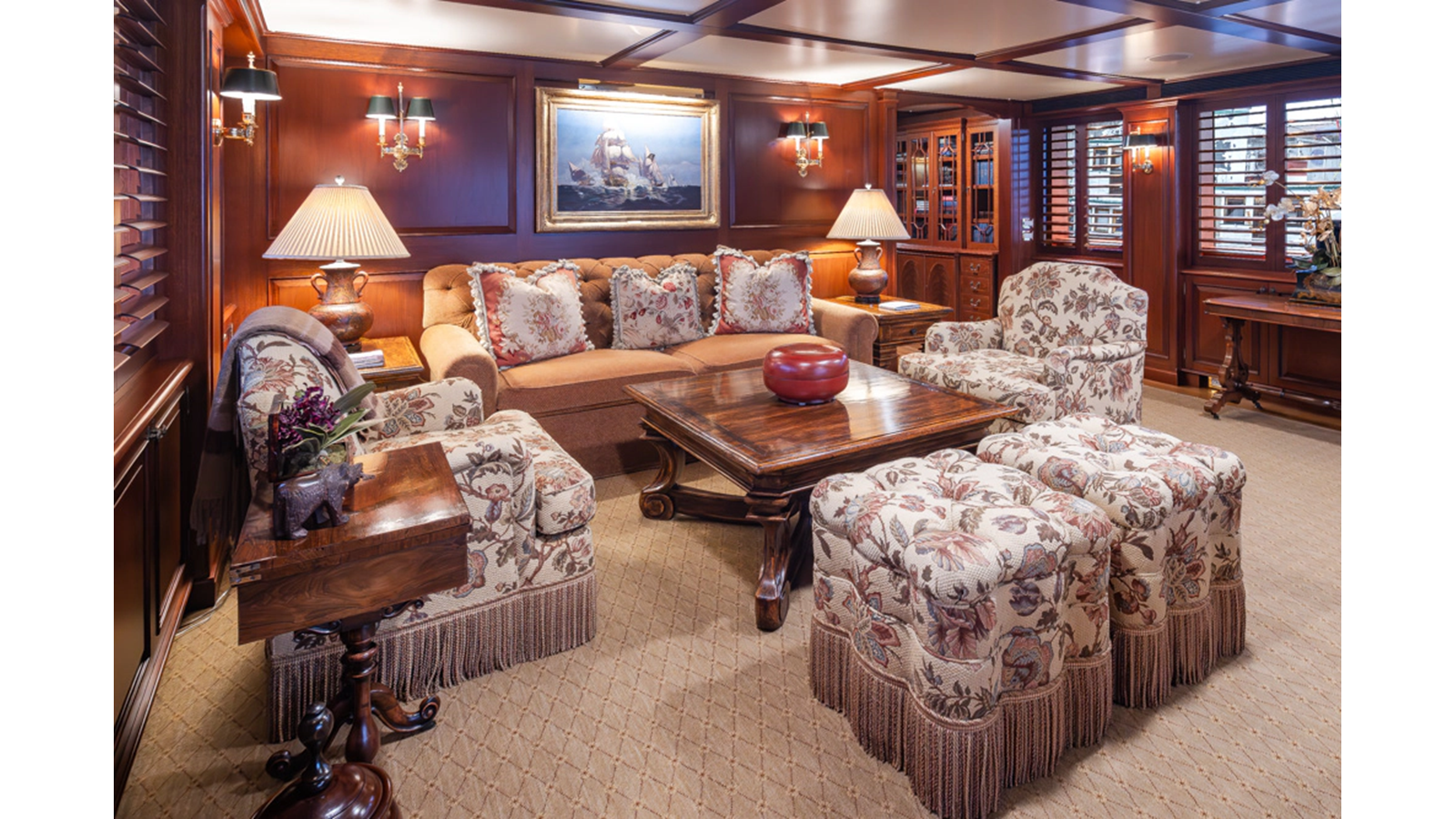 Uncommon in today's marketplace, MARLINDA was designed for relaxed, private cruising rather than large charter-style gatherings. Her beautifully crafted mahogany interior showcases timeless American worksmanship throughout. Guests are welcomed aboard via the main deck aft into a gracious salon featuring a bar to port - ideal for entertaining. Forward lies the formal dining area with convenient access to a spacious, professionally designed galley on the port side. To starboard forward is a day head and an extensive library, offering flexibility to be converted into an on-deck owner's suite if desired. Below deck, accommodations for six guests in two generous staterooms, along with a full-beam master suite.