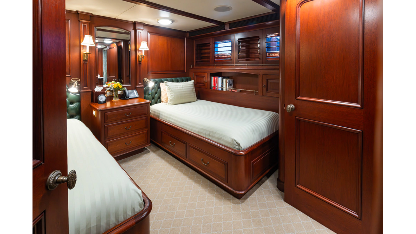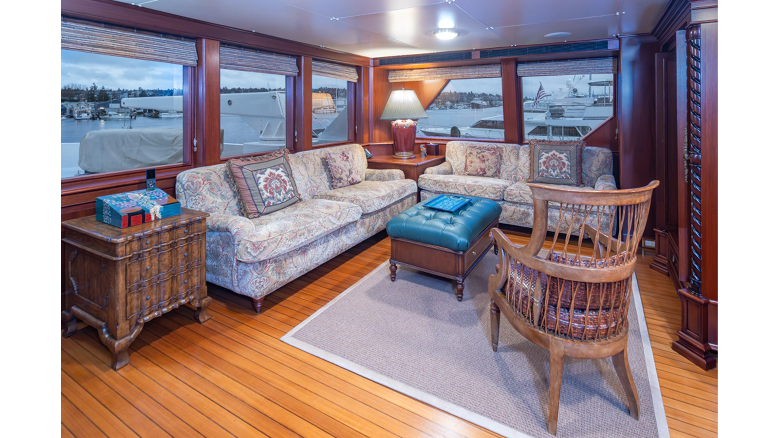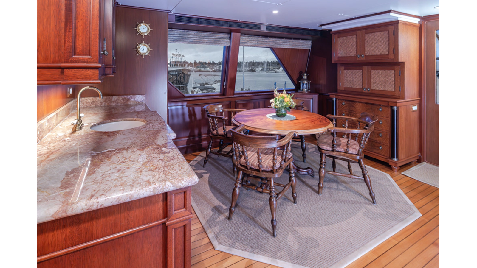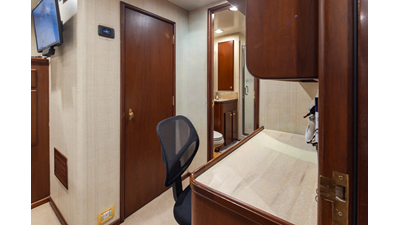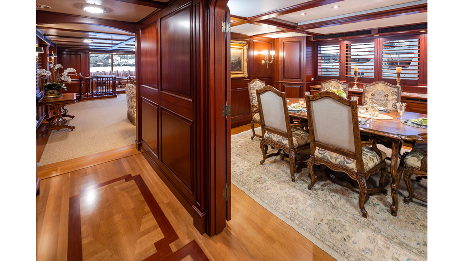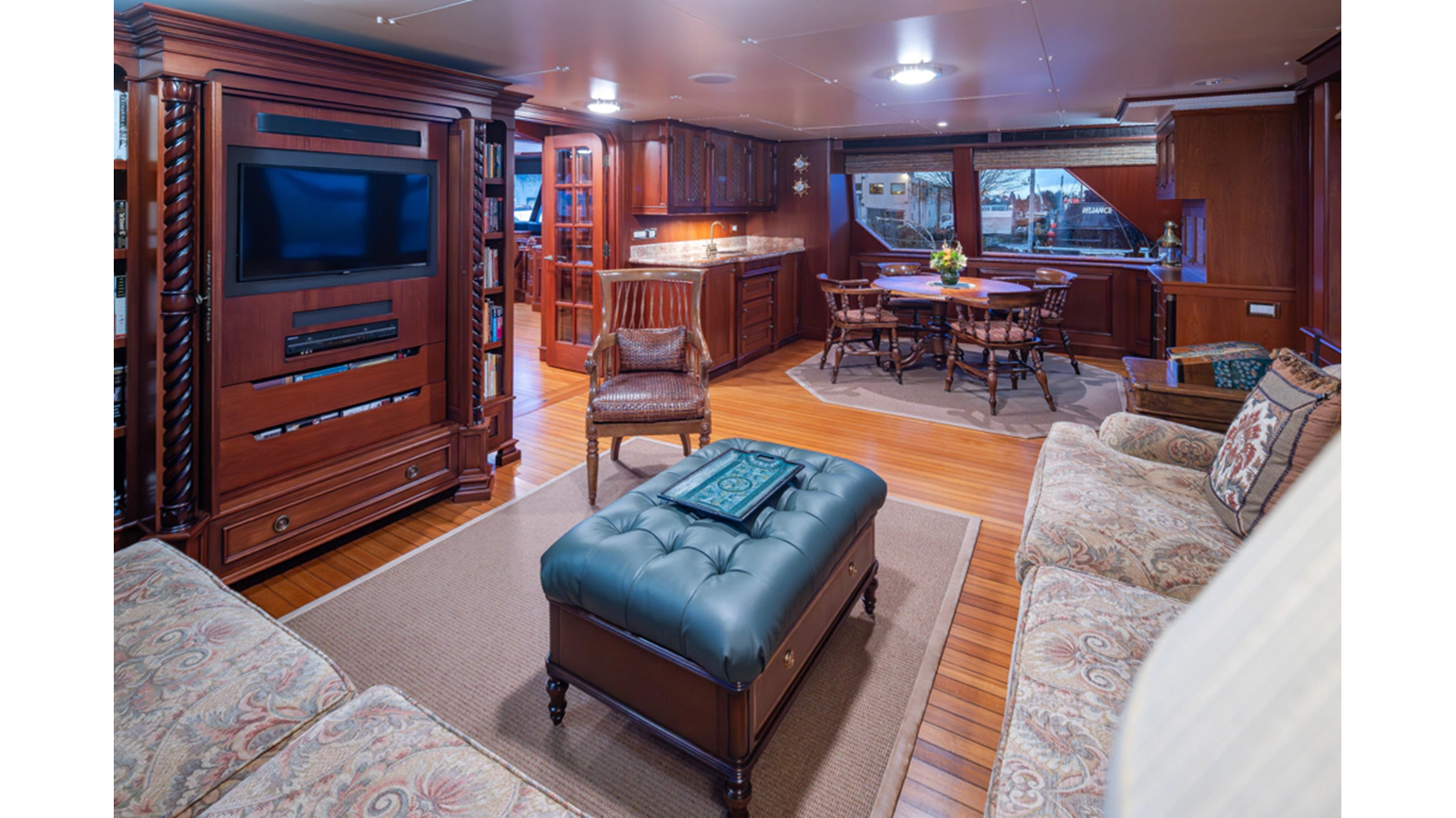 Uncommon in today's marketplace, MARLINDA was designed for relaxed, private cruising rather than large charter-style gatherings. Her beautifully crafted mahogany interior showcases timeless American worksmanship throughout. Guests are welcomed aboard via the main deck aft into a gracious salon featuring a bar to port - ideal for entertaining. Forward lies the formal dining area with convenient access to a spacious, professionally designed galley on the port side. To starboard forward is a day head and an extensive library, offering flexibility to be converted into an on-deck owner's suite if desired. Below deck, accommodations for six guests in two generous staterooms, along with a full-beam master suite.