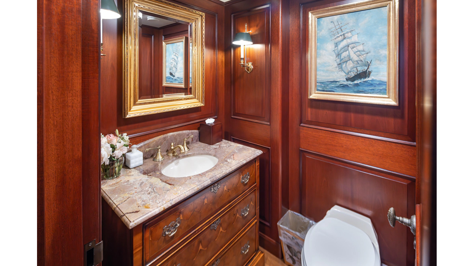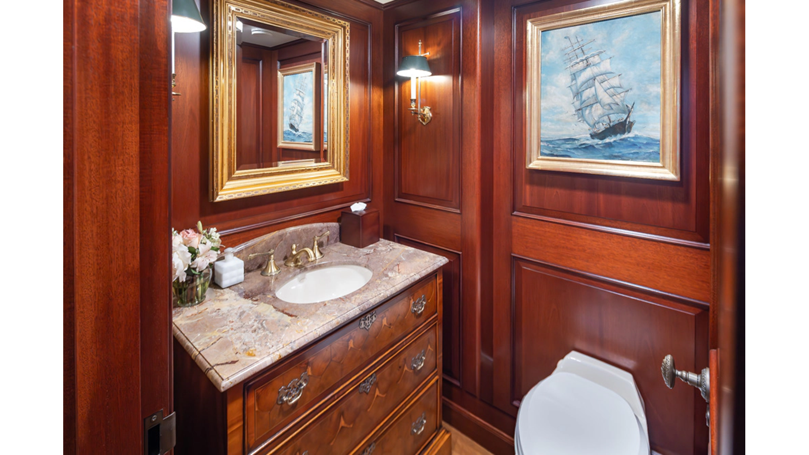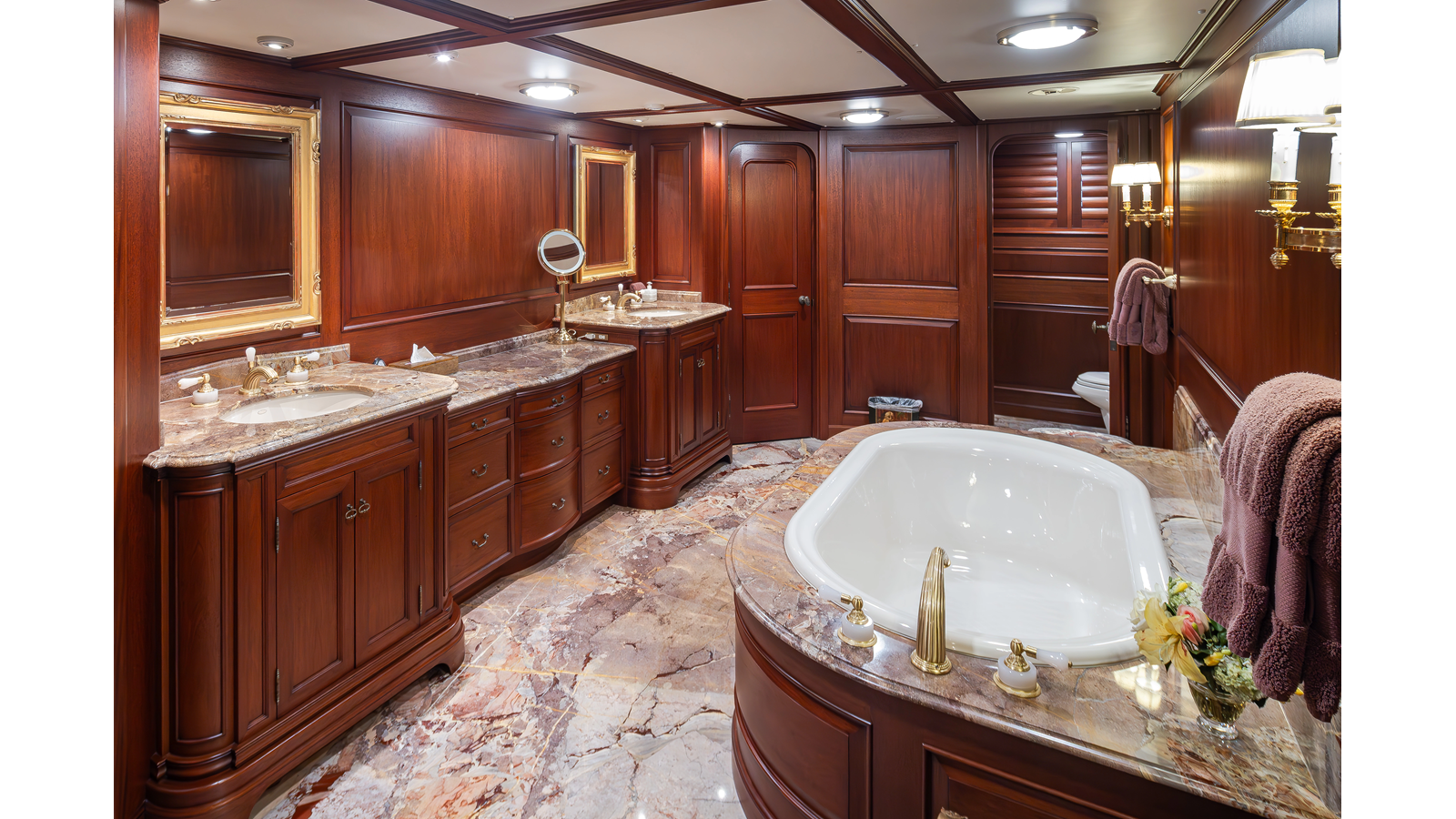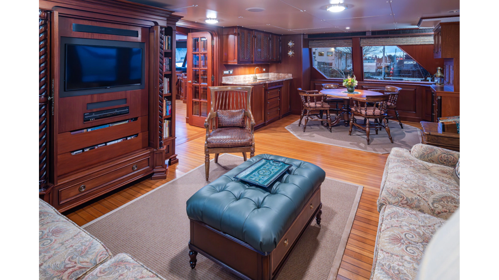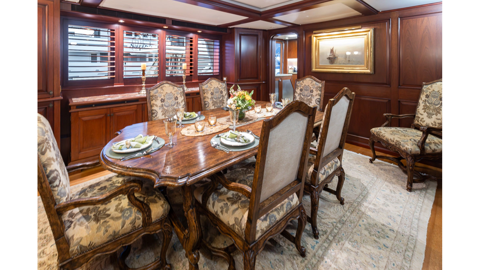 Uncommon in today's marketplace, MARLINDA was designed for relaxed, private cruising rather than large charter-style gatherings. Her beautifully crafted mahogany interior showcases timeless American worksmanship throughout. Guests are welcomed aboard via the main deck aft into a gracious salon featuring a bar to port - ideal for entertaining. Forward lies the formal dining area with convenient access to a spacious, professionally designed galley on the port side. To starboard forward is a day head and an extensive library, offering flexibility to be converted into an on-deck owner's suite if desired. Below deck, accommodations for six guests in two generous staterooms, along with a full-beam master suite.