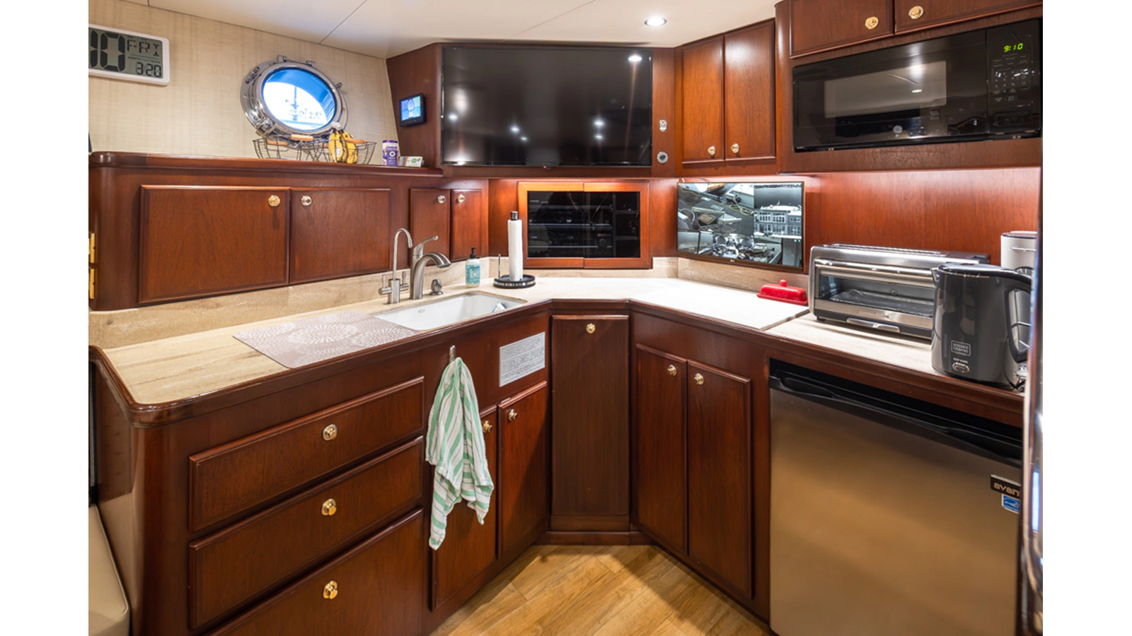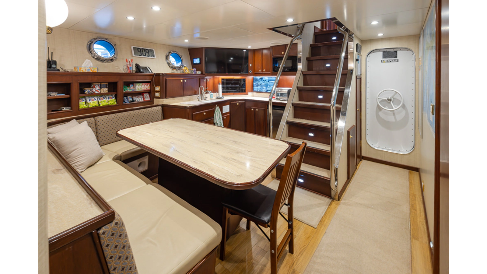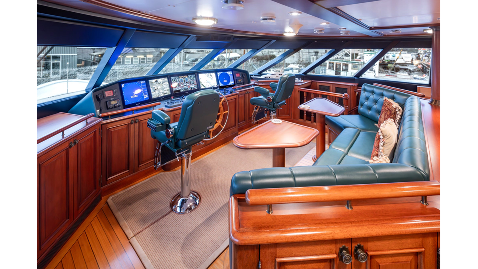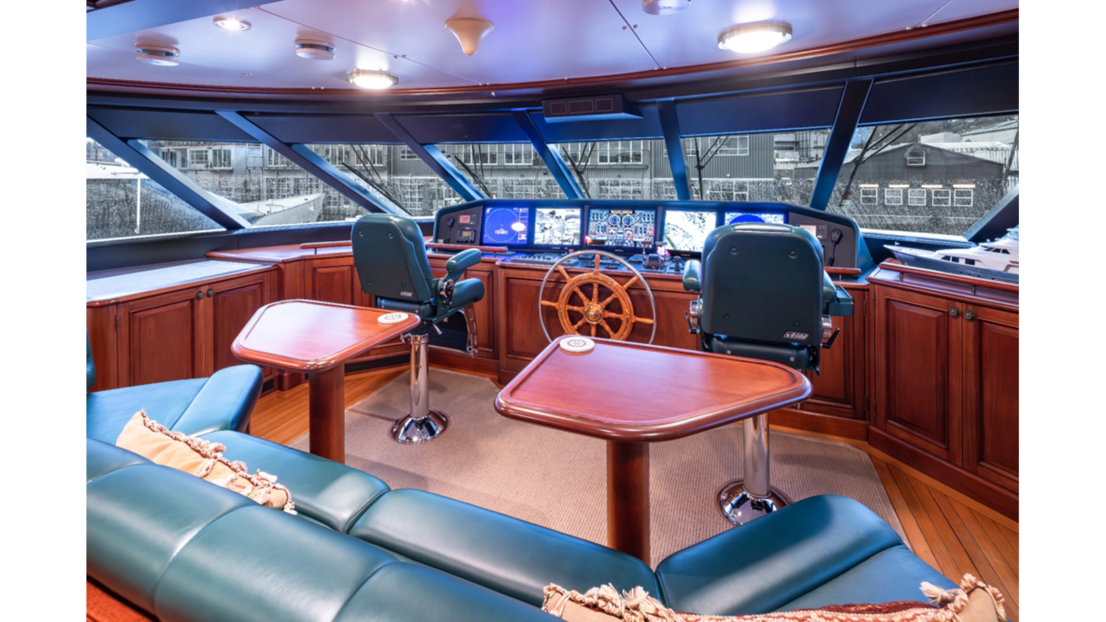 - Helm Station with 19" Green Marine display, Kahlenburg Horn Controls, Ham/Jet RAI, Searchlight controls, (2) B&G H3000, Thruster controls, Kobelt controls, ComNav211 rudder and autopilot controls, Naiad Multisea II Controls