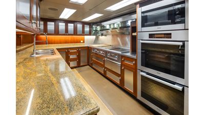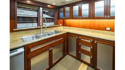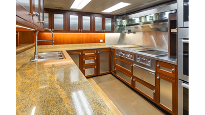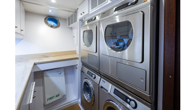 Powered by proven CAT engines and stabilized with Naiad fin stabilizers, MARLINDA offers an impressive cruising range of more than 4,000 nautical miles while delivering excellent comfort underway. The fully enclosed and climate-controlled California deck provides a welcoming space in all weather conditions, while the large aft cockpit supports fishing, cruising, and active time on the water. The wheelhouse is notably open and inviting, complete with excellent visibility, a dedicated day head, and an adjacent sky lounge - encouraging guests to share in the navigation experience. On the boat deck, dual port and starboard davits rated at 4,500 lbs each allow for effortless deployment of tenders up to 26 feet.