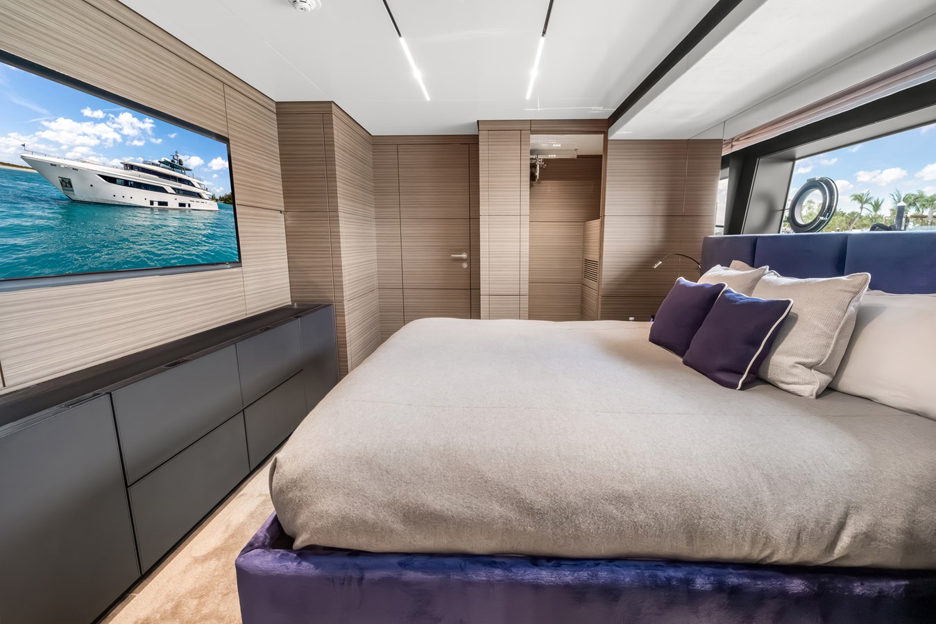 Inside and out, her custom configuration was designed for elite, uncompromising comfort for up to 10 guests. Standout features include a spectacular drop-down electric balcony off the main deck , a sprawling sun deck complete with an extended Jacuzzi pool and Teppanyaki grill , and an incredible Invisible Black marble upgrade sweeping through the luxurious en-suites. At the water's edge, the transom folds down to reveal a massive, teak-laid beach club perfectly outfitted for entertaining with a custom bar, icemaker, and an additional freezer. Equipped with a high-capacity Atlas shore power converter for seamless global cruising, she is a turnkey masterpiece ready for her next owner.