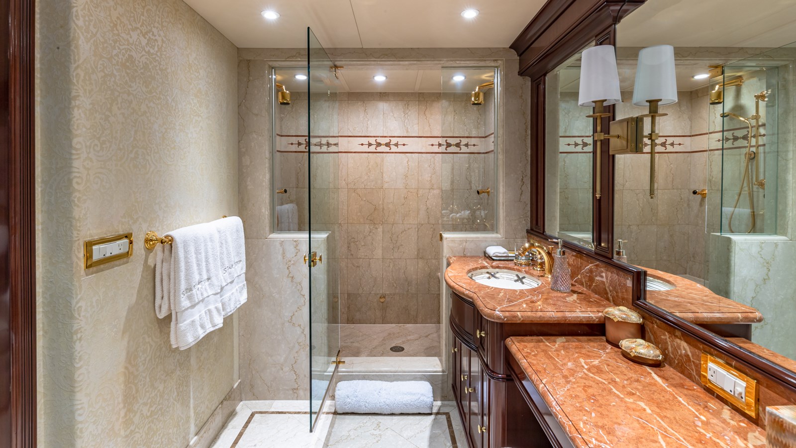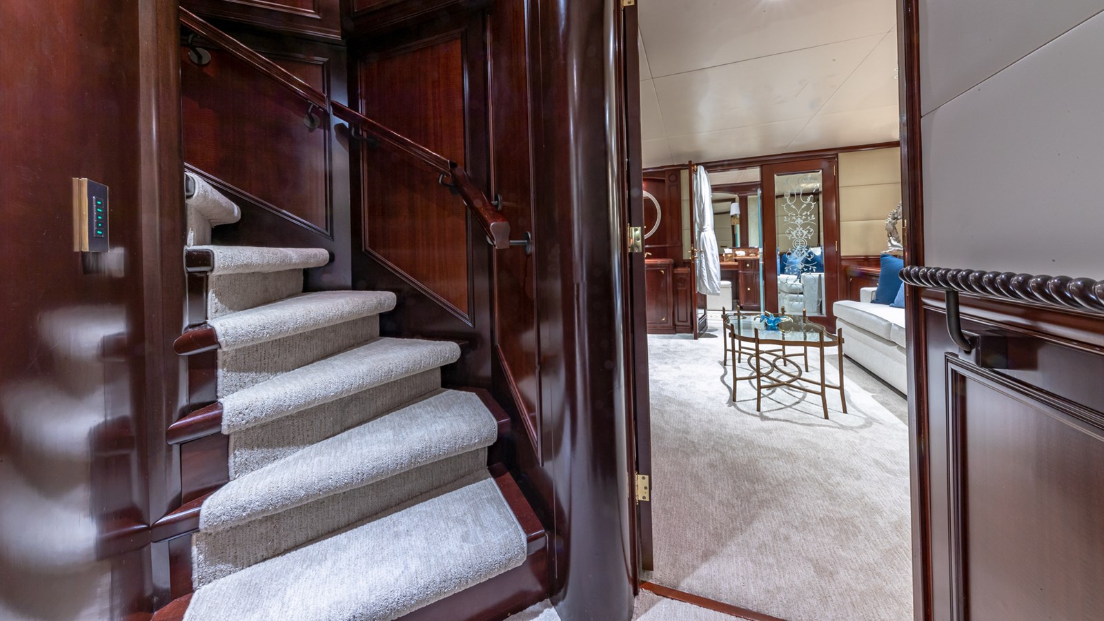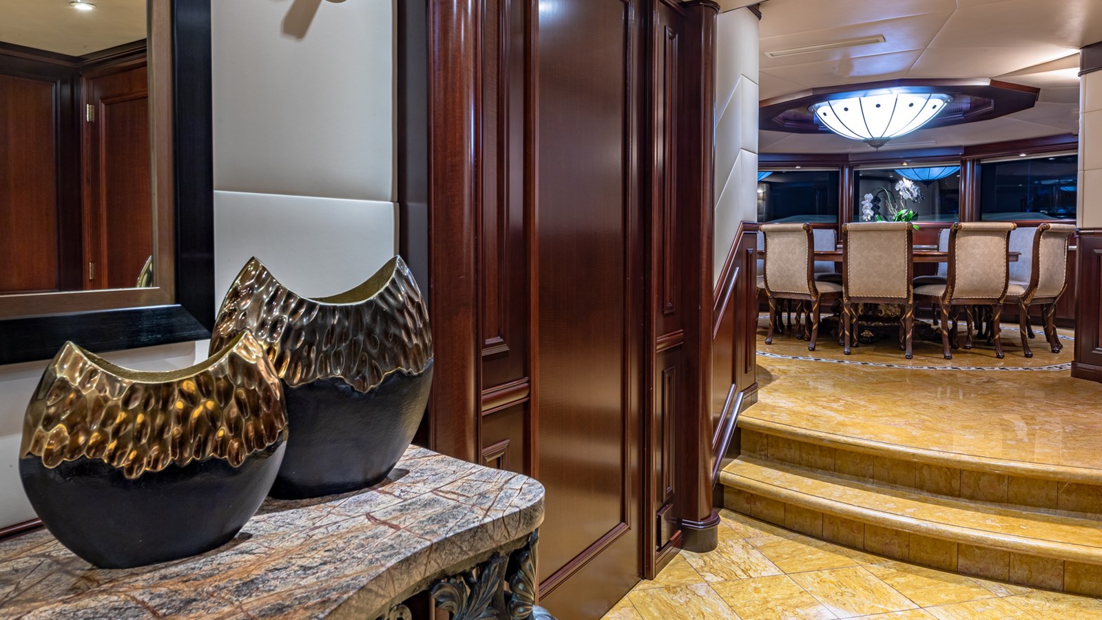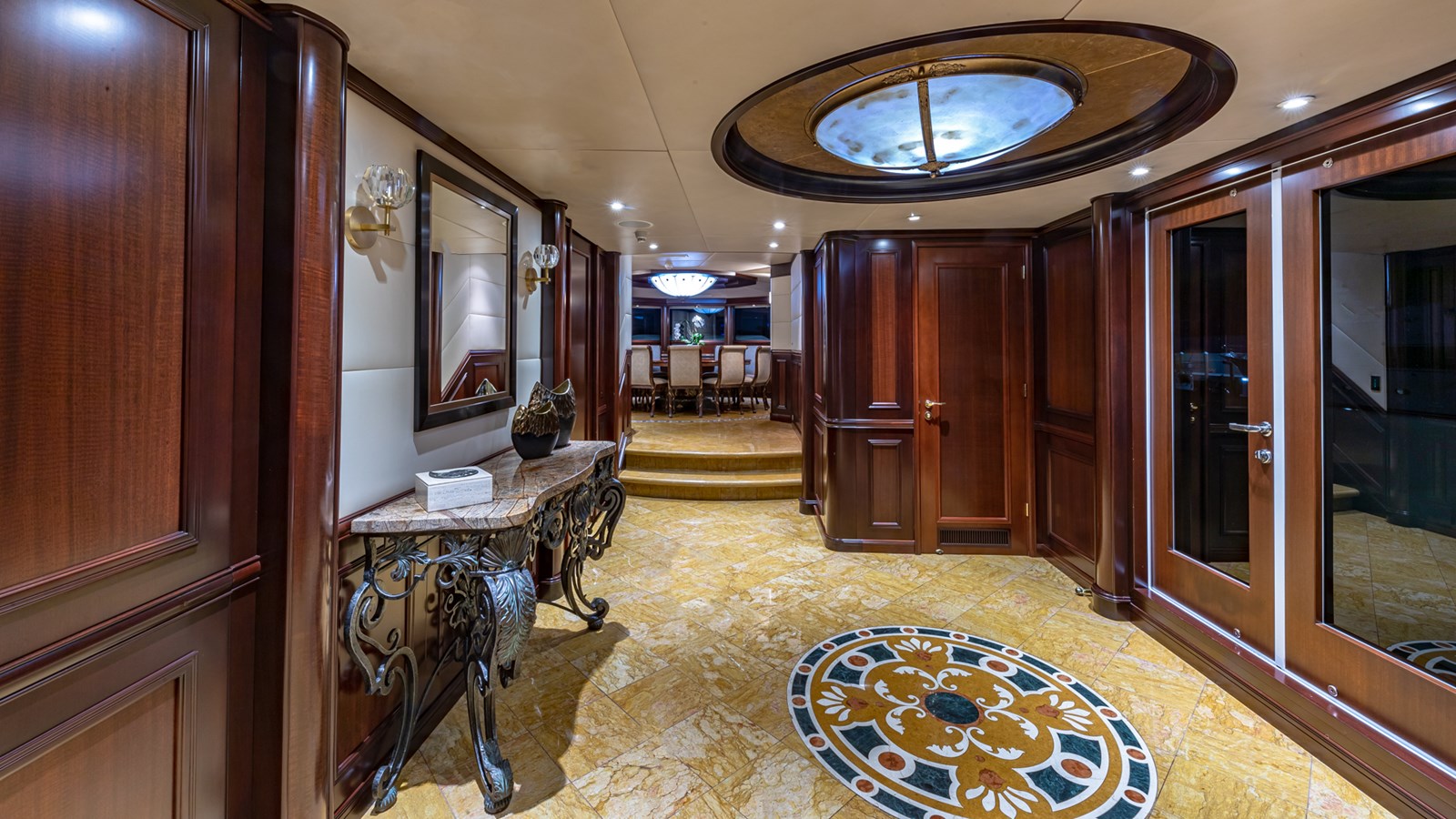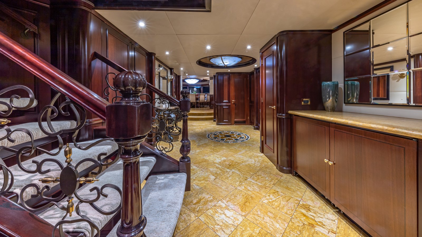 Her interiors feature marble floors, rich woods, and elegant soft furnishings, highlighted by a grand main foyer with a spiral staircase. STARSHIP accommodates up to 12 guests in five staterooms, including a master suite, two VIPs, a double, and a twin cabin with a Pullman berth. Up to 9 crew ensure attentive service for a luxurious experience.