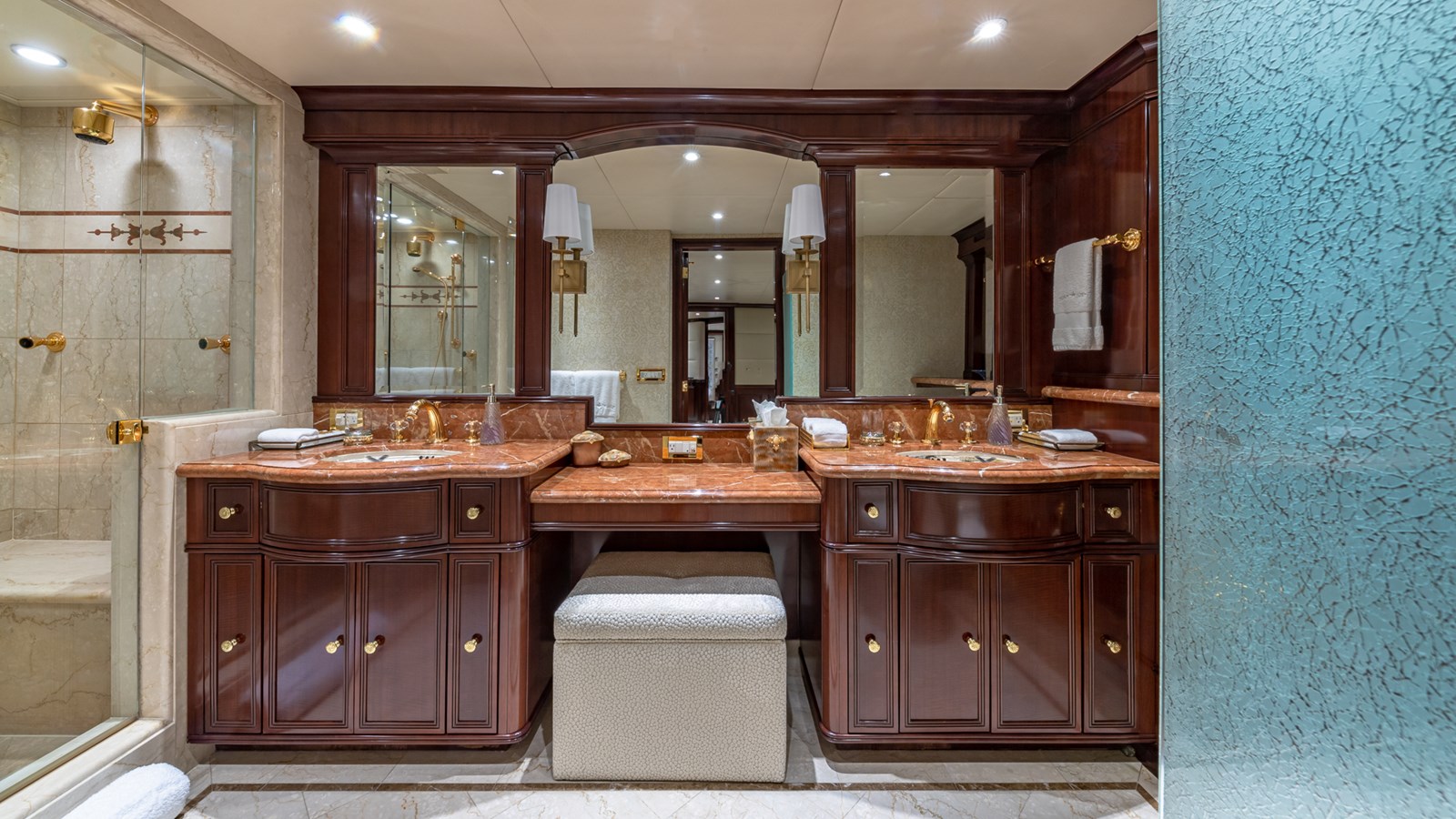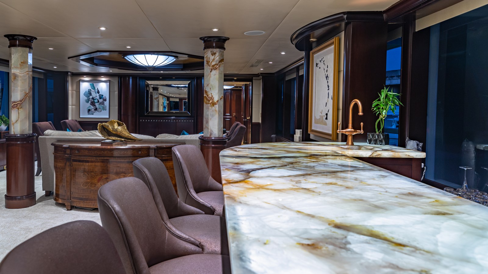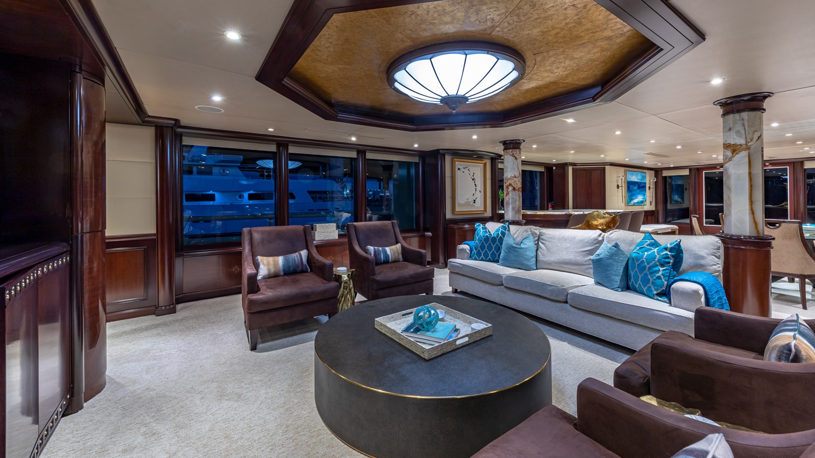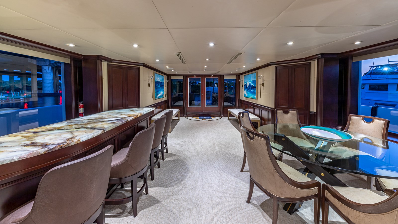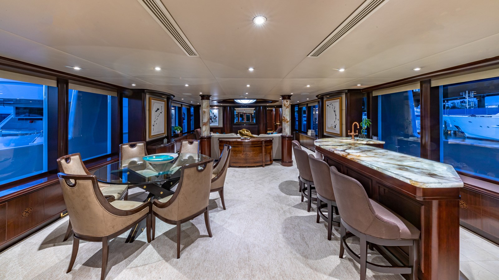 Her interiors feature marble floors, rich woods, and elegant soft furnishings, highlighted by a grand main foyer with a spiral staircase. STARSHIP accommodates up to 12 guests in five staterooms, including a master suite, two VIPs, a double, and a twin cabin with a Pullman berth. Up to 9 crew ensure attentive service for a luxurious experience.