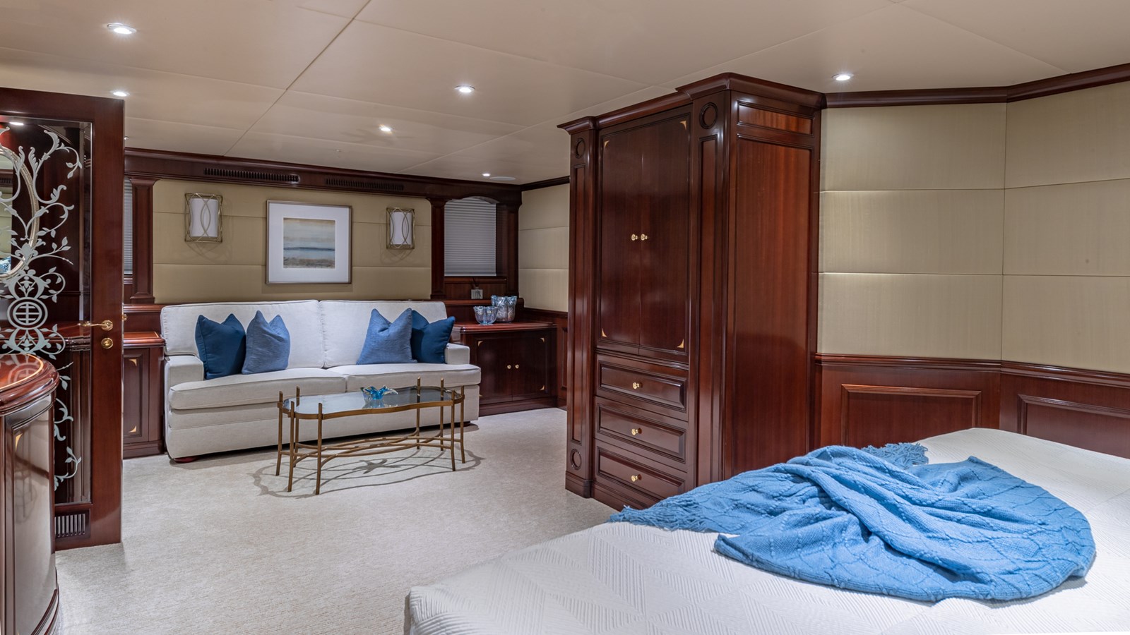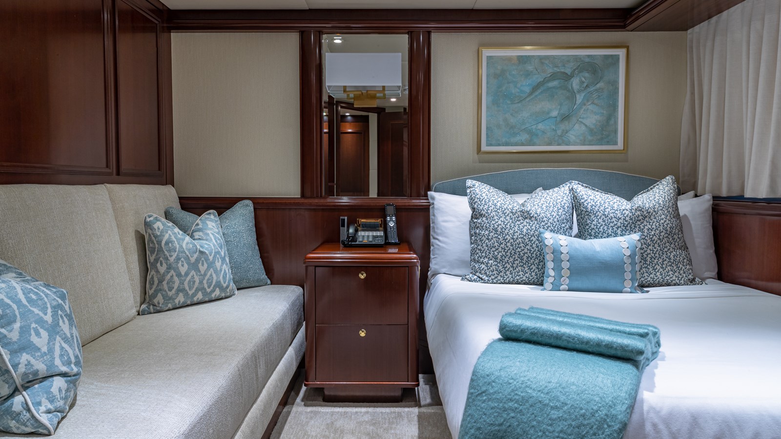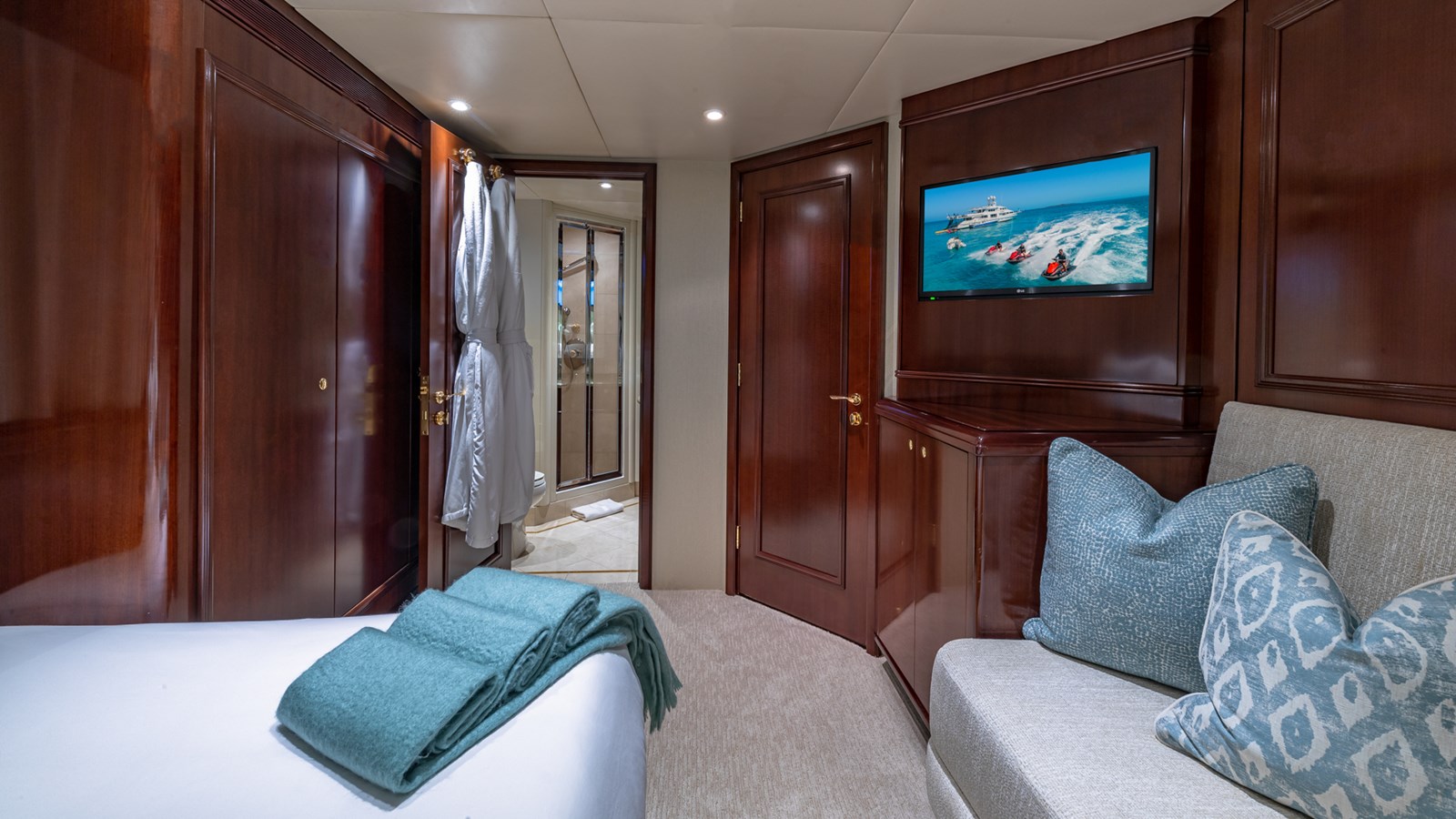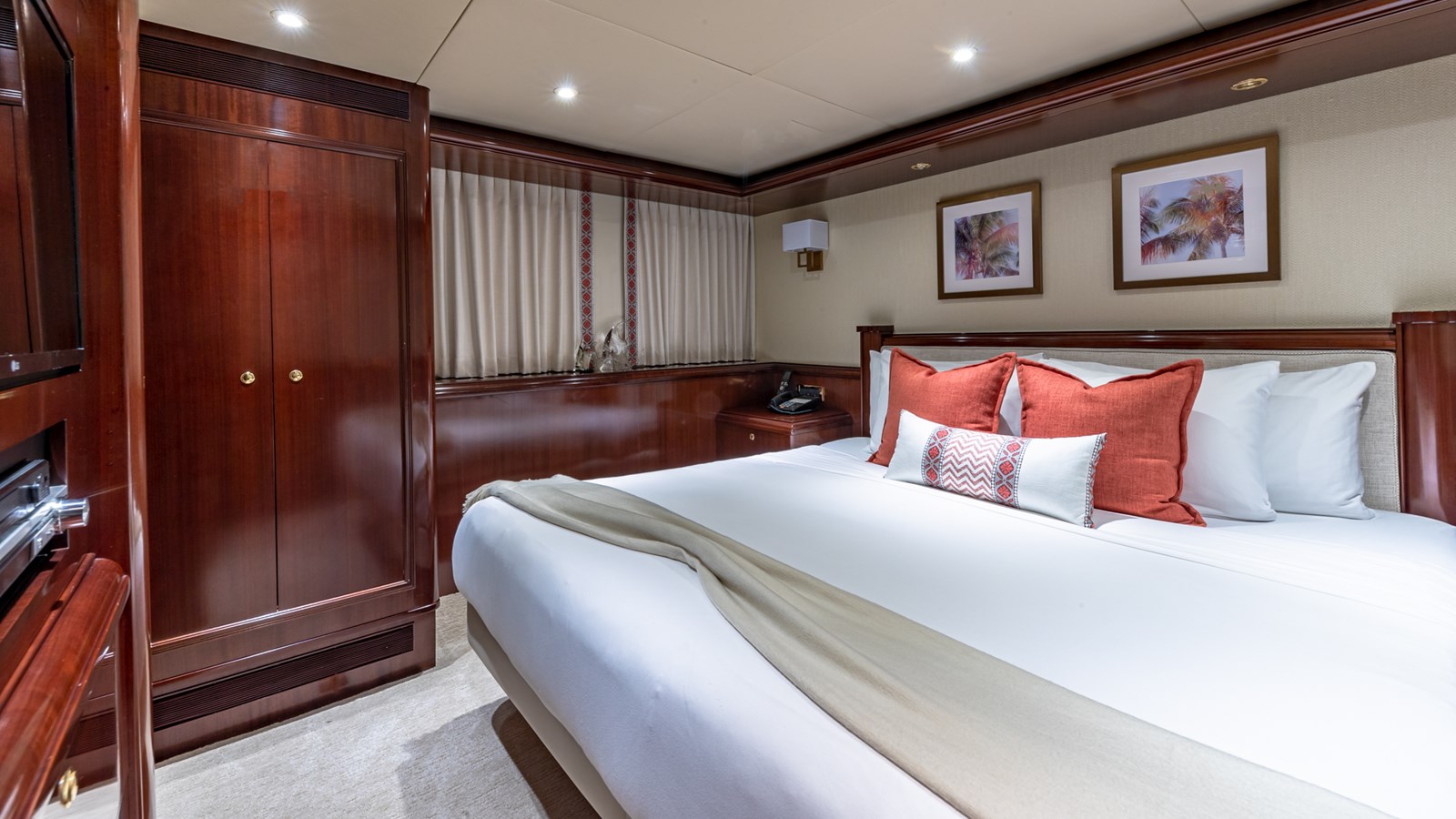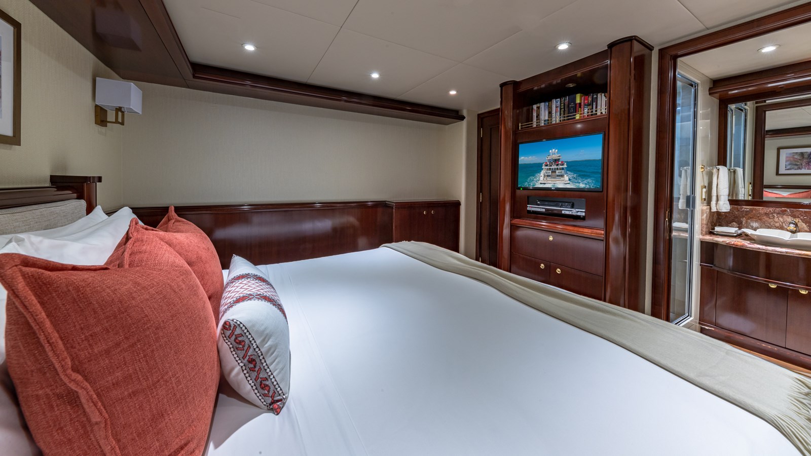 - Sleeps 12 guests in 5 staterooms (Master, 2 VIP, Double, Twin + Pullman)