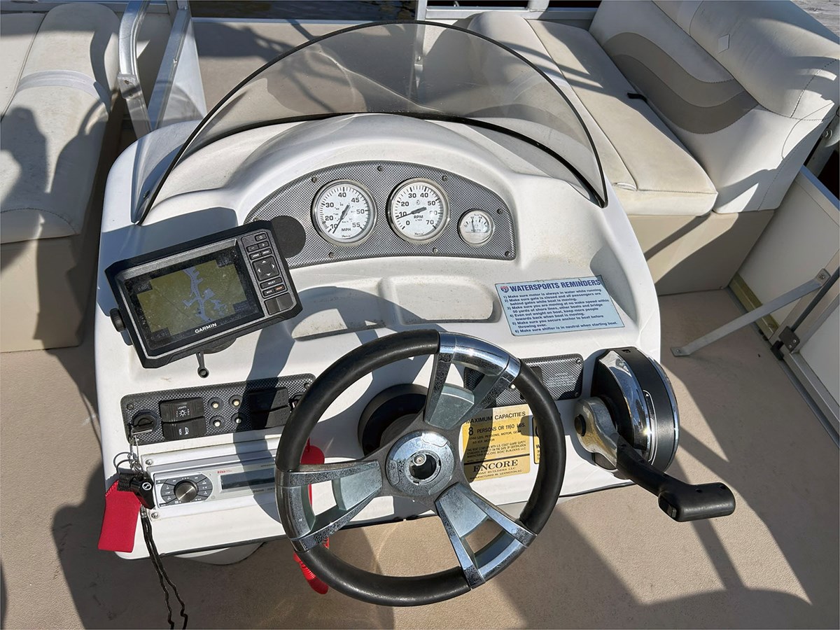 The Bentley Encore 16 is a versatile and compact pontoon that punches above its weight with a reliable Mercury 50hp outboard engine. Perfectly sized for cruising calm waterways, leisurely fishing trips, or pulling a tube, this model offers the ideal balance of space and easy handling without the hassle of a larger vessel. It features a quality construction designed for lasting durability. Whether you're looking for a dependable weekend fishing boat or a cozy cruiser for sunset tours, this Bentley Encore delivers on all the simple pleasures of pontoon life. Don't miss the sale on this 16-foot pontoon boat.