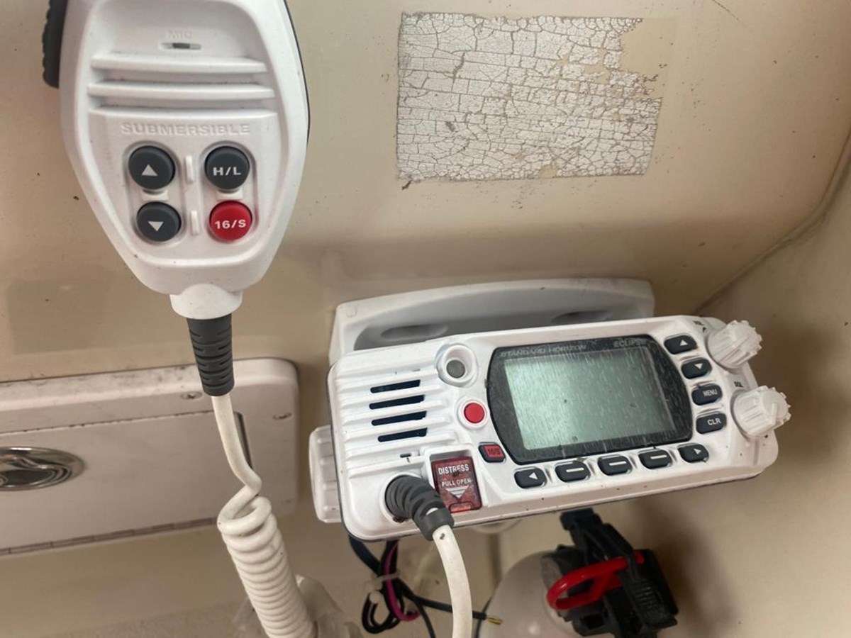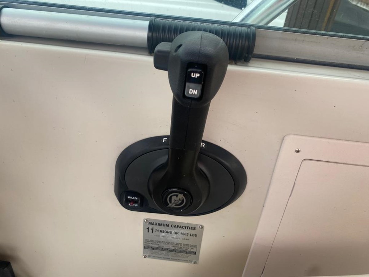 The boat has an enclosure battery charger, depth sounder, GPS, and color-fixed Mount. Stereo AM/FM/CD PLAYER, refrigerator, batteries, docking lights, swim fiberglass platform, trim tabs.
