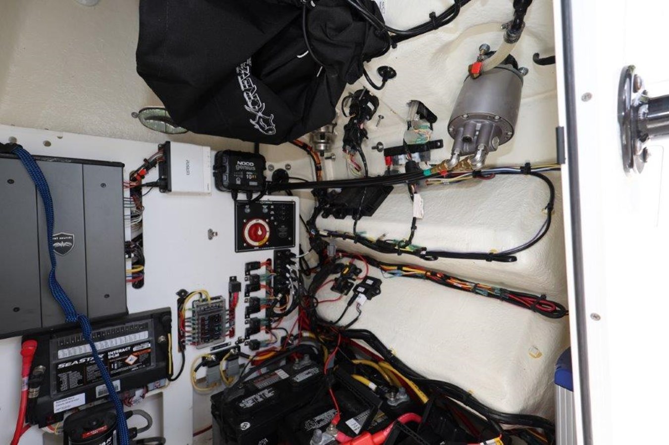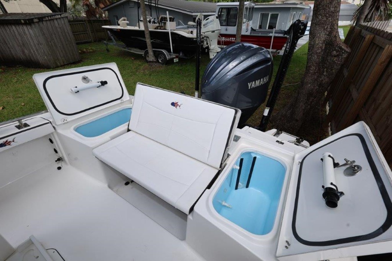 - Custom fiberglass leaning post with backrest, rigging tray, tackle storage, sink, glove boxes, removable cooler, cup holders & rod holders