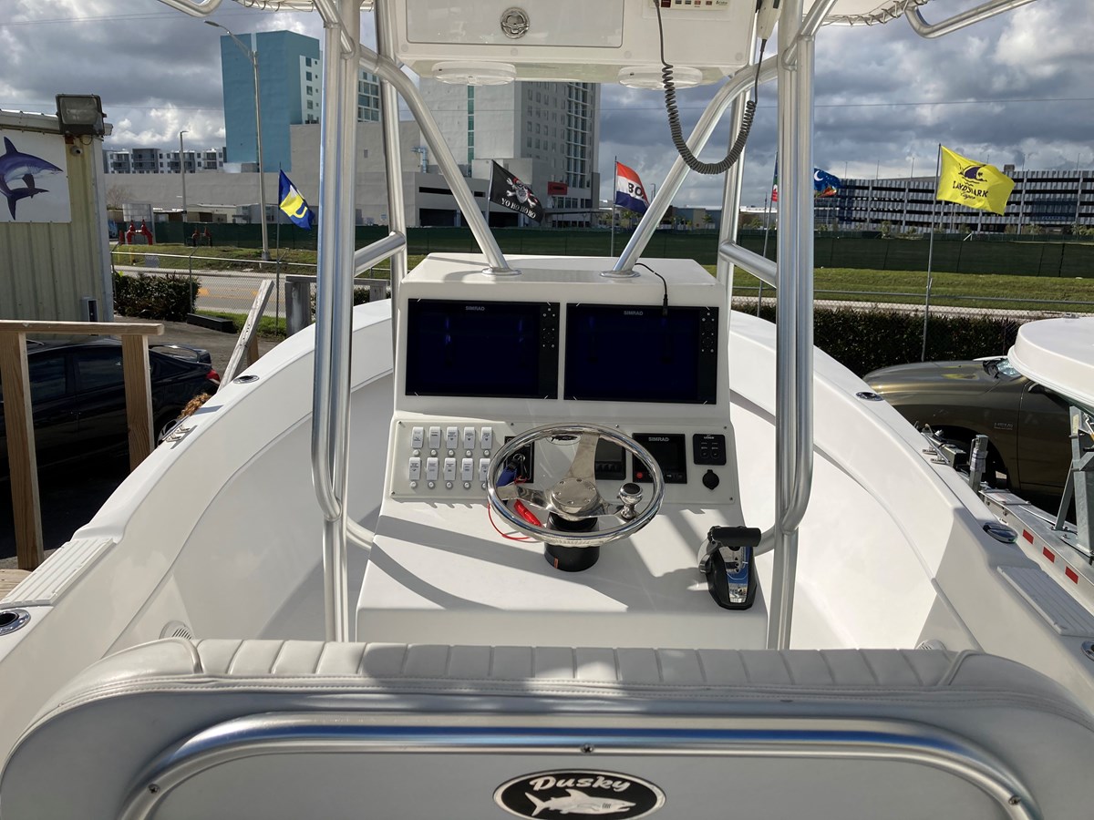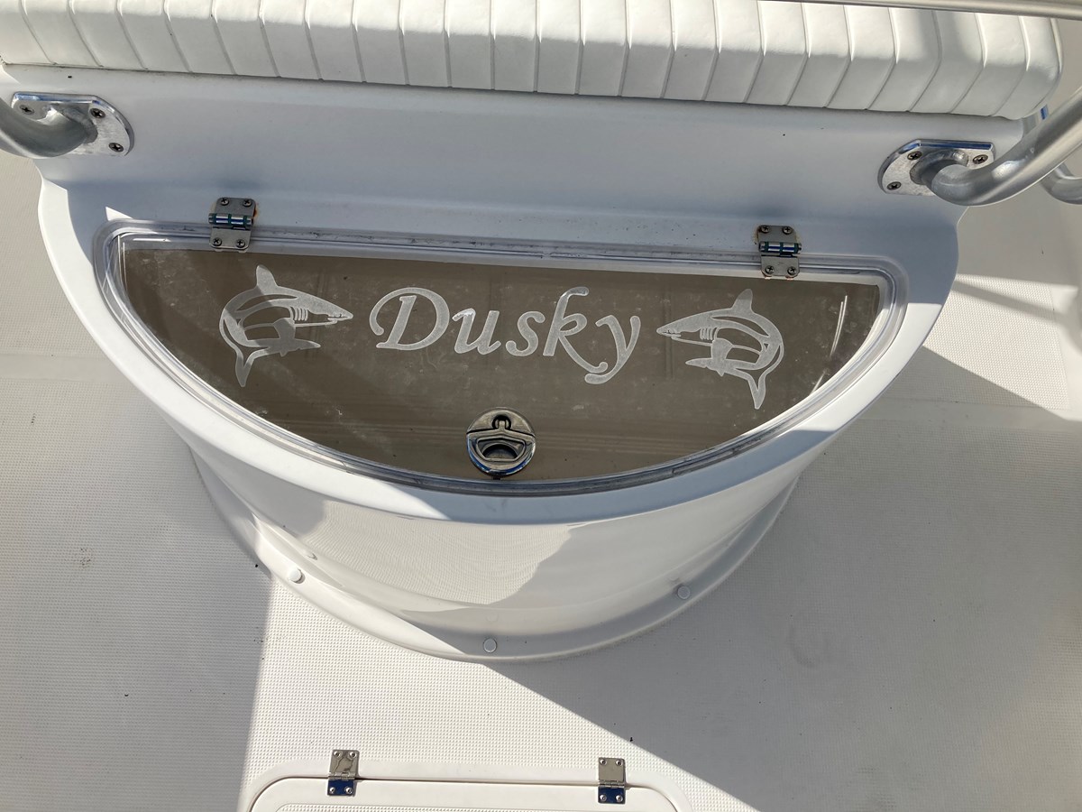 "The Dusky's high, dry sides, roomy interior, and smooth ride make Dusky 252 an offshore favorite. Dusky 252 is equipped with the Dusky Drive; a unique fiberglass outboard bracket with an integrated swim/dive platform. The Dusky Drive improves maneuverability and stability of your boat while allowing a full transom for safety. "