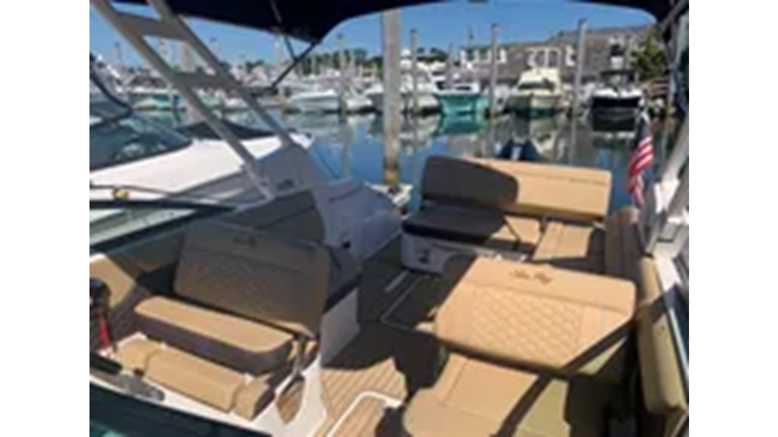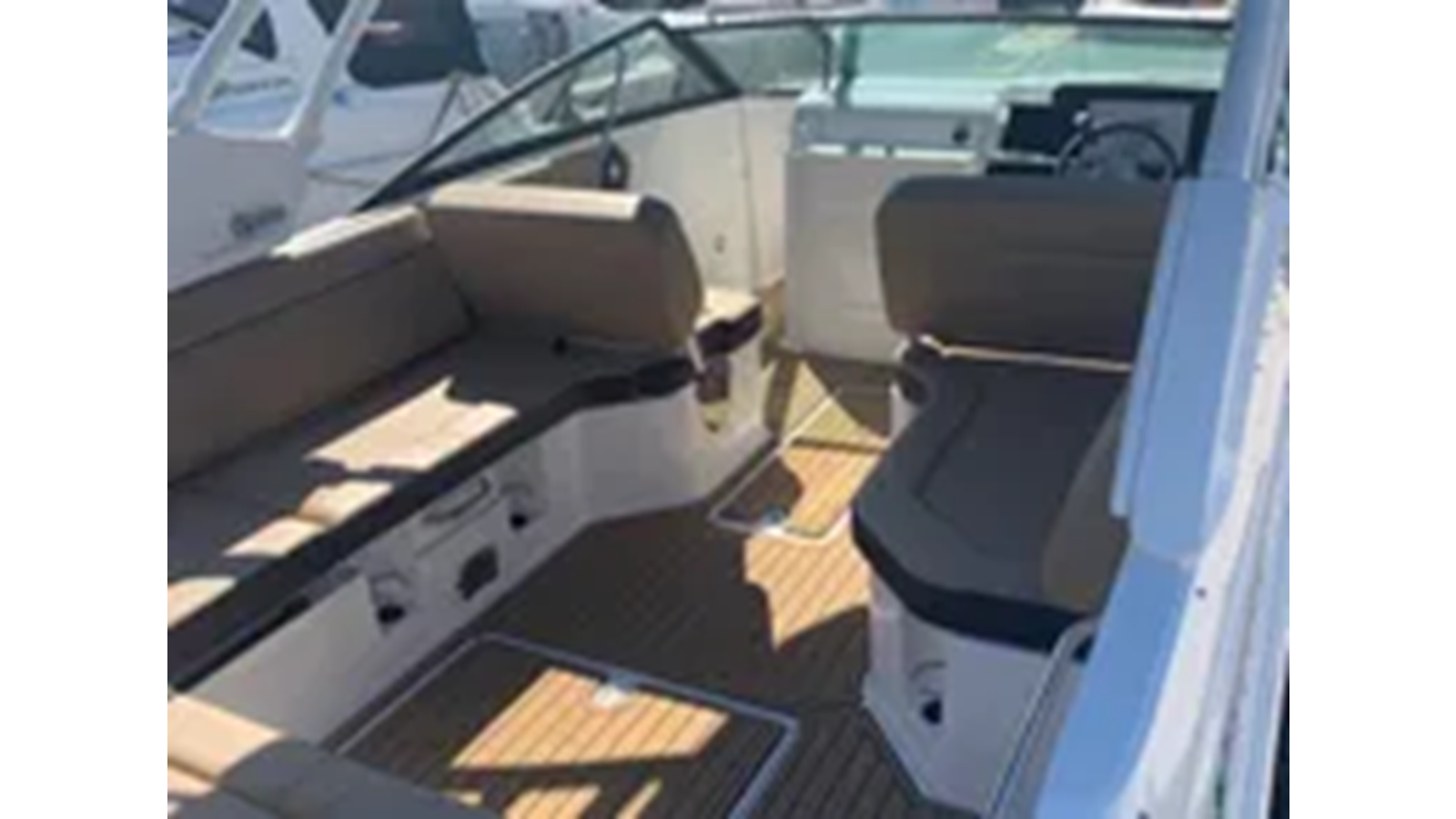 Bow w/ Aft and Forward facing seating; Double Helm Seat w/ Reversible Backrest, Flip-Up Thigh Rise & Fiberglass Base; Double Port Companion Seat w/ Reversible Backrest, Flip-Up Thigh Rise & Fiberglass Base; Port L-Shaped Lounger & Storage; Transom Sunpad w/ Reversible Backrest & Storage