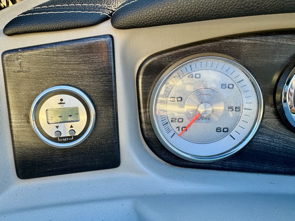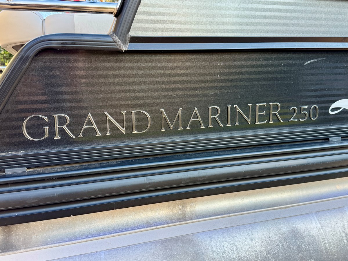 This Fresh Water 2016 Harris Grand Mariner 250 SLEC Tritoon For Sale near Norris Lake Tennessee is equipped with a 300HP Mercury Pro Verado 4-Stroke Super Charged Outboard Motor that provides a top speed over 45MPH and features the SLEC floorplan with a single rear lounge with entertainment center, the performance level 3 upgrade, a ski tow bar, 12' bimini top, mooring cover w/EZ clips, aluminum under skin, 6'' lifting strakes, 25'' diameter pontoons, pillow top upholstery upgrade, woven vinyl sea grass flooring, a garmin gps/chartplotter/depth/fish finder, mercury smartcraft mercmonitor gauge with integrated engine and fuel economy data, mercury's digital throttle and shift controller (DTS), power assisted steering, a double-lux driver's helm seat with upgraded euro tilt steering wheel, pull-out under helm storage drawer, an upgraded polk audio diamond stereo package with (8)speakers, (2)amps, a subwoofer, and 3 stereo remotes, (3)integrated self-draining ice chests, upholstered interior fence panels, (19)total cupholders, a lighting package with docking, interior/courtesy, cupholders, bimini top, swim ladder, and exterior under deck lights, a 2024 tandem axle trailer with brakes is included and much more!