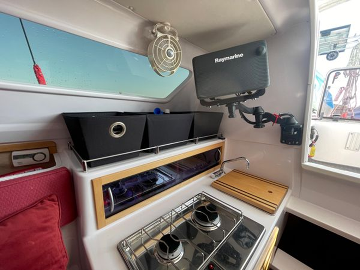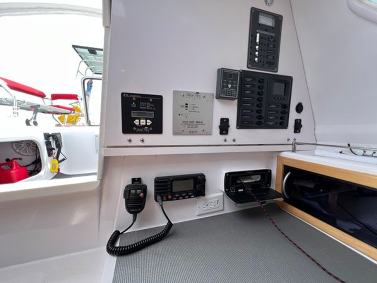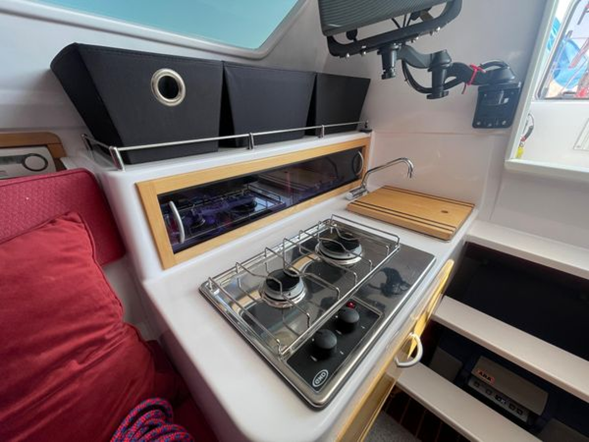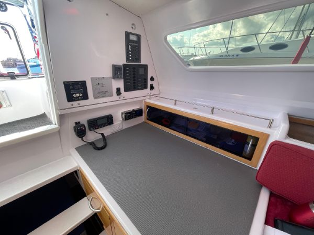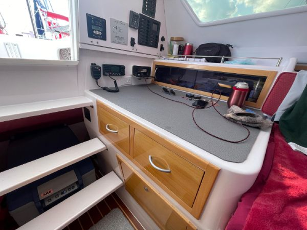 The Corsair 970 is a center cockpit design with the accommodations separated by the cockpit. Forward is a V-berth followed by the head compartment. Next aft is the salon area with settees on port and starboard with storage outboard of the settees. There is a swing table that can be moved around the salon or moved out into the cockpit area. Aft of the salon is the galley on starboard and a navigation/chart table area on port. Up three steps to the cockpit area. Aft of the cockpit access is gained through aft cabin through a deck hatch between the two helm seats. “Merlot” has been optimized for comfortable cruising. Enhancements include the Tides Marine Strong Track which significantly reduces the effort of raising or reefing the mainsail; the Mack Pack sail storage system makes putting the mainsail away quick and easy; custom arch supports 2 high capacity 150W solar panels keep the batteries topped up allowing the fridge to be run 24x7 and still sail with the tiller pilot; dinghy davits on the arch; high quality 12" touch screen chartplotter; full dodger / bimini cockpit enclosure and more!