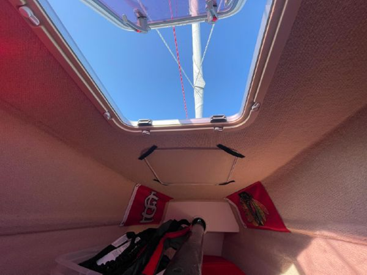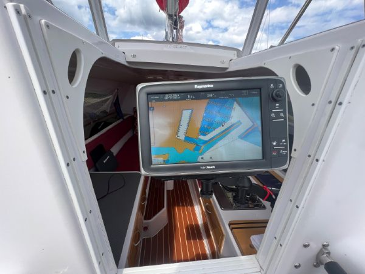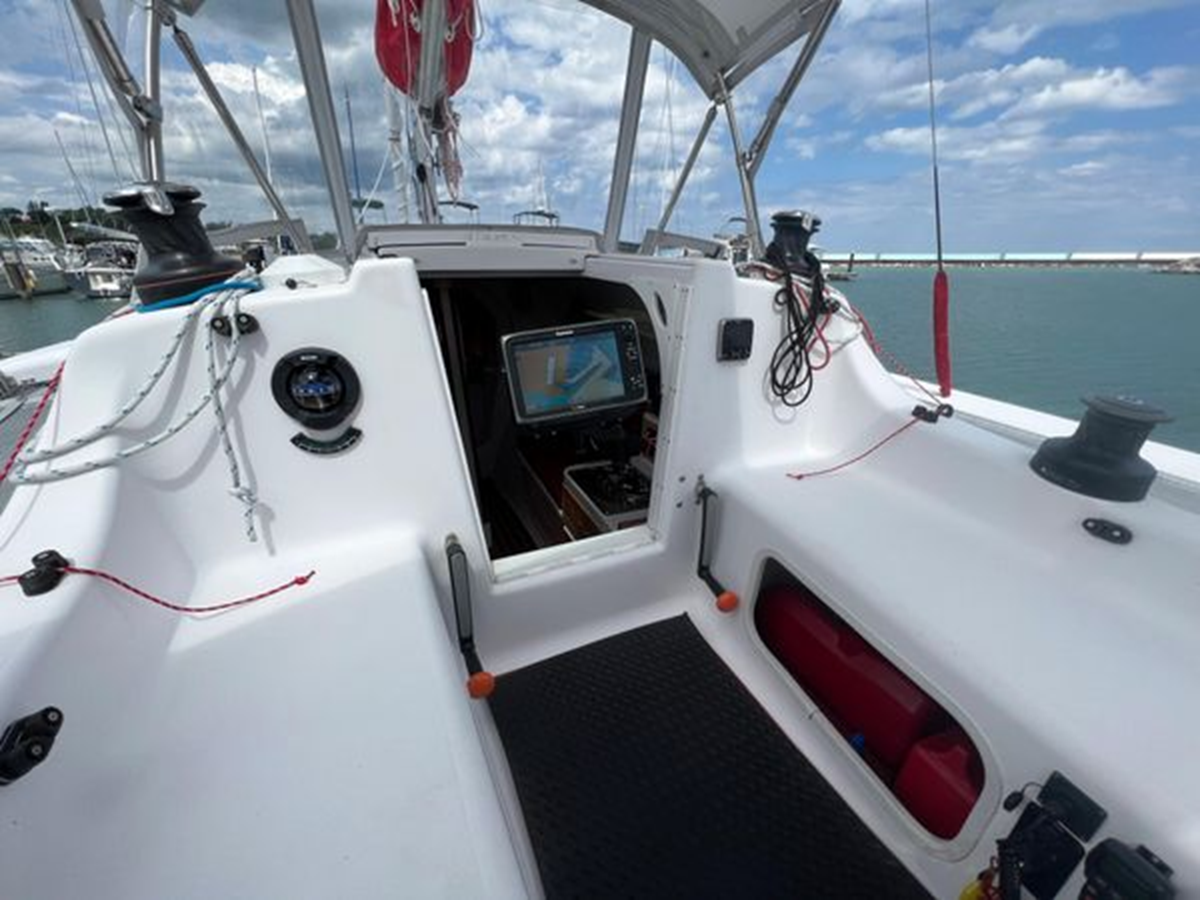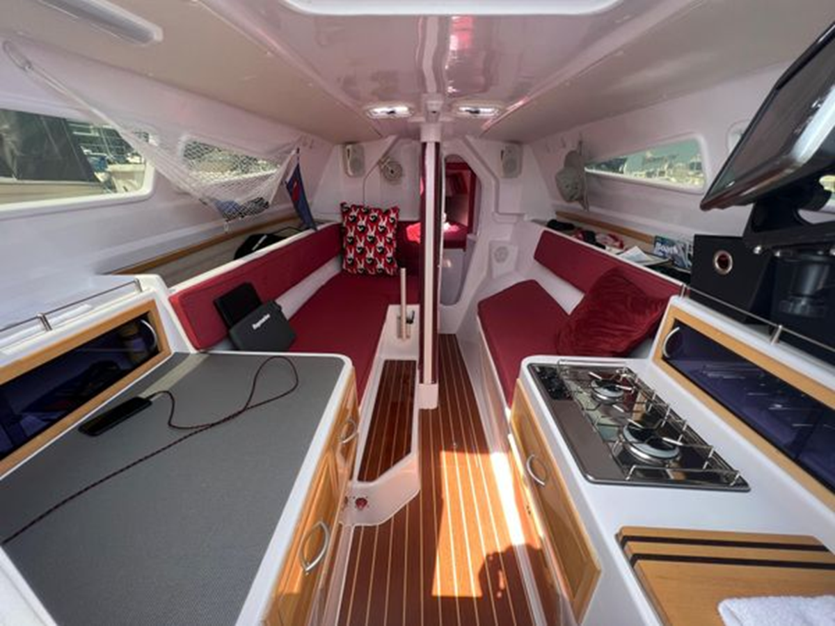 The Corsair 970 is a center cockpit design with the accommodations separated by the cockpit. Forward is a V-berth followed by the head compartment. Next aft is the salon area with settees on port and starboard with storage outboard of the settees. There is a swing table that can be moved around the salon or moved out into the cockpit area. Aft of the salon is the galley on starboard and a navigation/chart table area on port. Up three steps to the cockpit area. Aft of the cockpit access is gained through aft cabin through a deck hatch between the two helm seats. “Merlot” has been optimized for comfortable cruising. Enhancements include the Tides Marine Strong Track which significantly reduces the effort of raising or reefing the mainsail; the Mack Pack sail storage system makes putting the mainsail away quick and easy; custom arch supports 2 high capacity 150W solar panels keep the batteries topped up allowing the fridge to be run 24x7 and still sail with the tiller pilot; dinghy davits on the arch; high quality 12" touch screen chartplotter; full dodger / bimini cockpit enclosure and more!