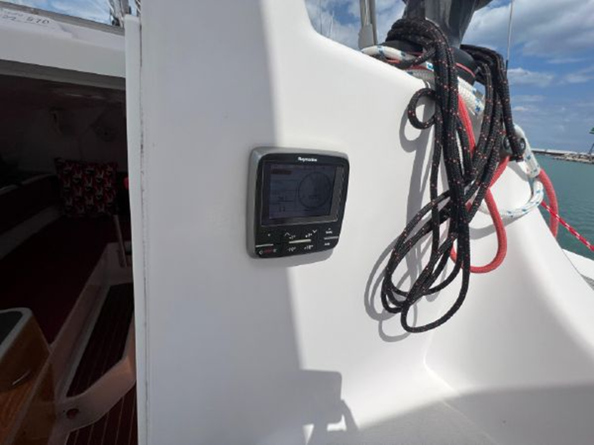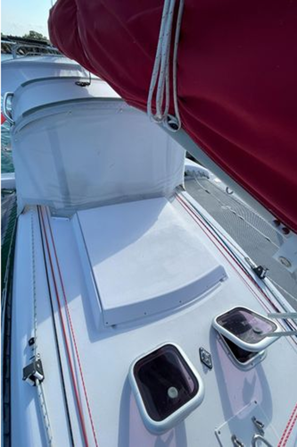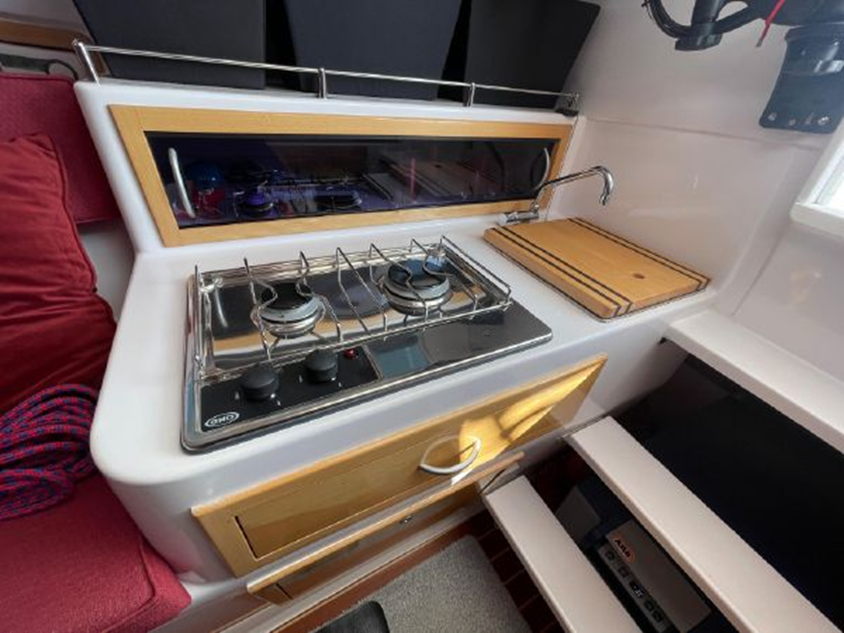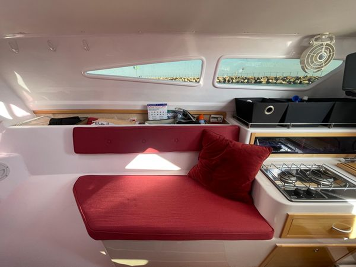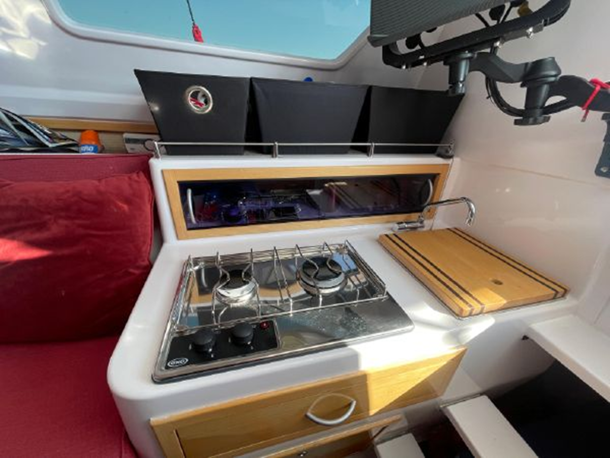 The Corsair 970 is a center cockpit design with the accommodations separated by the cockpit. Forward is a V-berth followed by the head compartment. Next aft is the salon area with settees on port and starboard with storage outboard of the settees. There is a swing table that can be moved around the salon or moved out into the cockpit area. Aft of the salon is the galley on starboard and a navigation/chart table area on port. Up three steps to the cockpit area. Aft of the cockpit access is gained through aft cabin through a deck hatch between the two helm seats. “Merlot” has been optimized for comfortable cruising. Enhancements include the Tides Marine Strong Track which significantly reduces the effort of raising or reefing the mainsail; the Mack Pack sail storage system makes putting the mainsail away quick and easy; custom arch supports 2 high capacity 150W solar panels keep the batteries topped up allowing the fridge to be run 24x7 and still sail with the tiller pilot; dinghy davits on the arch; high quality 12" touch screen chartplotter; full dodger / bimini cockpit enclosure and more!
