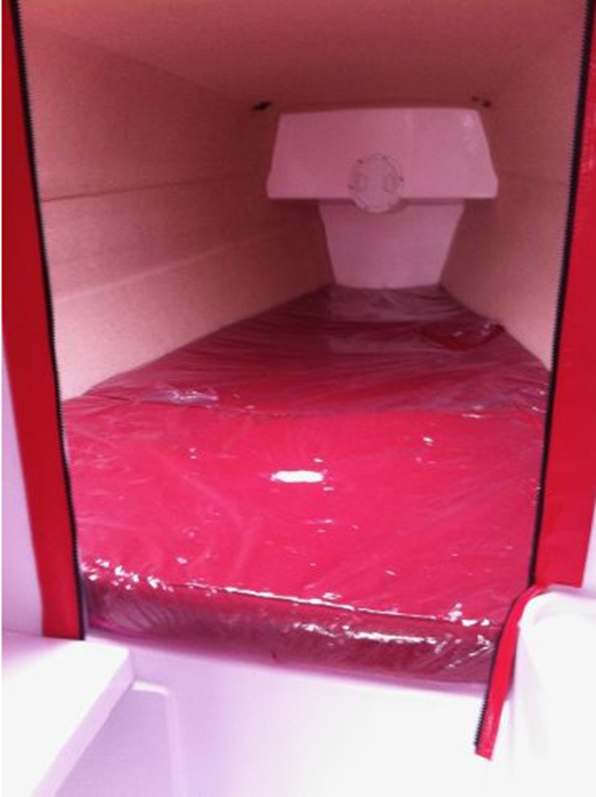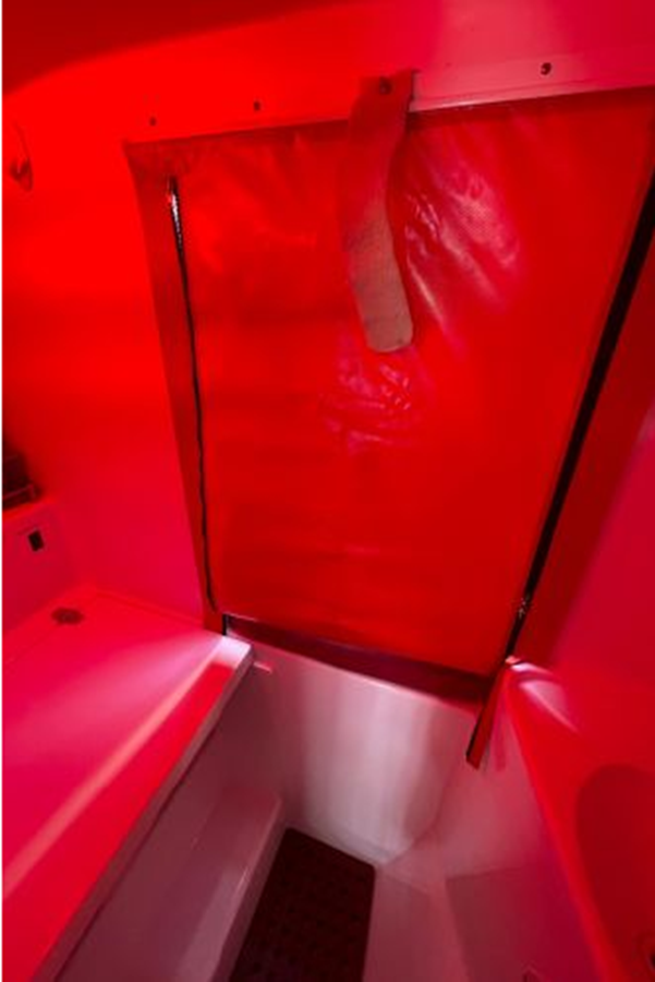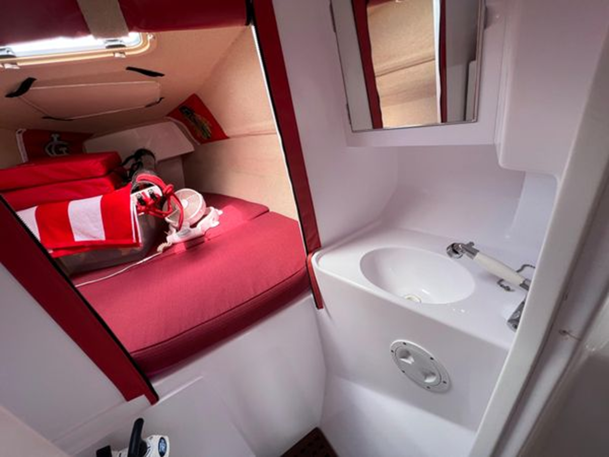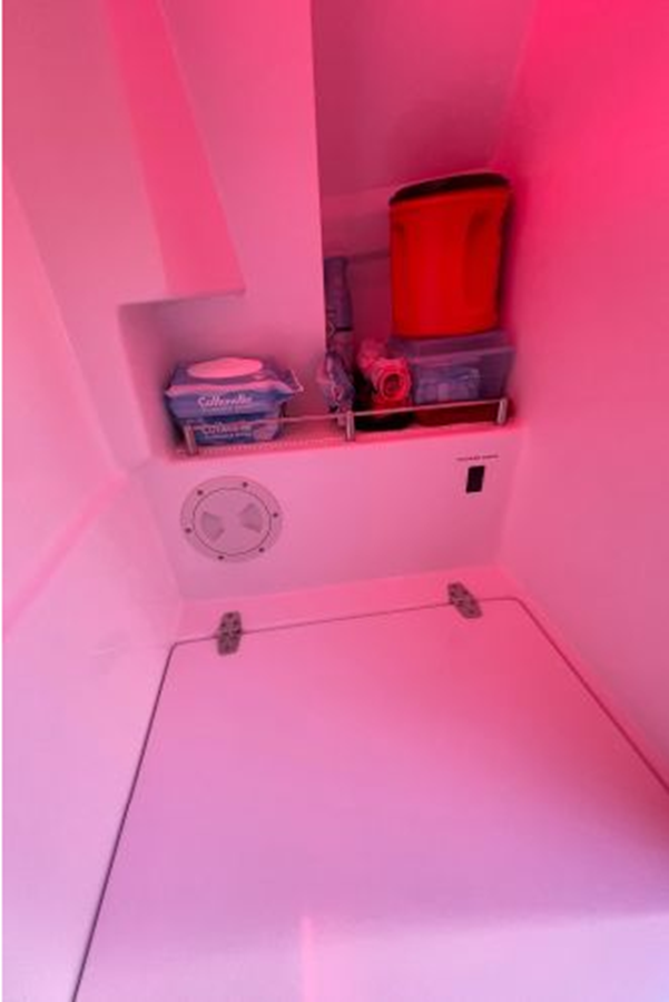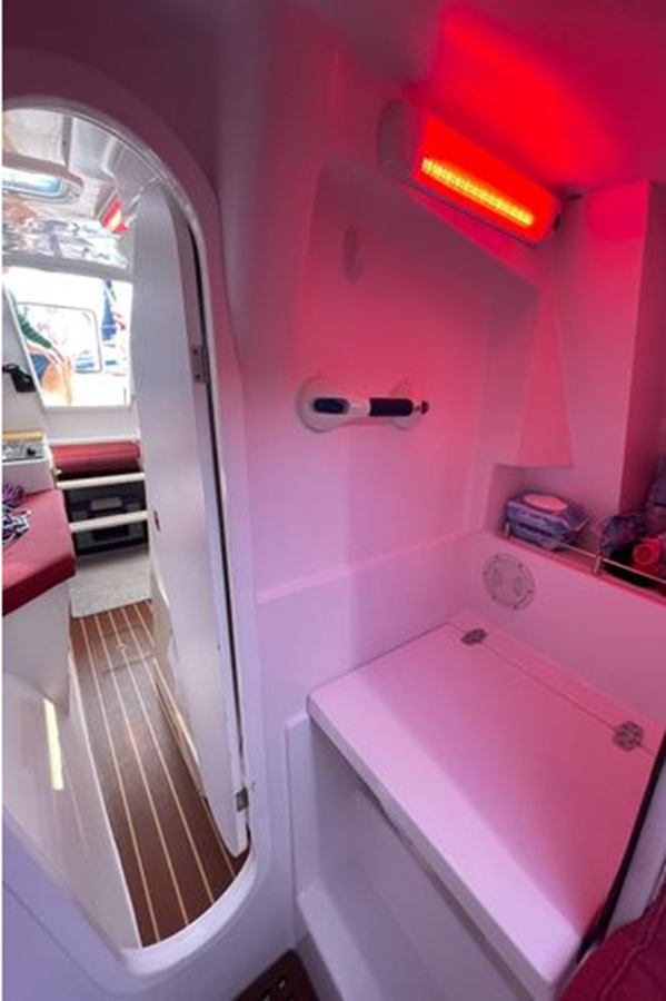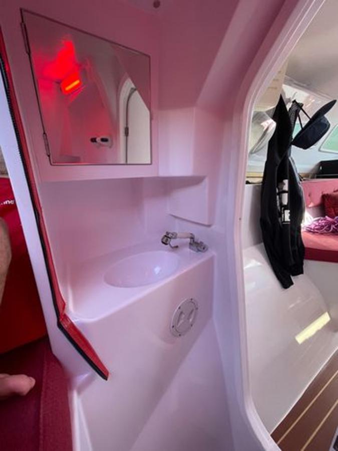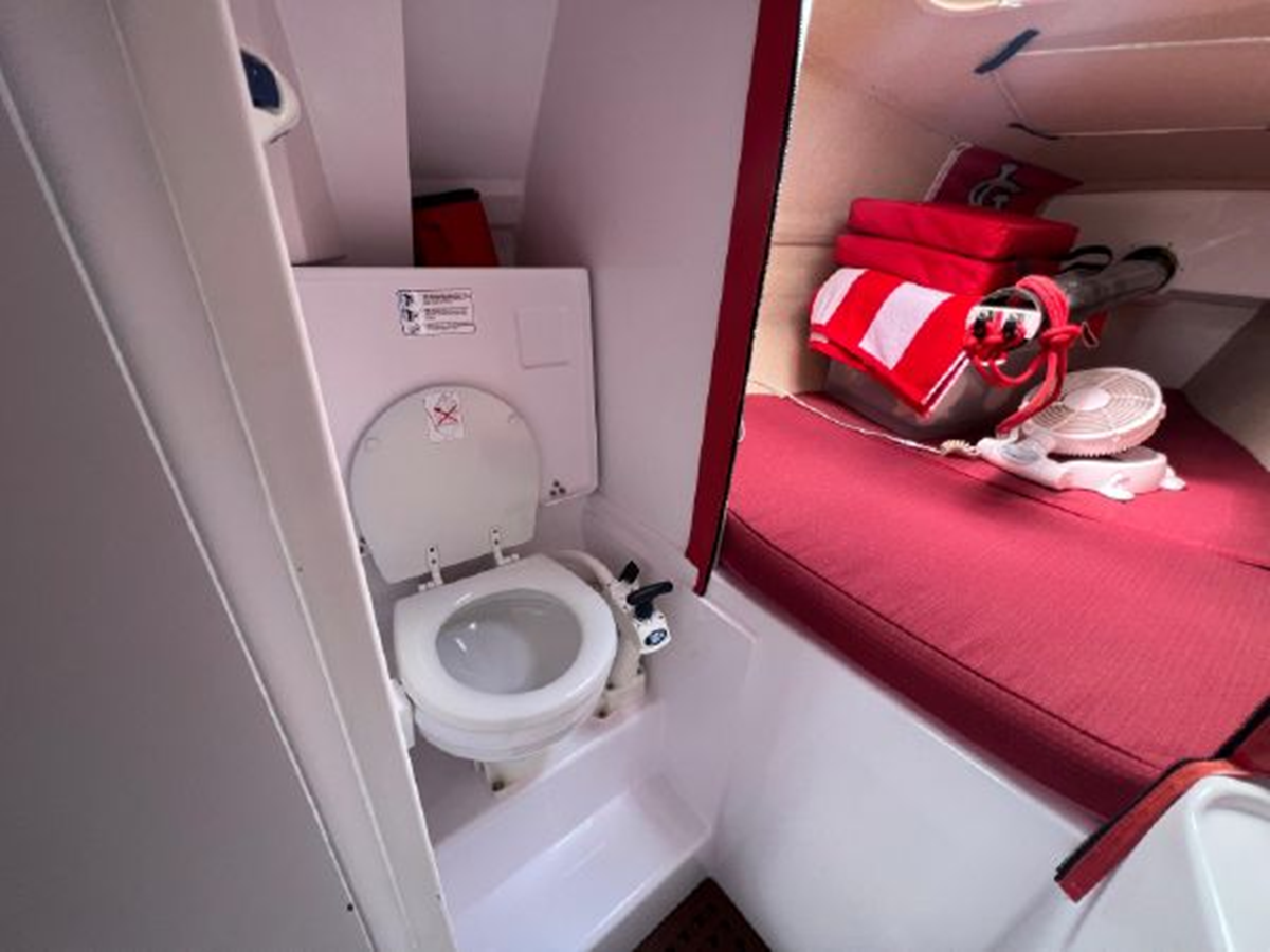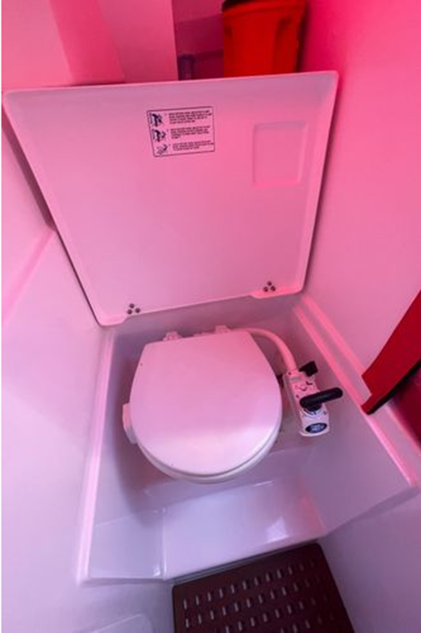 • Dedicated fully enclosed toilet area including a Jabsco toilet, holding tank, sink, vanity and pressurized cold water. The sink faucet doubles as a shower head.