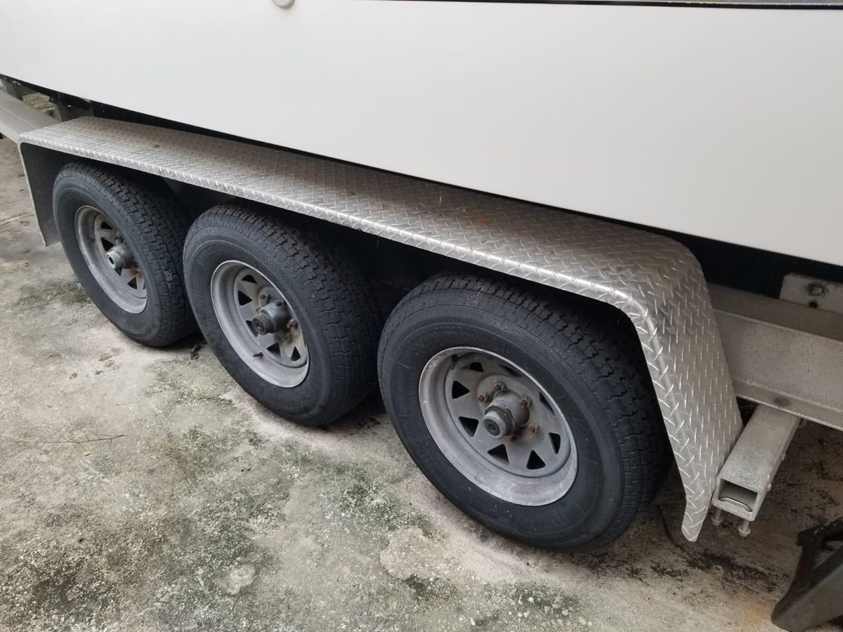 Fuel capacity is 160 gallons, with a 41-gallon water tank and a 20-gallon holding tank. The cabin offers accommodations for up to six people, along with a galley, enclosed head, and ample storage throughout. Bridge clearance with the radar arch is 8 feet 7 inches.