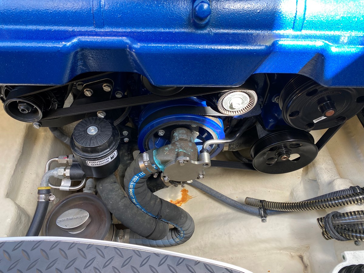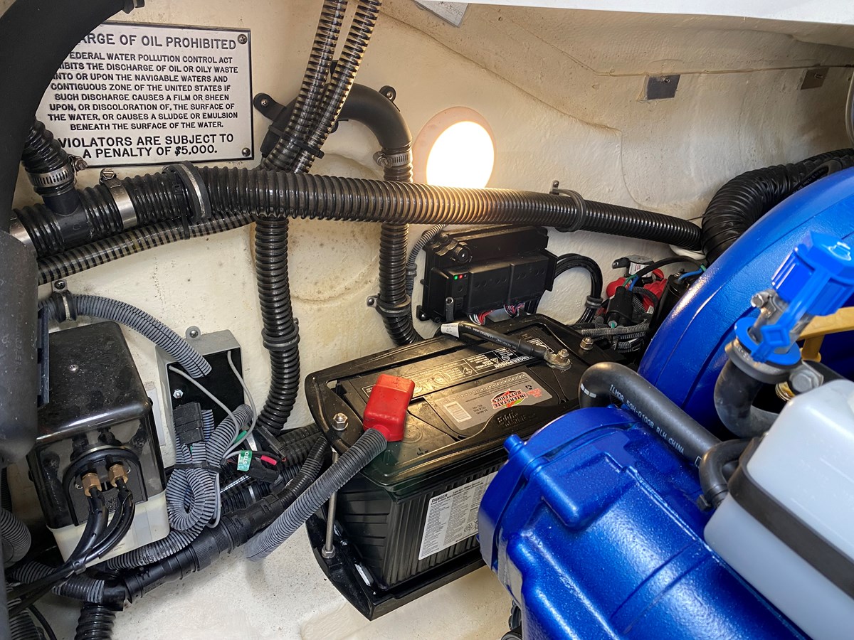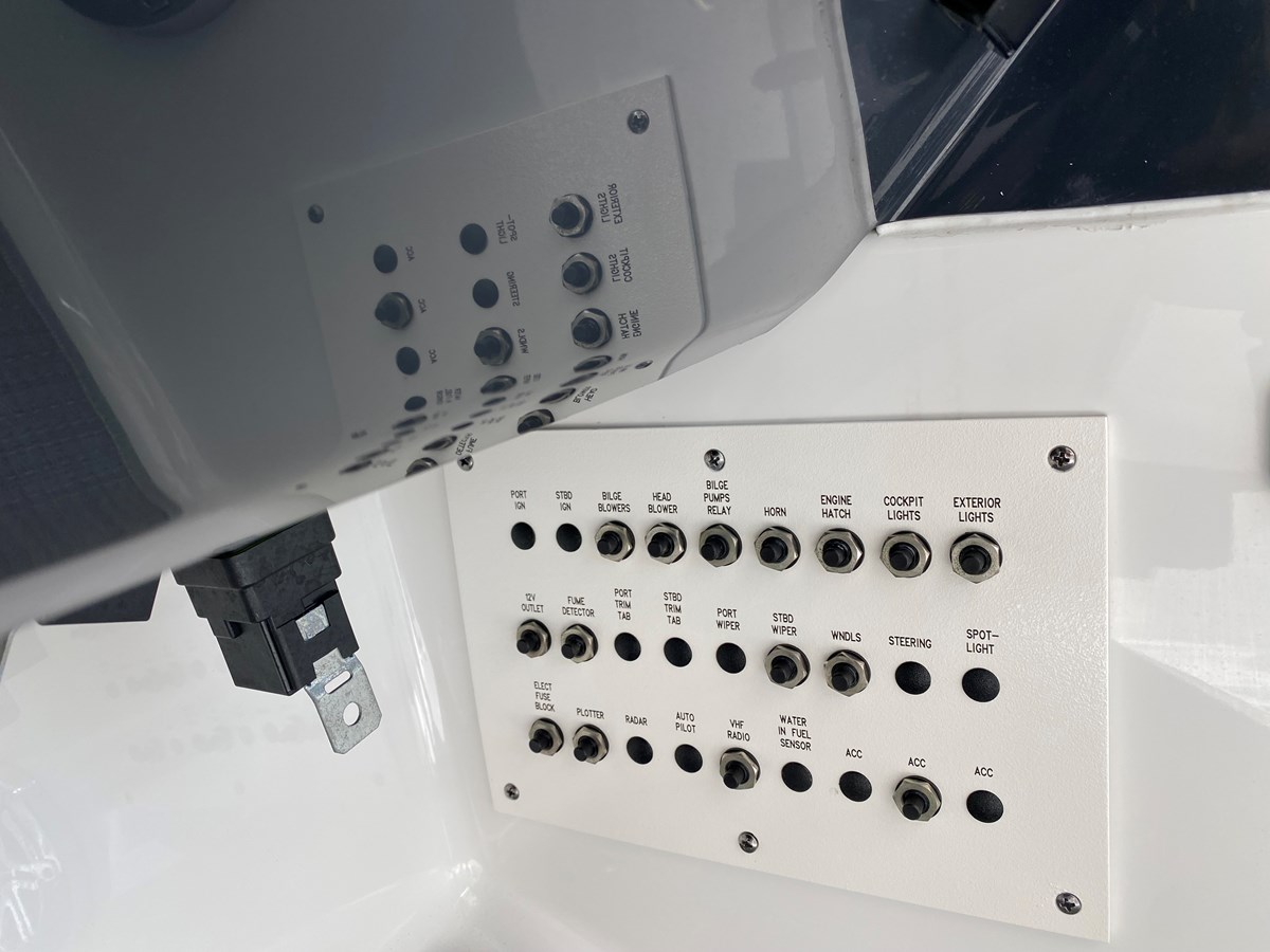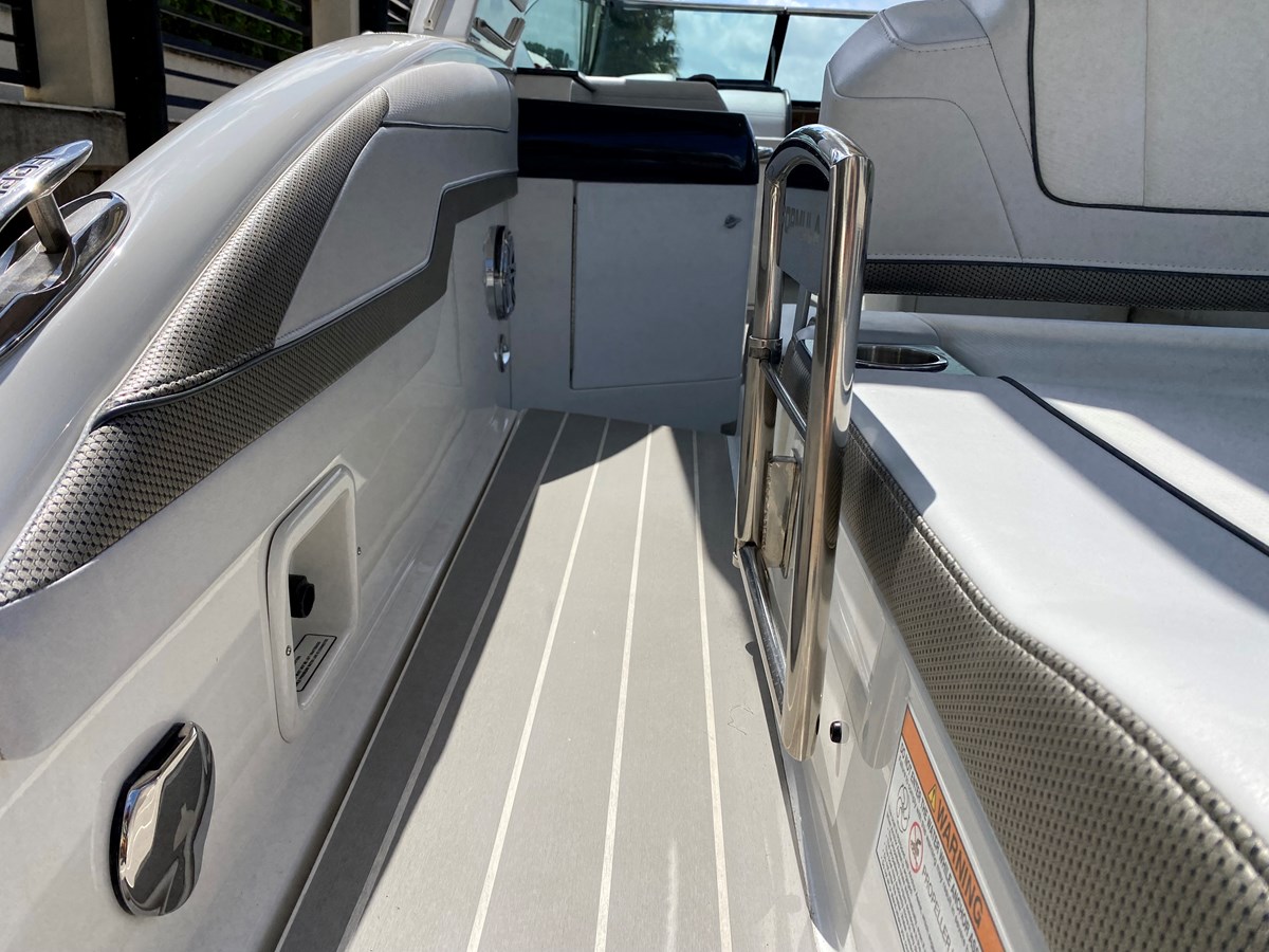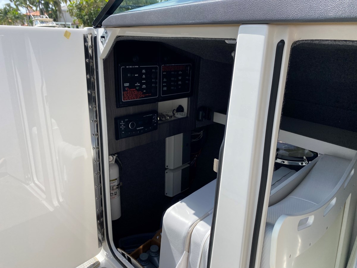 At the helm, you’ll appreciate the double-wide seat that pivots to face aft when the occasion calls for socializing. The dash is dominated by a Raymarine Axiom Pro 9 S chart plotter, with additional space for engine-specific displays. Modern conveniences like a wireless charging pad and multiple USB ports ensure you stay connected while on the water.