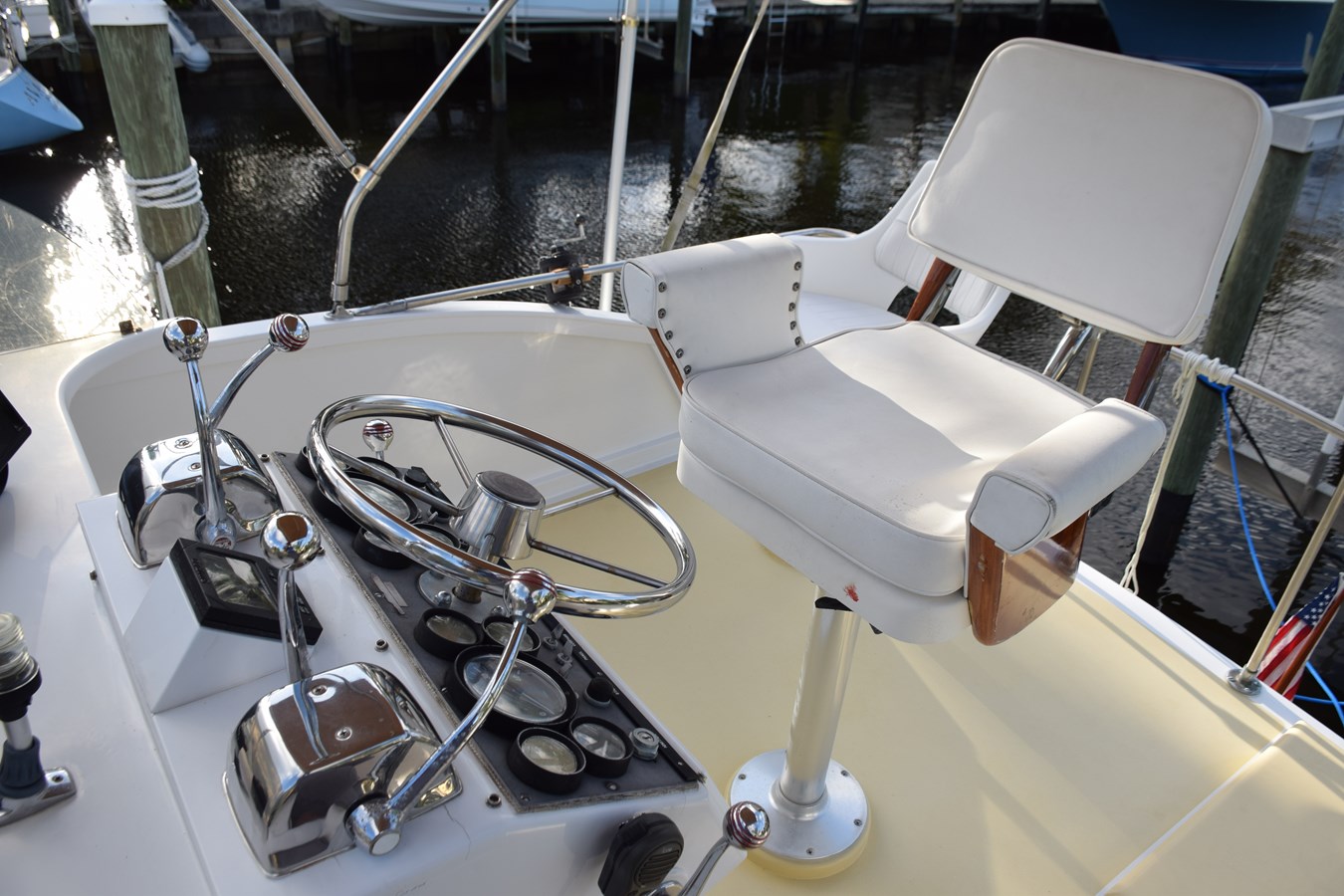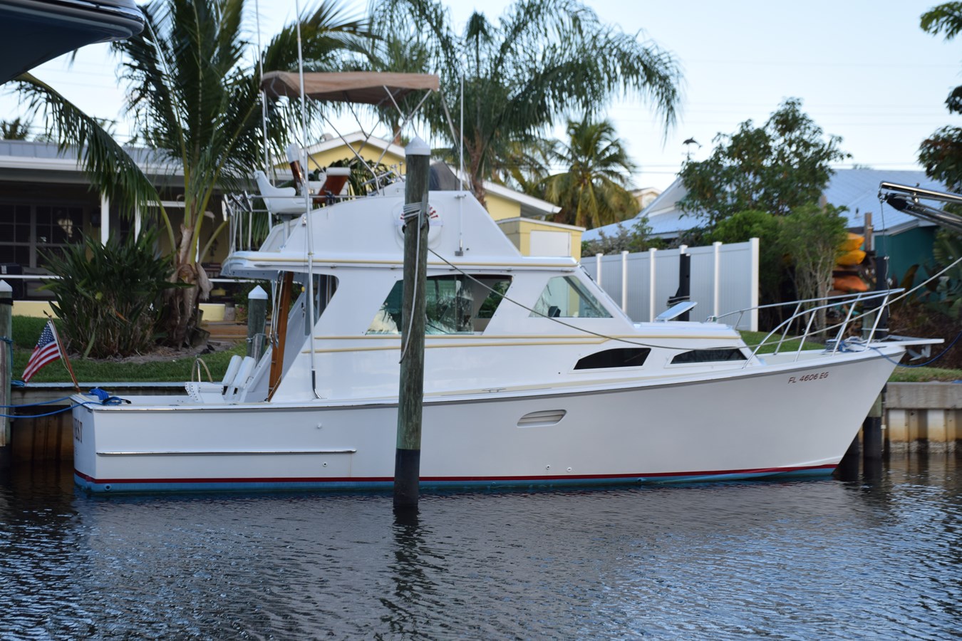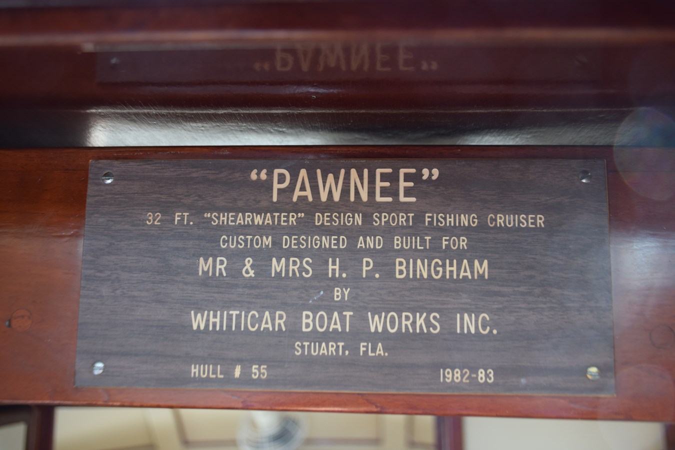 A unique classic trunk cabin sportfish convertible which has only had three owners since new and always lived in the Treasure Coast of FL area. Built by Whiticar Boatworks and completed at the beginning of 1983, this is Hull #55. She got a new pair of Cummins 6BT 5.9 liter diesels 210hp each in 1990, which still have under 690 original hours. In 2005 she had a full paint job. The 2nd owner bought the boat in 2006 and named her EAGLES NEST. He made many general improvements through the builder until health challenged his abilities to continue with it, which is when it sold to the current owner in September of 2024. The current owner has restored the vessel thoughtfully with focus on keeping its original character. The boat came out of a boatyard visit in June of 2025 with new antifouling and several other updates. Most photos on this spec are recently taken, and the boat can be easily seen at her present berth on Hutchinson Island, FL.