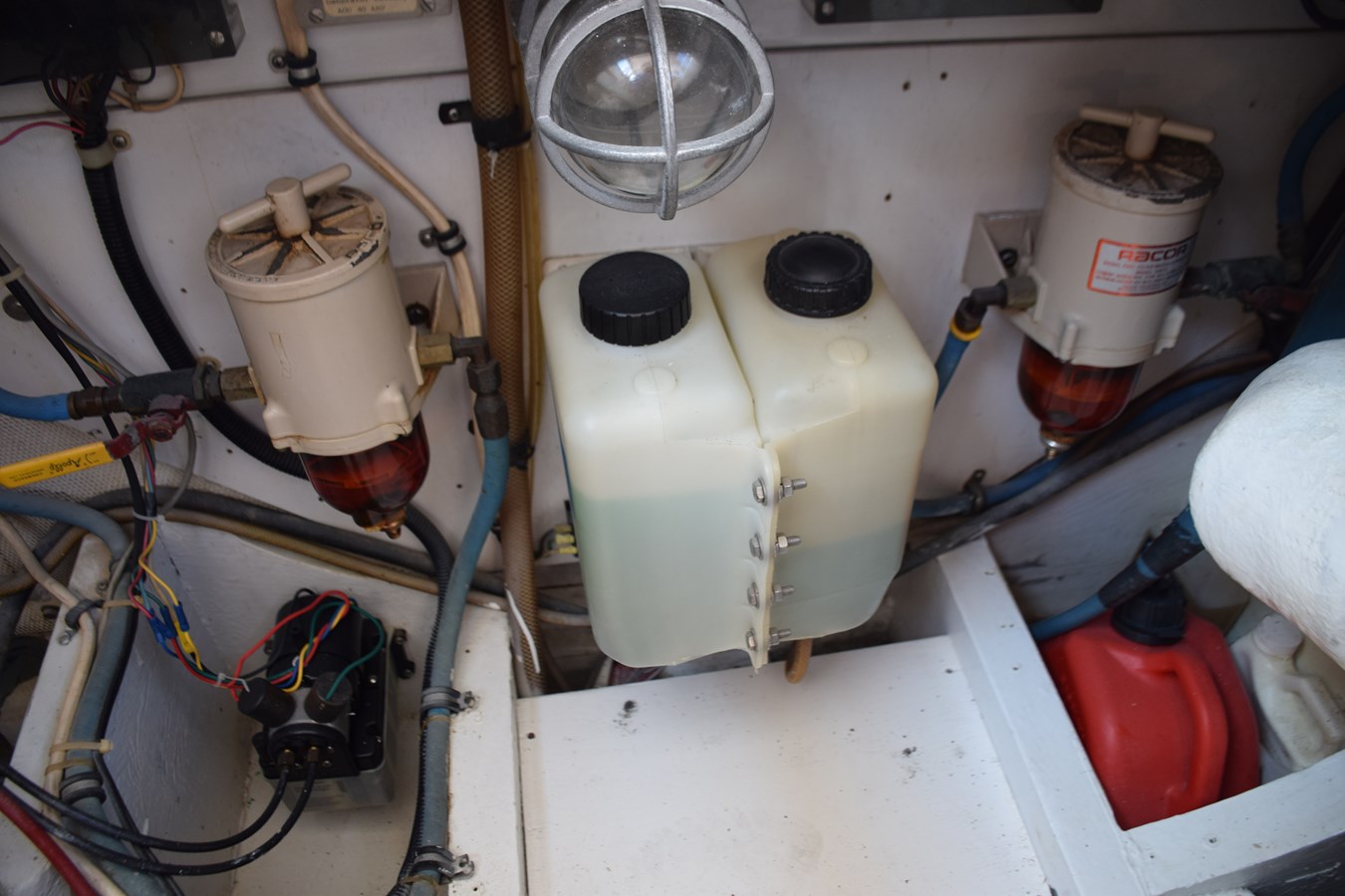 - Main engines were installed by Whiticar in 1990 and are Cummins 5.9 liter BTs at 210hp each and have approximately 688 running hours since install. They have Twin Disc MG 502-1 transmissions with trolling valves. Reported to be very economical with possibly only 10 gallons per hour burn at reasonable cruising speed.