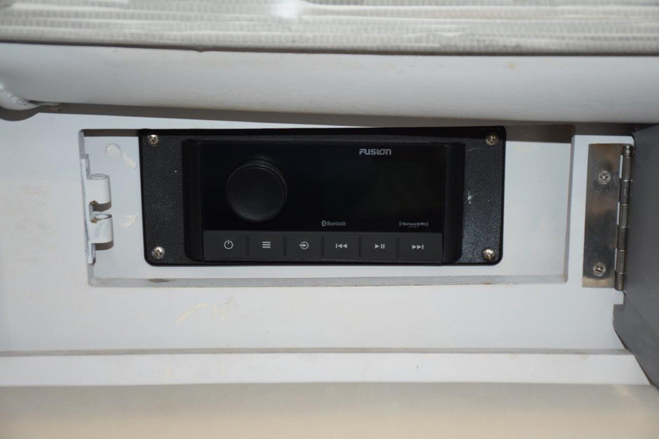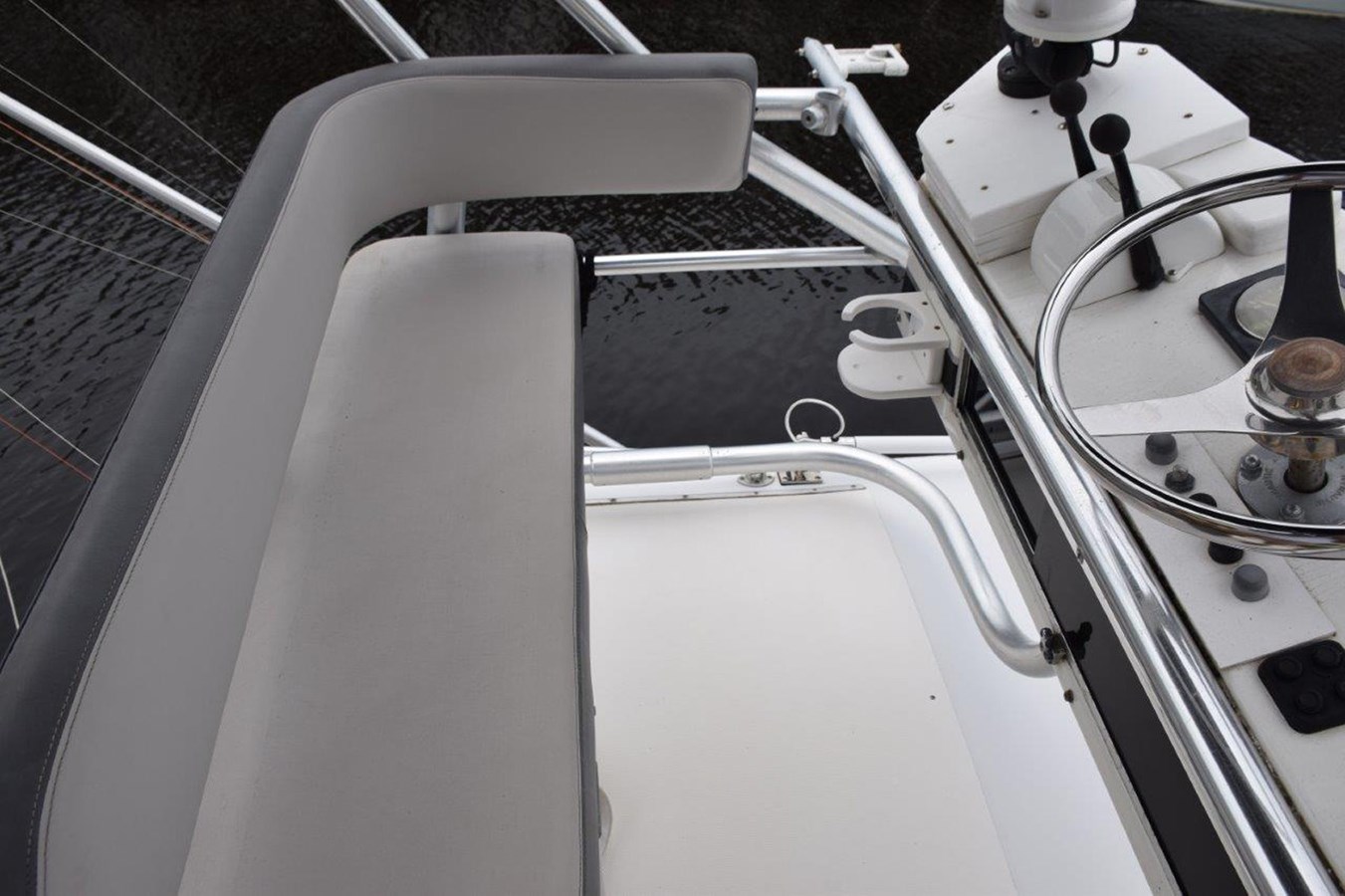 The cabin has been updated with one feature being a brand-new headliner over the forward berth area and a newer Dometic reverse-cycle A/C unit with digital thermostat. The sole is a grey SeaDek with white margins and there is a U-shaped dinette to the starboard side with a granite table-top. All the cushions here as well as on the helm deck are newer vinyl covered in two-tone color scheme. There is a Samsung flat panel TV mounted outboard behind the dinette on a wallpapered wall. Below on a shelf is a Samsung BluRay CD player and in the next cabinet over a newer Fusion Stereo unit. On the aft bulkhead by the dinette is the main electrical panel with generator control, shore power switching, and a water tank meter. Just forward of the dinette is another granite countertop which separates the berth area. In the cabinet below is a hanging locker. Across on the portside is the galley area with Corian countertop with circular stainless sink and a portion of the counter flips up for a 2-burner electric stovetop. An Isotherm refrigerator and GE microwave are next aft. To the rear on the portside is the door to the head with Corian vanity top and sink. Aft of the galley is another granite countertop with drawer and cabinet below. Next is the berth area which is a full size with a filler cushion section. An overhead deck hatch gives natural lighting.