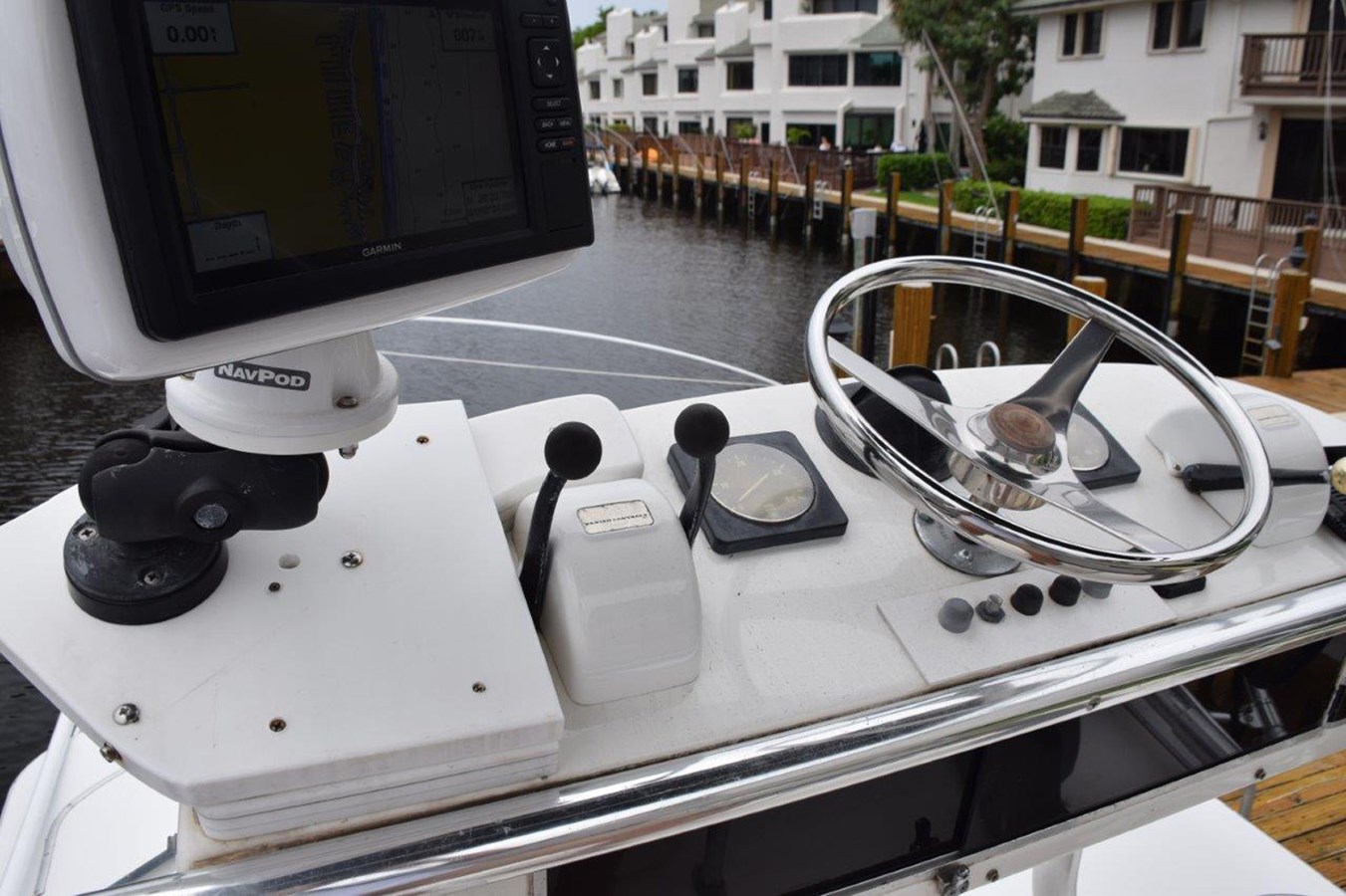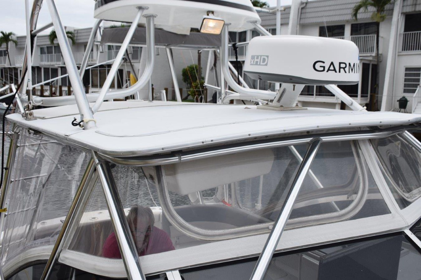 - Marlin tower with full control upper helm station - tower has bench seat, canvas buggy top, and fiberglass control box. Tower is open on the starboard side which can be walked through for easy access. Tower helm has tachs, start/stop switches, Panish throttle and clutch controls, trim tab controls, and Danforth magnetic compass. Control box has opening panel and starboard drink holder.