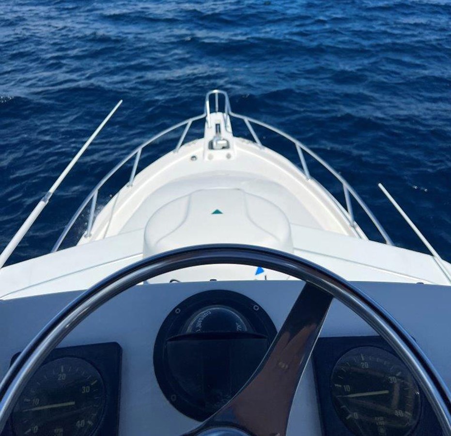 This express sportfisherman was built by the original Blackfin Yacht Company and features the solid fiberglass bottom, Deep Vee hull, designed by Charles Jannace. The model was called the 33 Combi and was recognized for offshore sea-ability due to a low center of gravity and hardy construction. On the helm deck there is an L-shape bench seat to the portside and a raised bench style helm seat starboard. A wraparound aluminum framed windshield has an isinglass 3-sided enclosure for weather protection. A hinged cabin door with a flip up tinted plexiglass top, which folds back out of the way, leads down to the cabin.