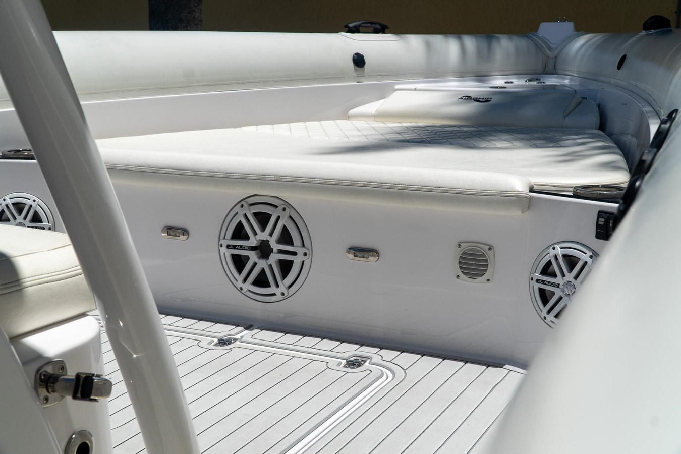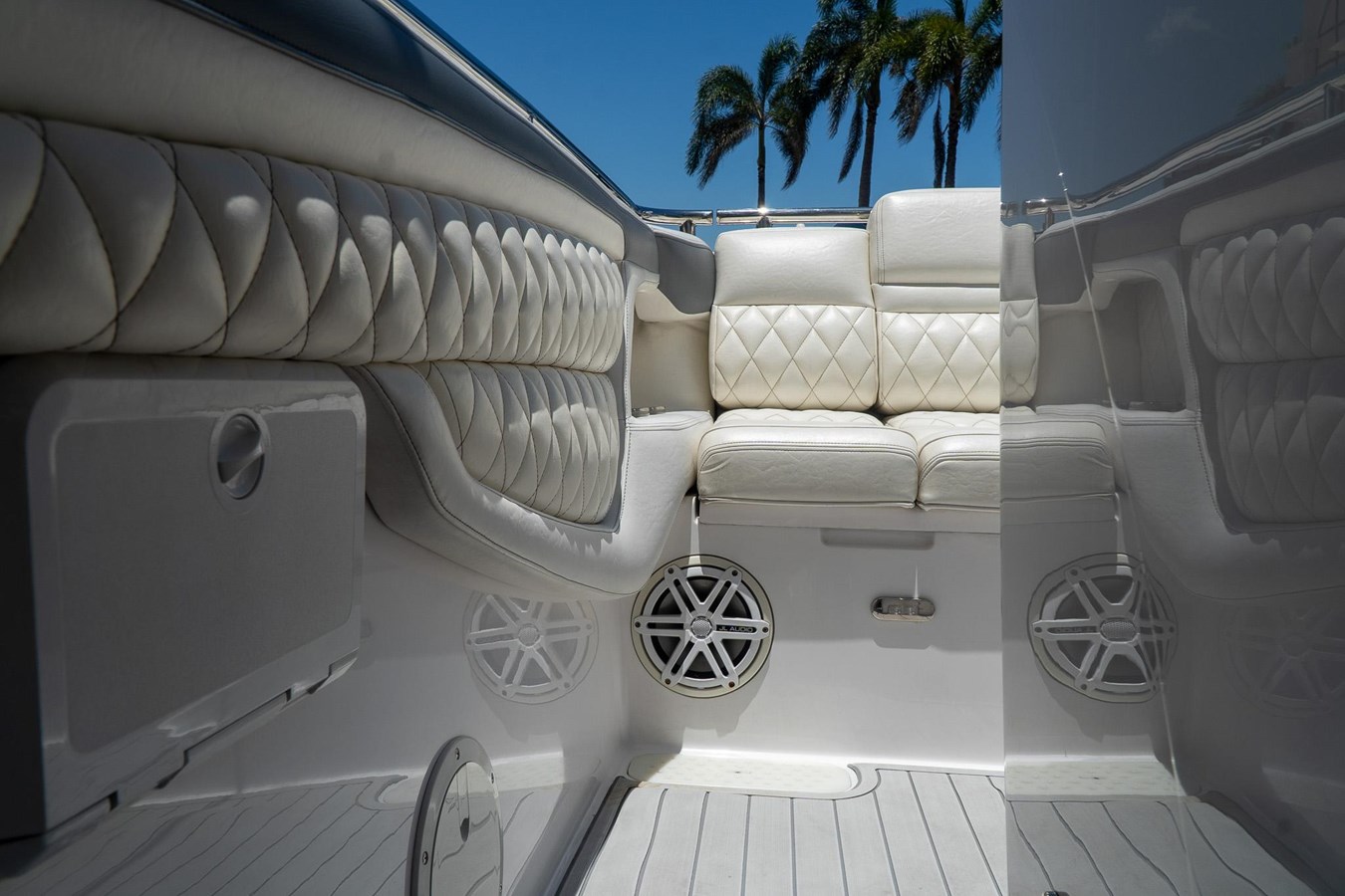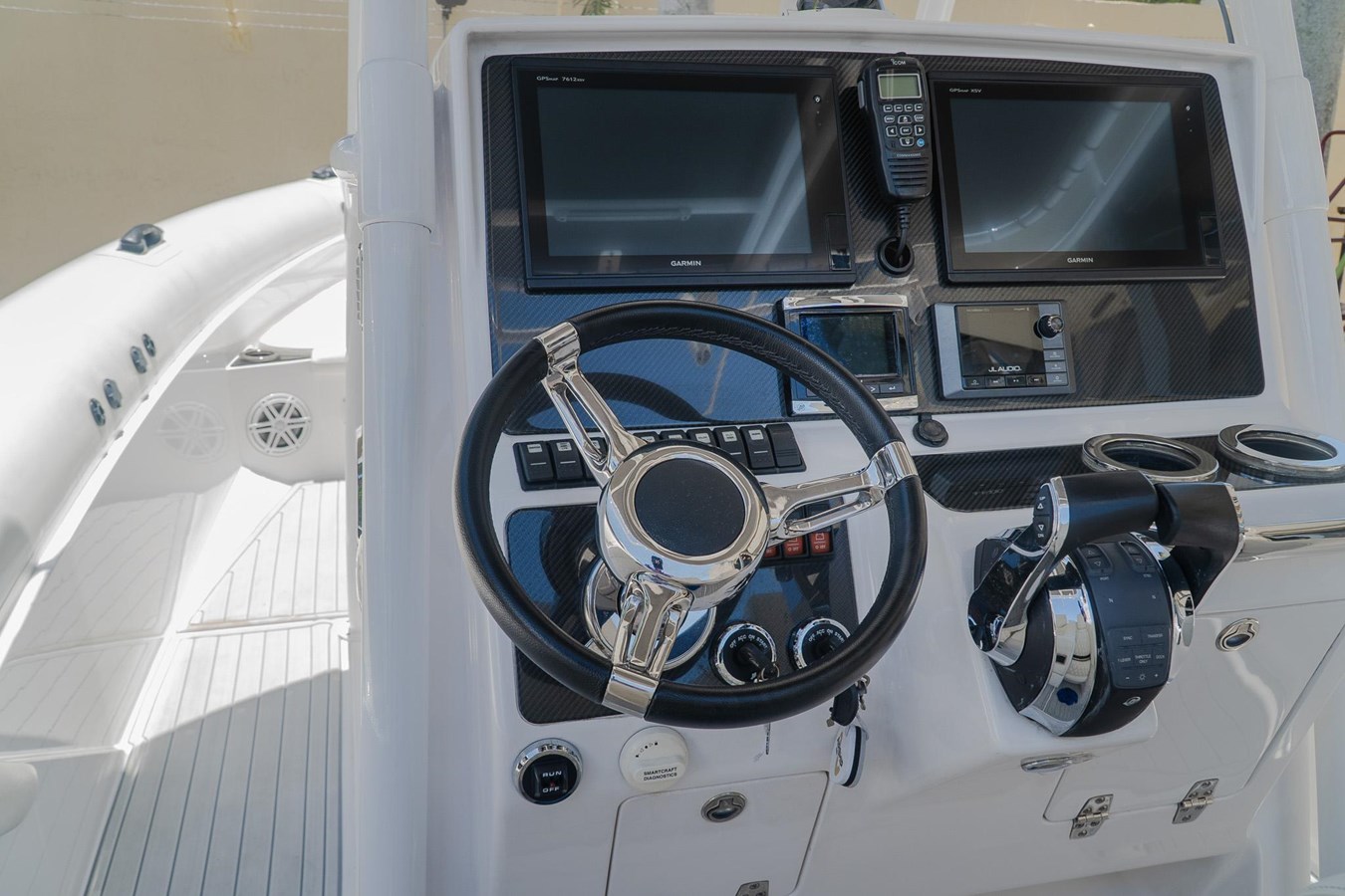 POWDER COATED T-TOP. DASH ELECTRIC REMOTE BATTERY SWITCHES. (4) JL AUDIO SPEAKERS (1) JL AUDIOSUB AND (1) JL AUDIO AMP. GARMIN TRANSDUCER. 2x GARMIN 7612. GARMIN RADAR DOME. GARMIN VHF RADIO. MERCURY VESSEL VIEW 4. GARMIN IN HULL TRANSDUCER. FRESH WATER TANK AND TRANSOM SHOWER. FWD STORAGE LOCKER. FULL BOAT COVER.
