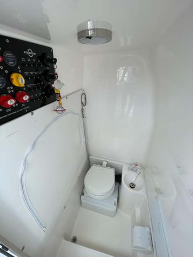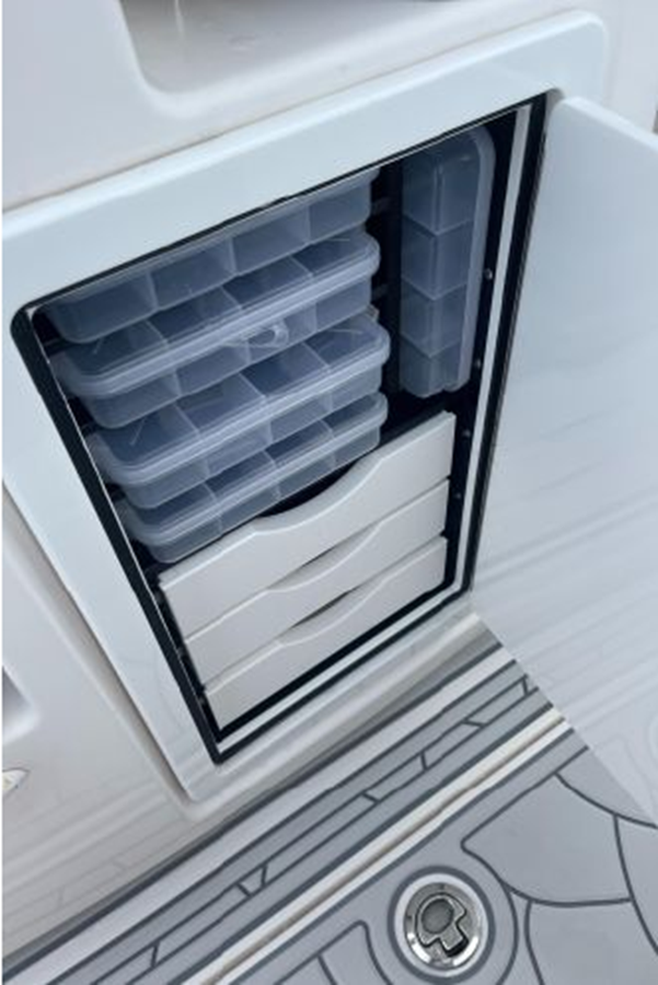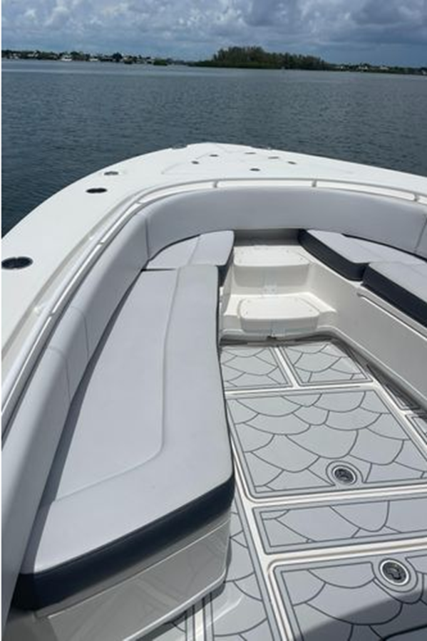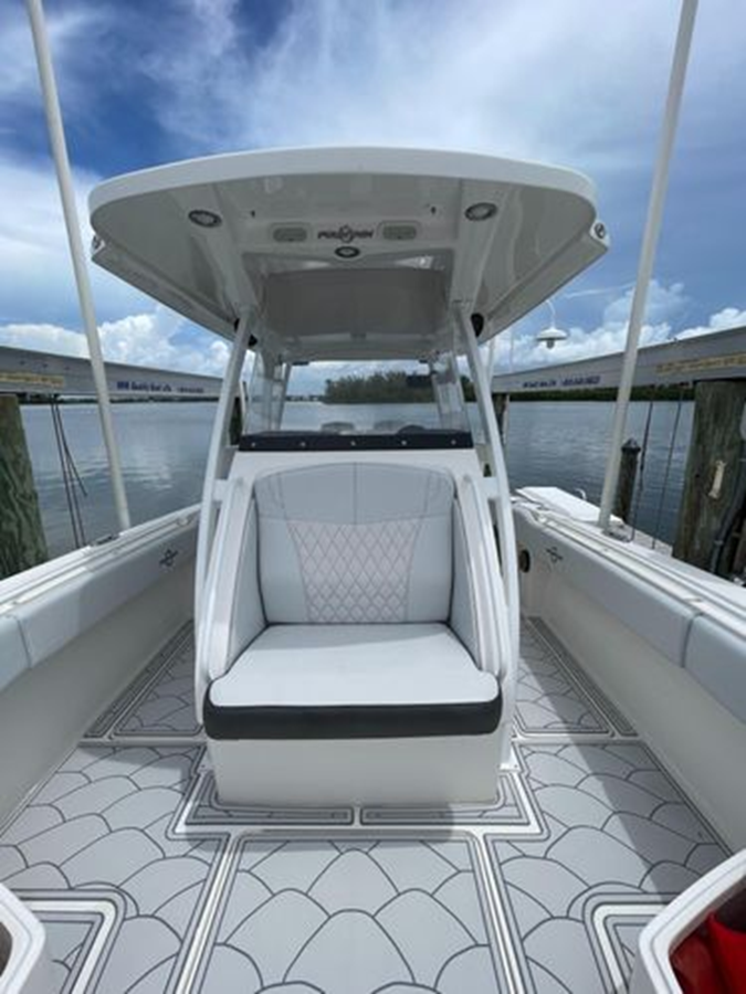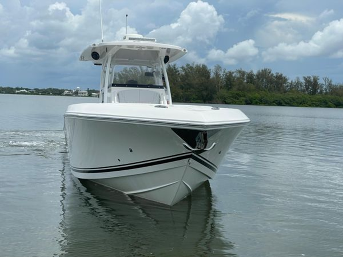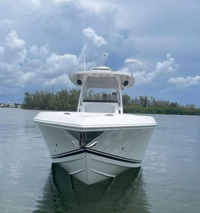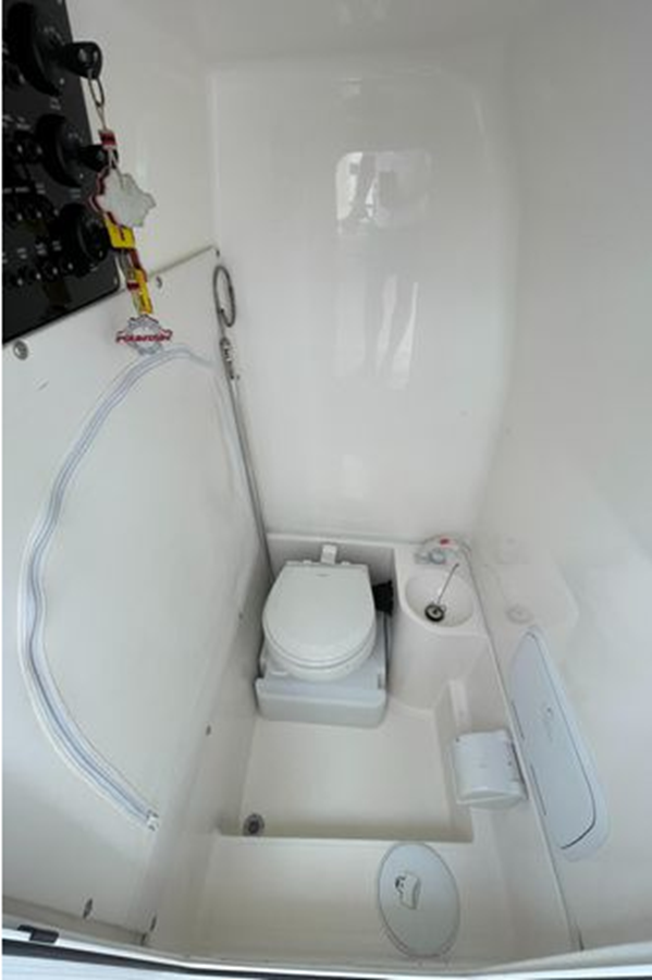 • Center Console - Pre-Wired, Fiberglass w/ Flush Mount Electronics Locker, One-Piece Plexiglass Windshield, Molded Footrest, Walk-In Head w/ VacuFlush, Shower, Sink & 25 qt Cooler Under Forward-Facing Seat