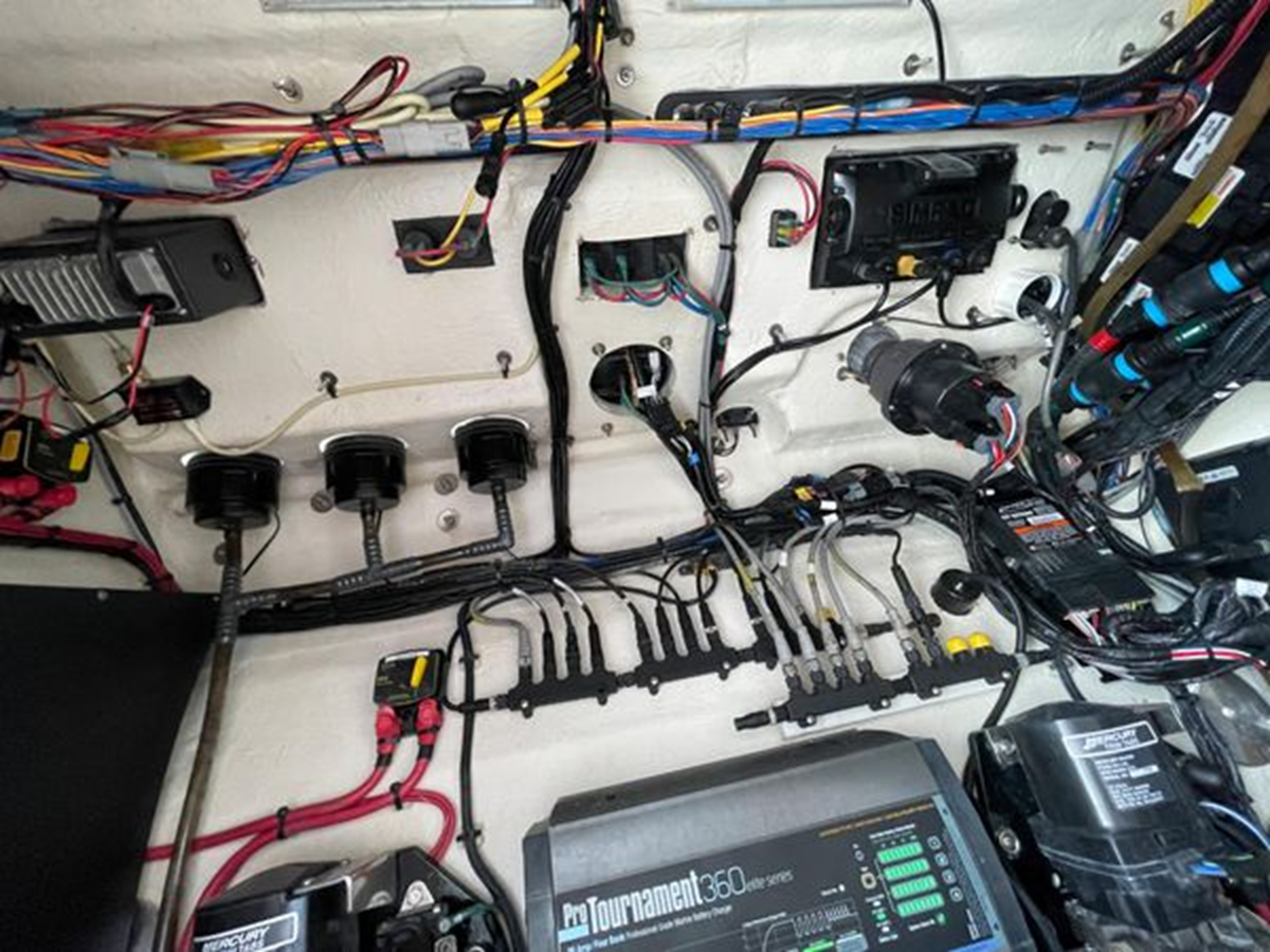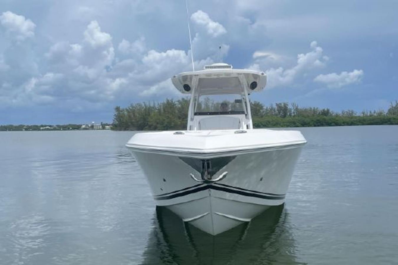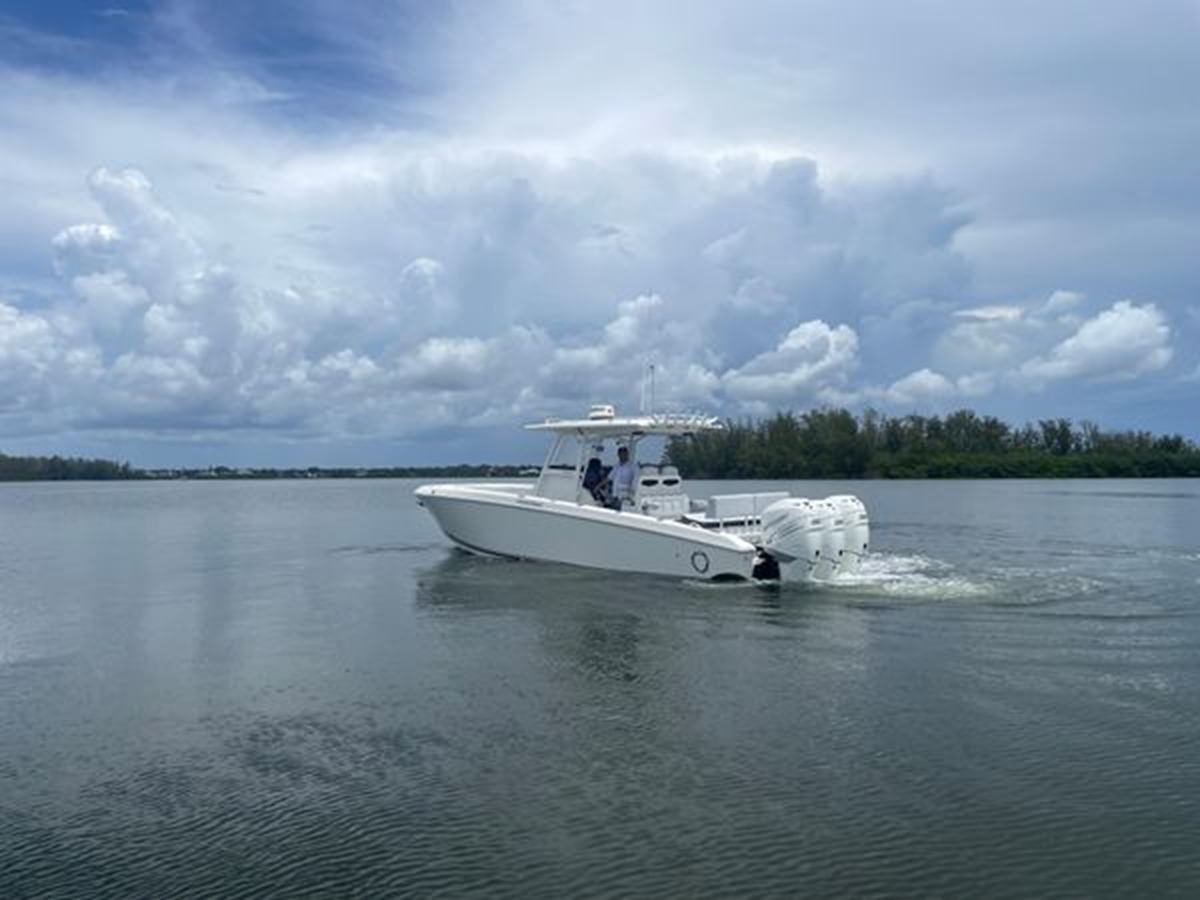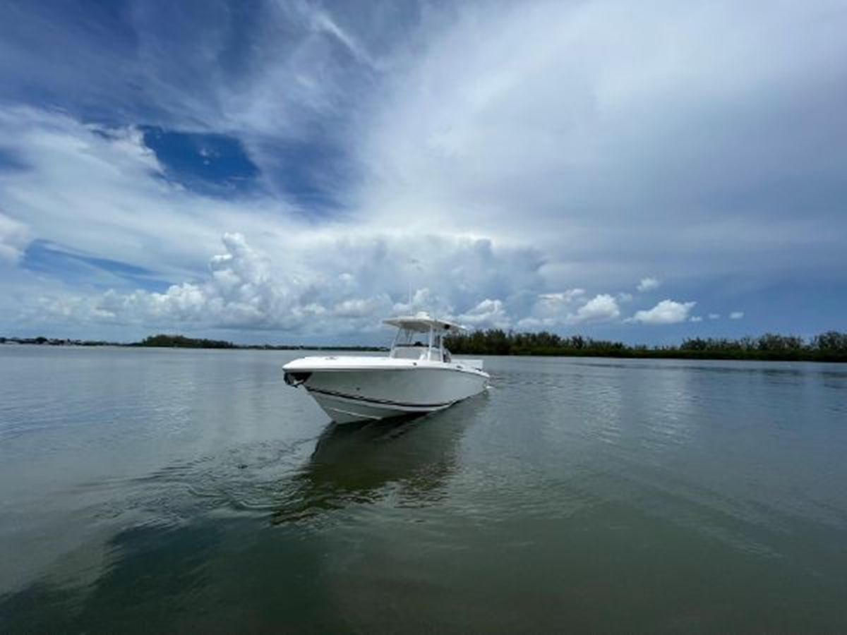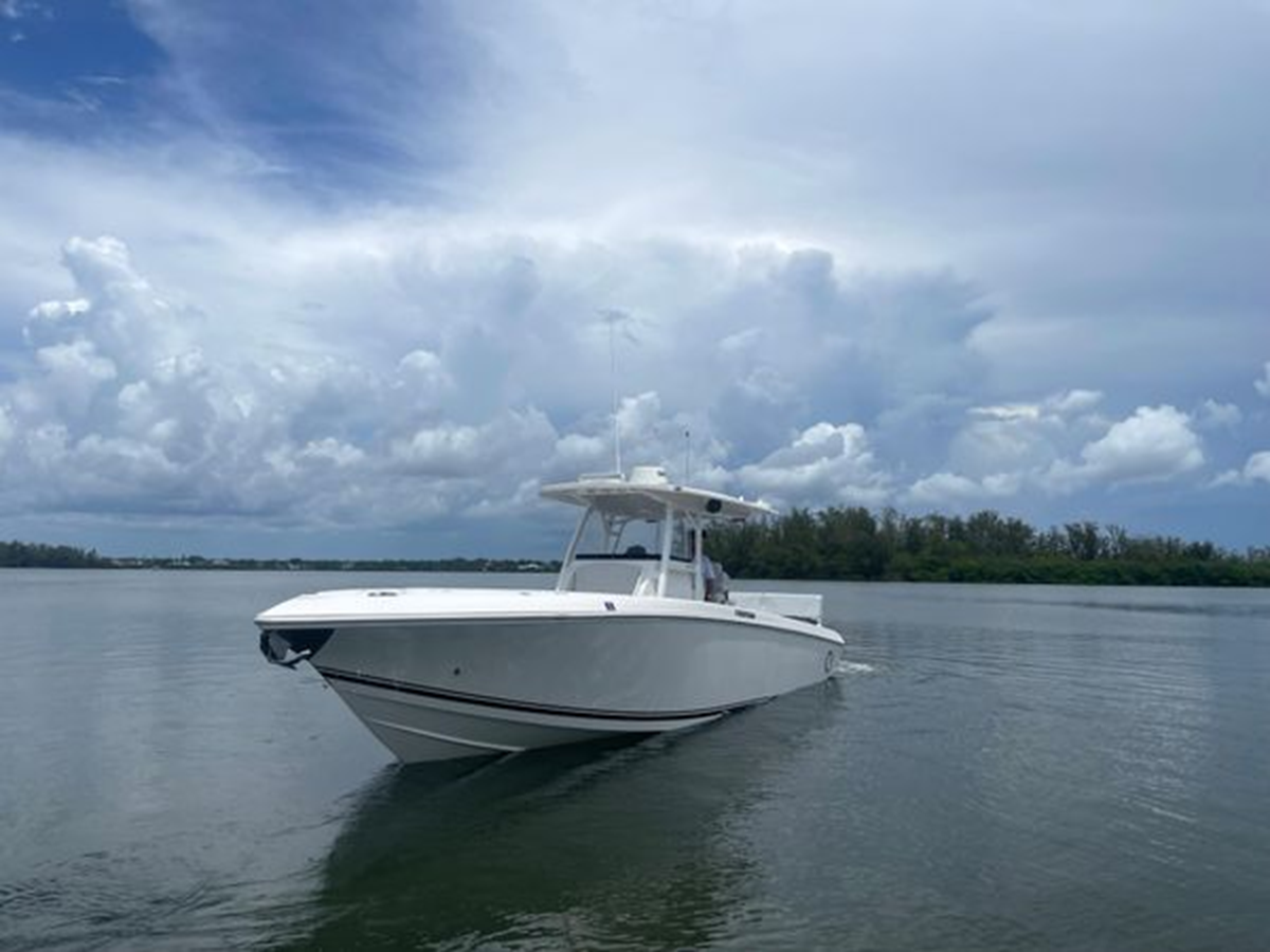 • Center Console - Pre-Wired, Fiberglass w/ Flush Mount Electronics Locker, One-Piece Plexiglass Windshield, Molded Footrest, Walk-In Head w/ VacuFlush, Shower, Sink & 25 qt Cooler Under Forward-Facing Seat