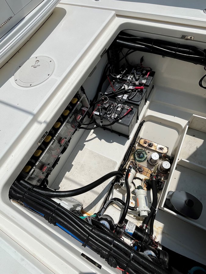 Pressurized live well (23 gal) in aft port corner with clear lid