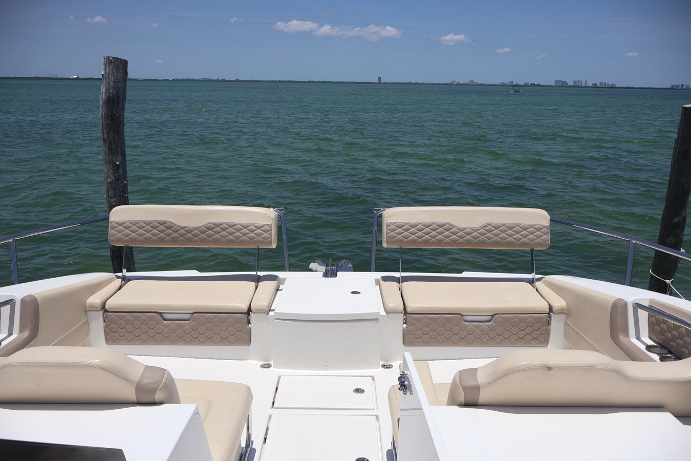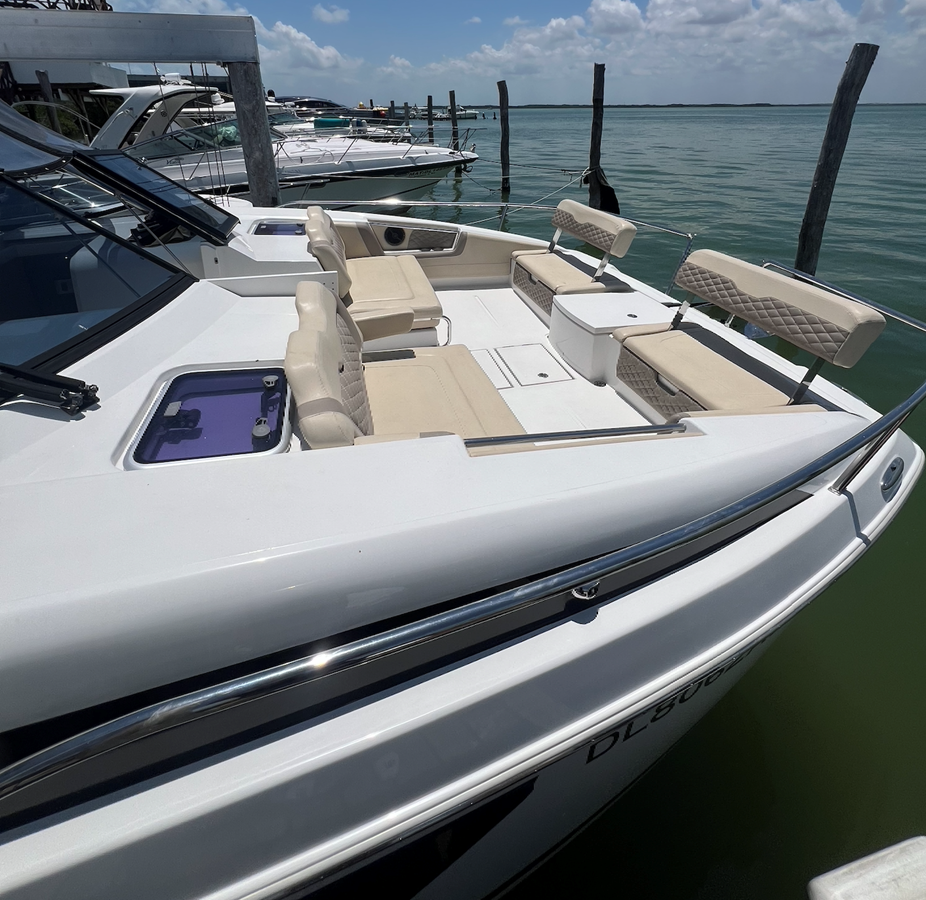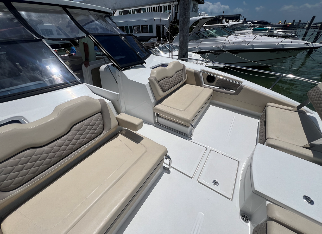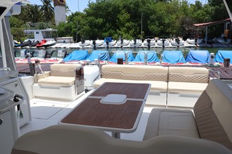 - Forward cockpit seating that comfortably seats 8, converts to two large sunbeds