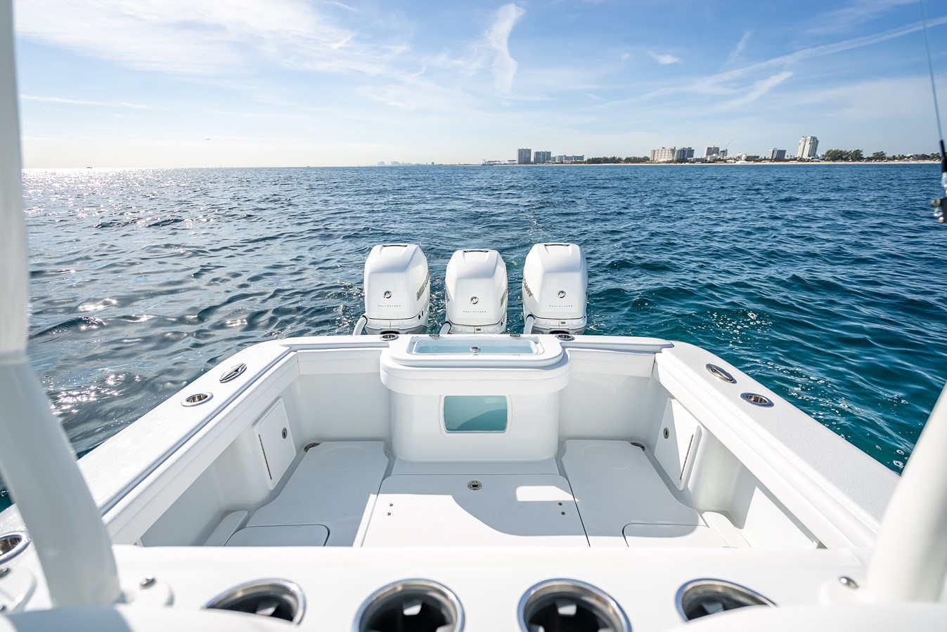 This beautiful 2-tone Ice Blue/Matterhorn White Hull 2023 36’ Yellowfin is a REAL HEAD TURNER! Loaded with $80K in options. Special features include front forward seating, coffin box with upholstered backrest, double diamond stitching package, electric Windlass and Bow Thruster. She is practically brand new with only 175 engine hours! EXTENDED WARRANTY UNTIL 2027!