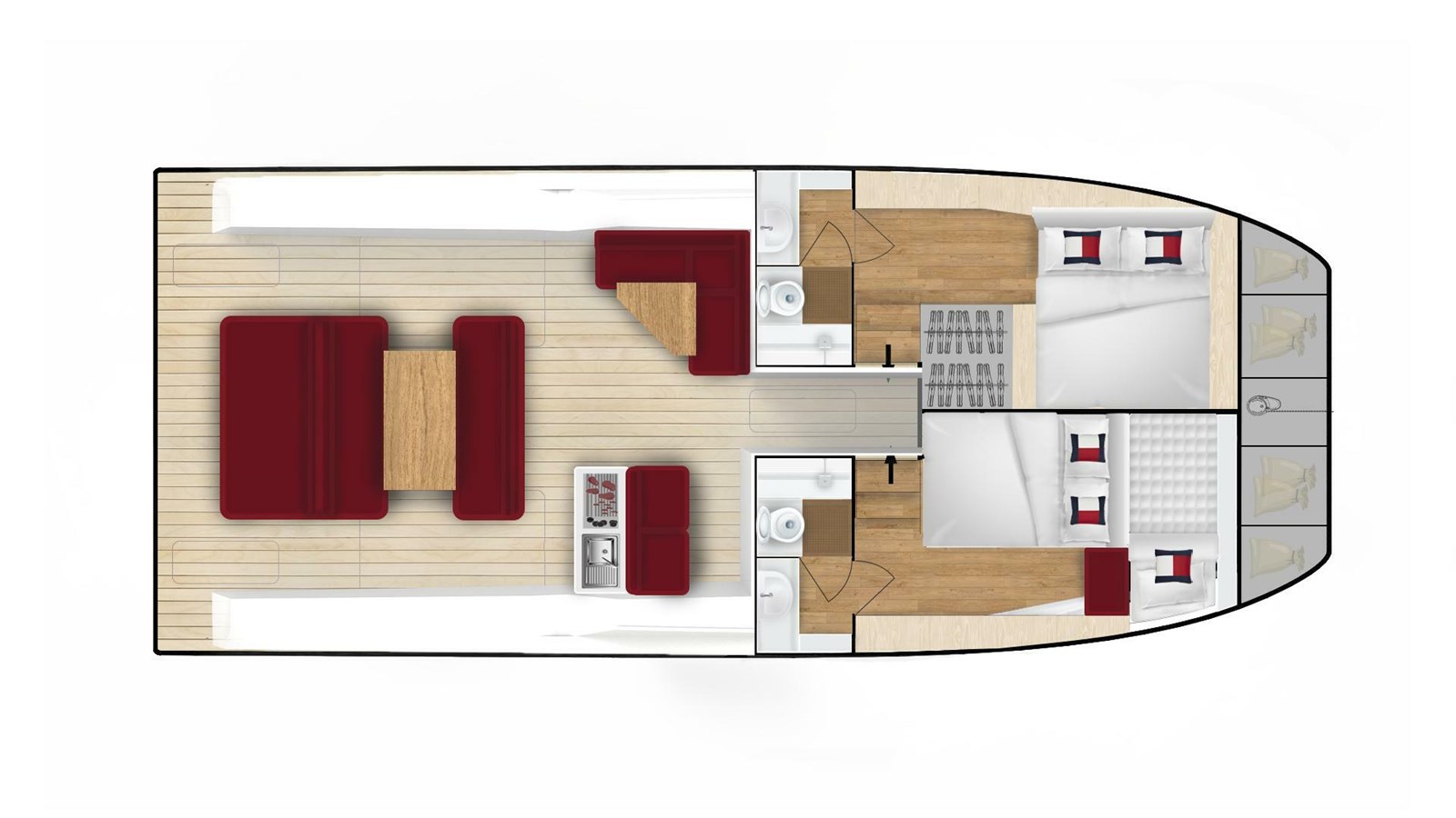 Core efficiency is provided by the asymmetric hull design, which enhances existing multihull benefits of unrivalled form stability, beam space and excellent seakeeping.