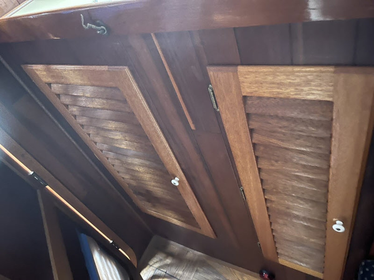 A true classic cutter, full-keel cruiser. Sails are in excellent condition, standing rigging was done in 2015, new rope for running rigging is included, she has external chainplates that look good and are original. There is room for a generator in the engine space. She has a Monitor windvane for offshore steering. The Isuzu engine runs well. There are (8) bronze portlights and a butterfly hatch for light and ventilation.