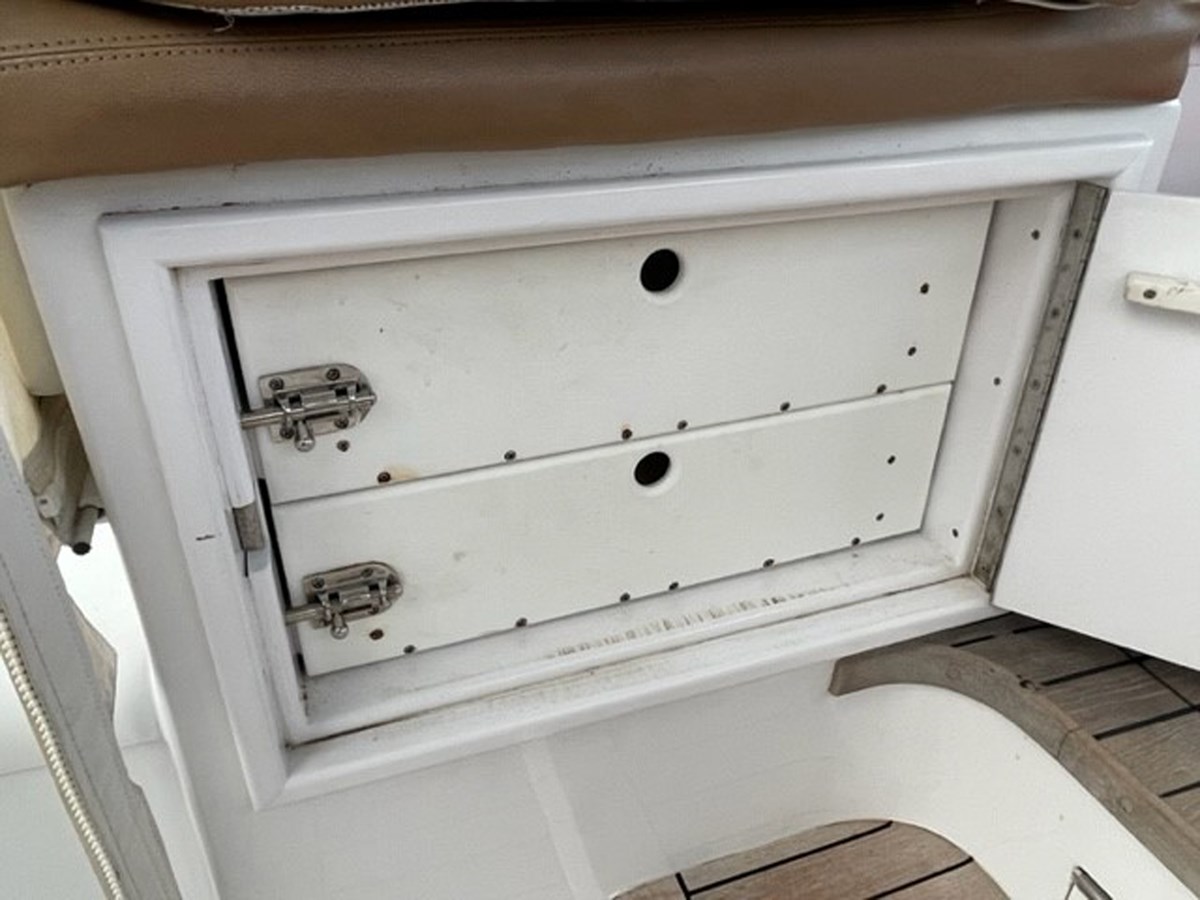Port and Starboard side forward cockpit there are two stainless lined boxes inside the cockpit consoles. Starboard side is a freezer with Sea Frost water-cooled compressor (in ER) and two Ranco digital thermostats. Port side is a drink box/bait box, or freezer. Both boxes have rubber gasket sealed lids with stainless gas spring keepers. Both boxes also have the matched saddle brown cushions for the lids.