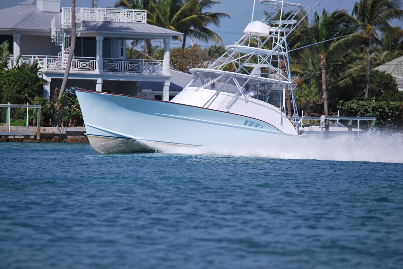 The finished project delivered a modern, stylish, and high-quality interior and bridge deck on a thoroughly refinished Classic Carolina hull. The first impression factor was raised dramatically with refinishing of the teak transom, teak coverboards (which were both new in '06), and the addition of a finely fitted and varnished teak helm pod. She also has a faux finished teak toe rail and a varnished bridge deck cap rail. Accented by varnished teak ladderback Bluewater helm and companion chairs and a Bluewater teak rocket launcher. The hull is light blue with a navy blue boot stripe and light grey bottom paint. The hull has a sharp entry forward with a subtle Carolina Flair, at her transom a notable tumblehome, and a classic broken shearline with hull side engine room vents. Decks and deckhouse are white with teak decking on the cockpit and bridge-deck soles. The finished project left the boatyard in February of 2016 and has seen very light usage since. The boat presents well and will make its next owner proud.