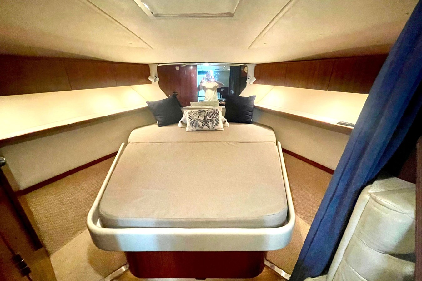 On Deck, the stepped cockpit delivers 147 square feet of entertaining or fishing space, with an extra-wide back-to-back helm seat with wet-bar and storage, and a curved companion lounge with cooler storage and aft-facing seat. Under the cockpit sole are large compartments for cruising or fishing stowage, and engine access is through either an upper cockpit drop-down hatch or a lower cockpit electric hatch lift.