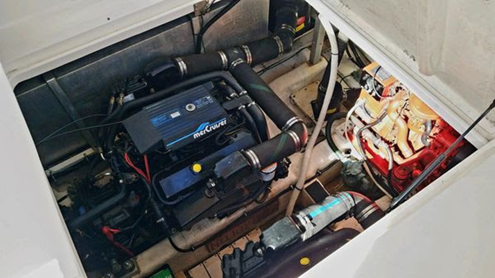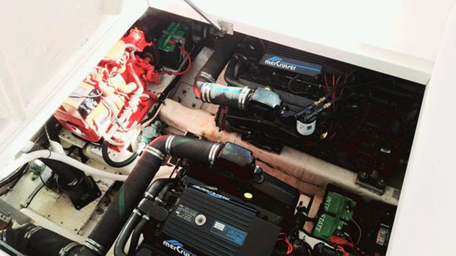 Owners just spent $7000 in engine maintenance, manifolds, stainless risers, and new water pumps! The engines have new MerCruiser manifolds and stainless steel risers.The Twin 454 MerCruisers were previously rebuilt, with approximately 200+ hours, and will cruise at 18-20 to top at about high 20's.. Hurth V-Drives also rebuilt with approximately 200+ hours. This boat is built with a conventional modified-V hull with a solid fiberglass bottom, an integral swim platform, and prop pockets to reduce the shaft angle.