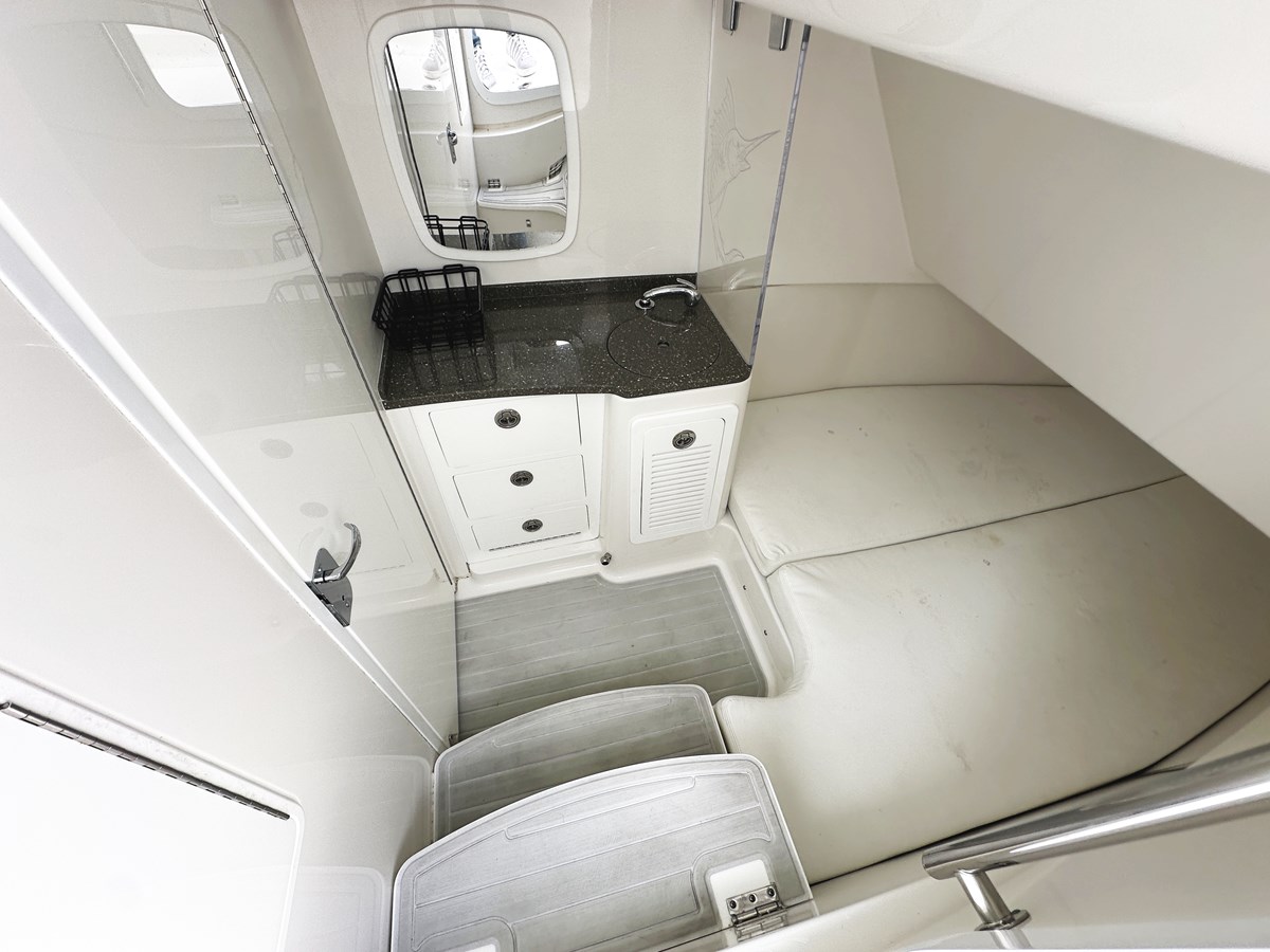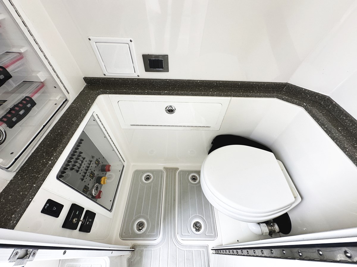 Powered by Triple Yamaha F35’s, TRIPLE J is rated at a top speed of 58mph @6000 RPM’s. The huge helm accommodates a 16” and two 12” Garmin MFD’s, Fusion stereo system, bow thruster, cup holders and a full instrumentation panel. With room for three at the helm, you’ll keep dry and protected under the extra-large hardtop and curved windshield. The contoured seating throughout will help to keep you from sliding when the Speciale accelerates or turn on a dime. The forward area features multiple chaise lounges and in the aft cockpit another lounge behind the helm seats can accommodate up to three. Below you’ll find a double berth, sink, storage, and a private head.
