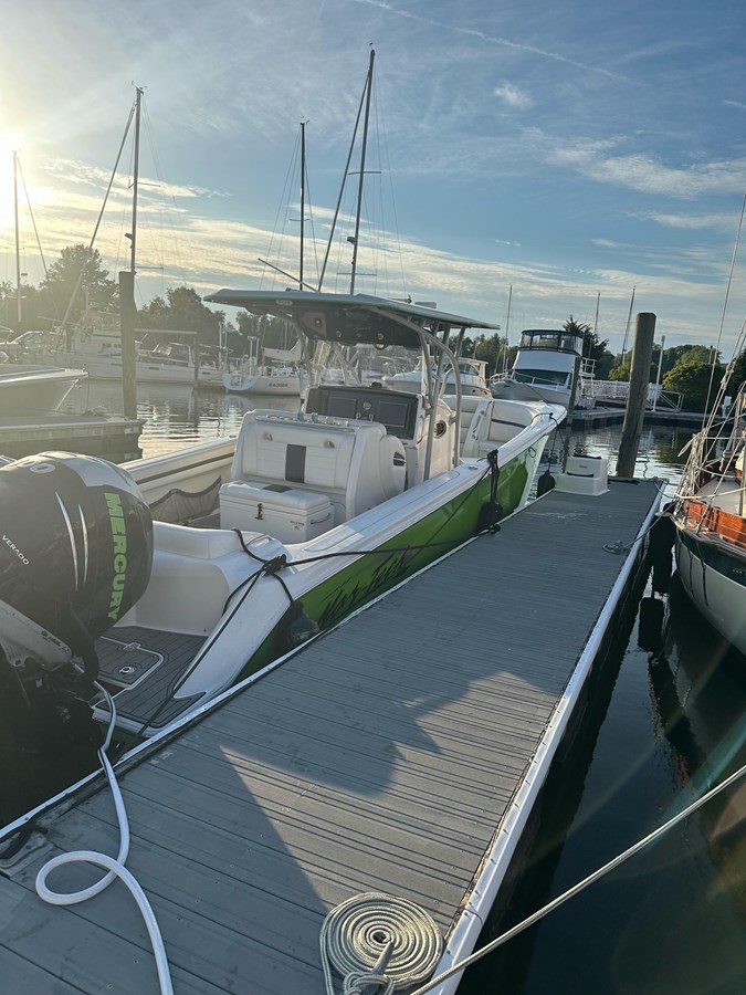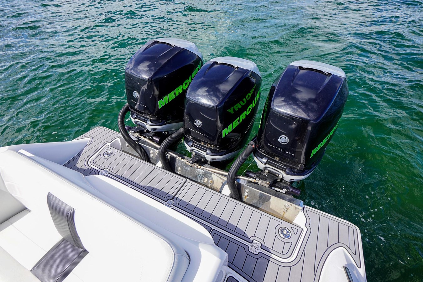 Updated Mercury DTS helm controls, Freshly wrapped green for the entire hull as well as new bottotm paint. Brand new SeaDek, 2x Garmin 7212's, Garmin VHF, Clarion radio w/ JL sound system, Vetus bow thruster, Remote searchlight, Frigid Rigid cooler in rear, trim tabs, underwater lights, bottom paint, color matching Mercury Decal kit.