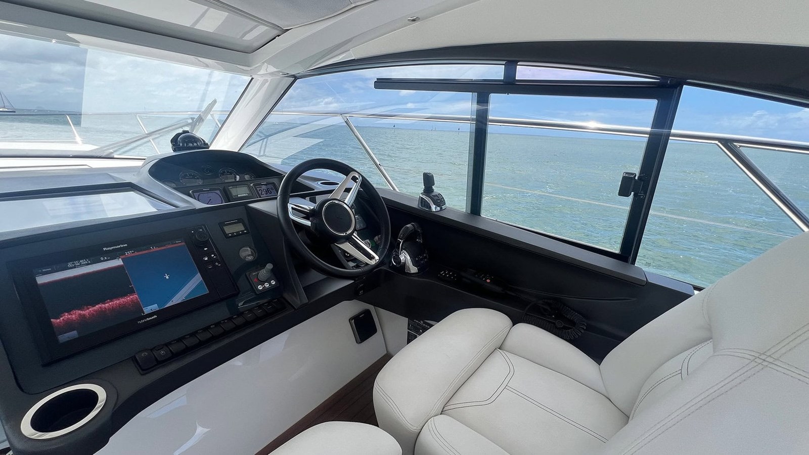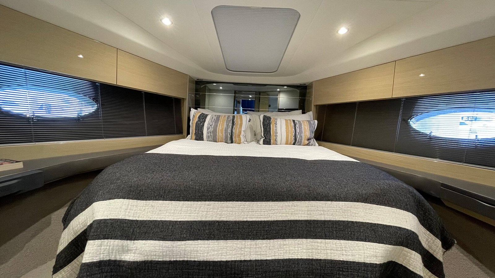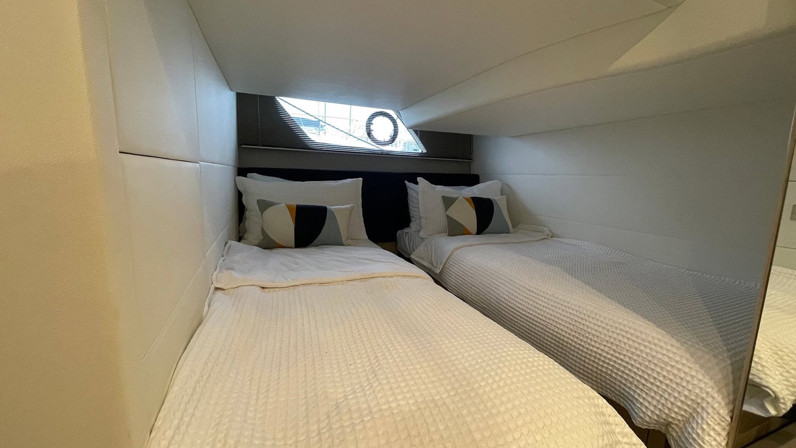 Below deck, the craftsmanship and quality continue. The galley is presented with natural light, featuring spacious storage and premium finishes that make extended stays a pleasure. The master cabin offers generous headroom, elegant styling, and a serene atmosphere, while the aft cabin features factory-specified sliding berths, allowing for flexible sleeping arrangements — either twin singles or a comfortable double bed. Every element, from the handcrafted cabinetry to the hand-stitched detailing, reflects the meticulous build quality that Princess Yachts are renowned for.