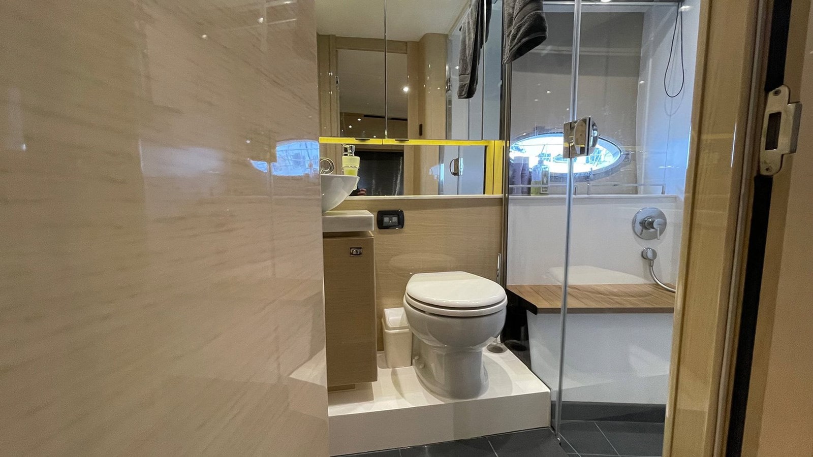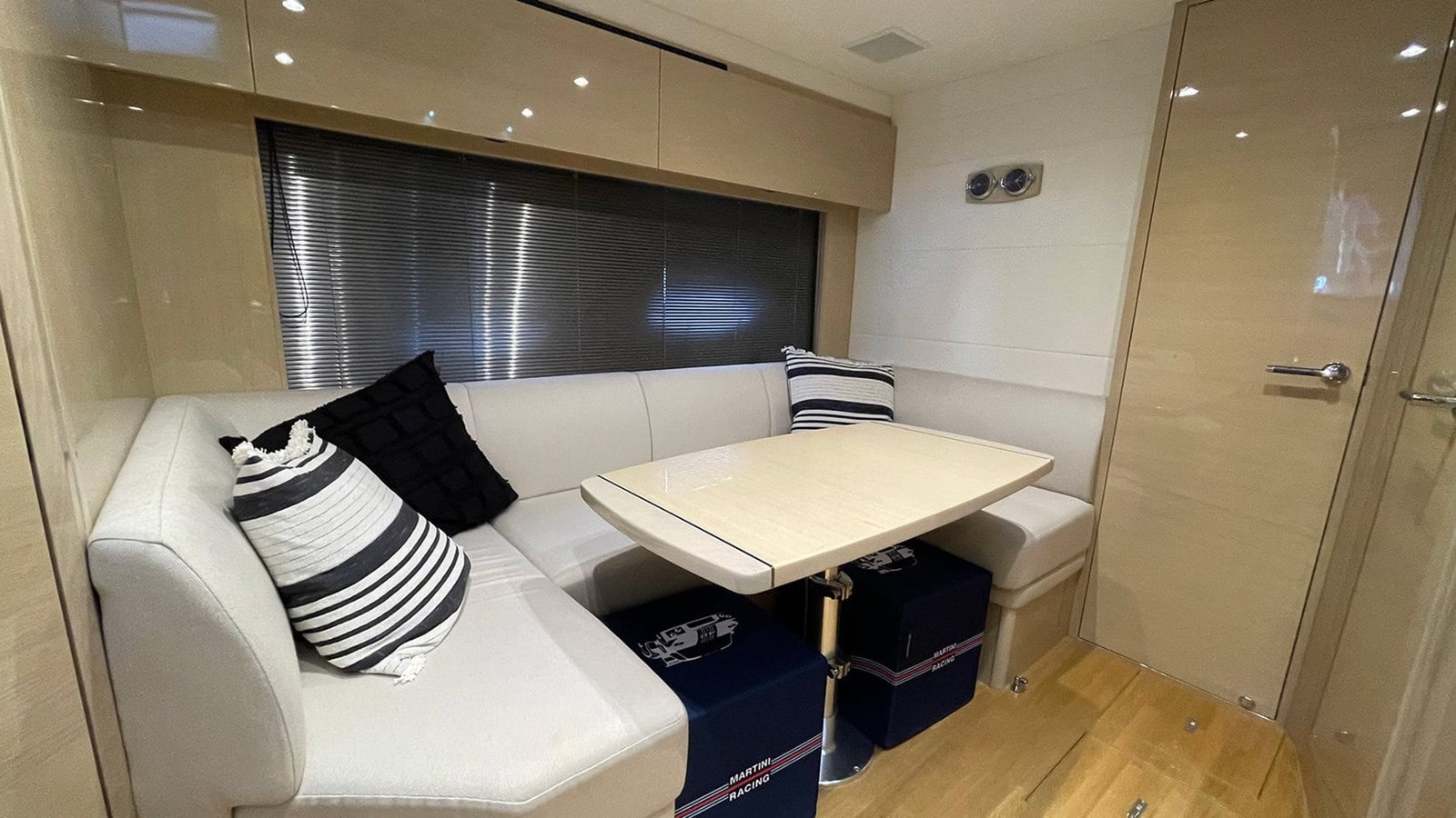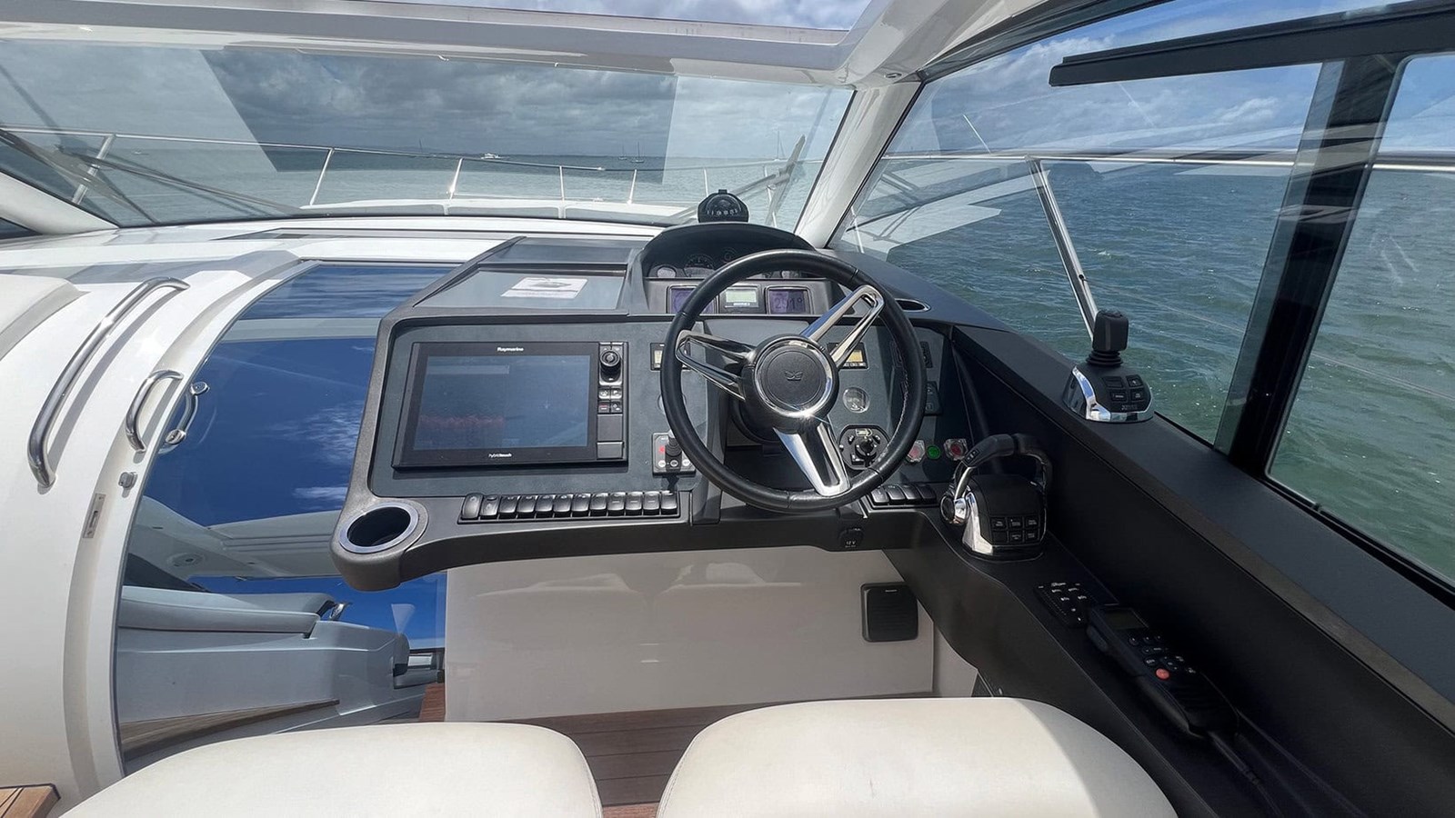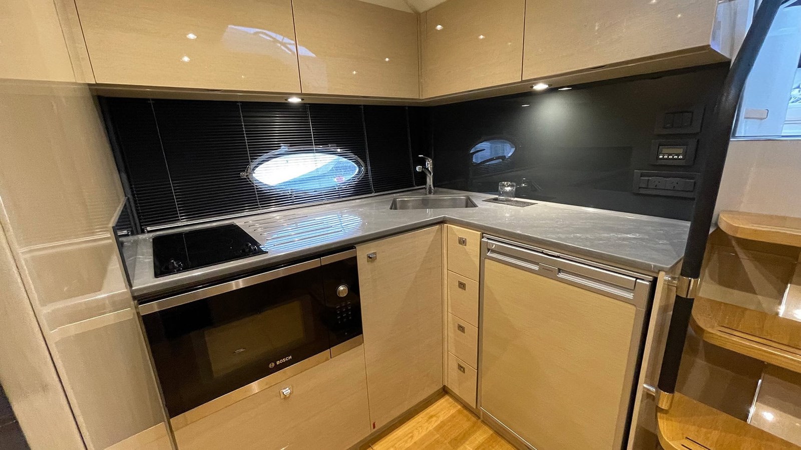 Below deck, the craftsmanship and quality continue. The galley is presented with natural light, featuring spacious storage and premium finishes that make extended stays a pleasure. The master cabin offers generous headroom, elegant styling, and a serene atmosphere, while the aft cabin features factory-specified sliding berths, allowing for flexible sleeping arrangements — either twin singles or a comfortable double bed. Every element, from the handcrafted cabinetry to the hand-stitched detailing, reflects the meticulous build quality that Princess Yachts are renowned for.